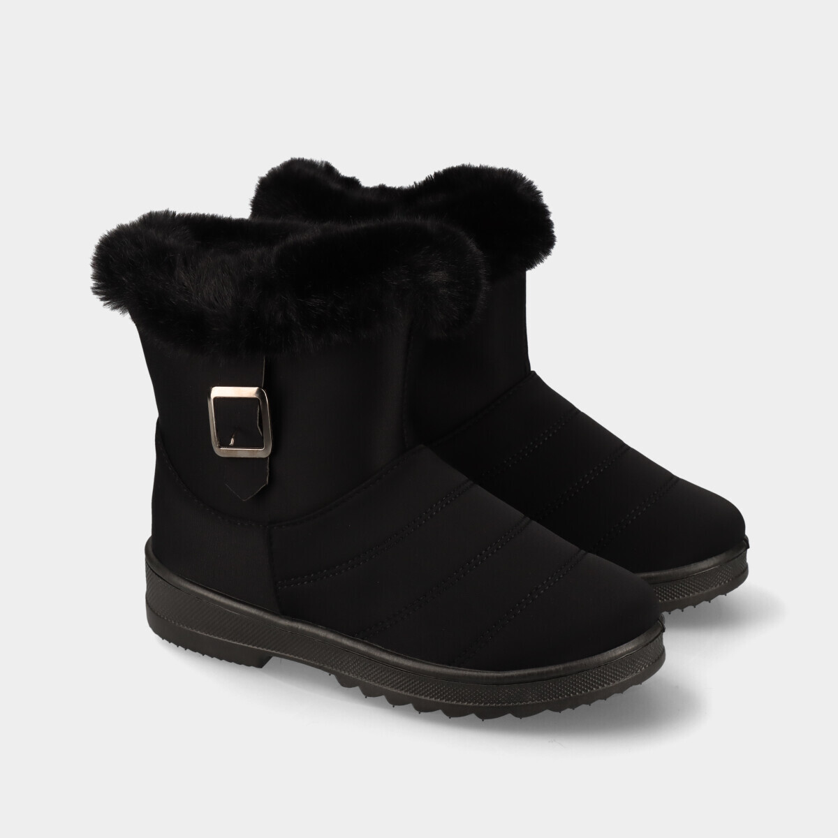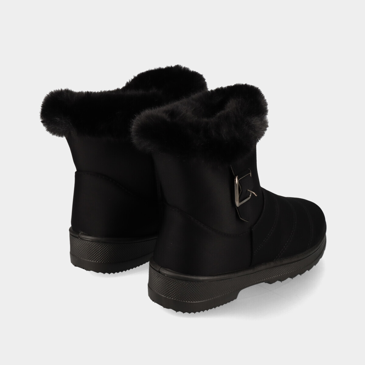 Botins de conforto para mulher, em preto, com forro e gola quentes, fecho lateral e aplicação decorativa. Ideais para uso diário.