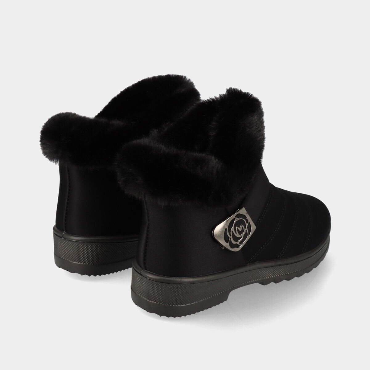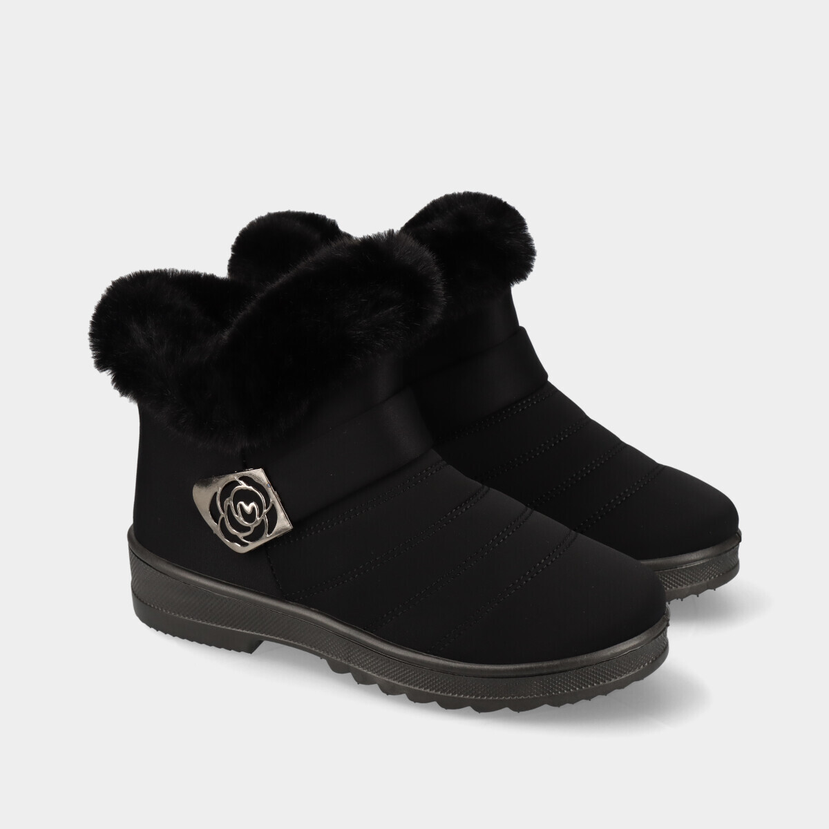 Botins de conforto para mulher, em preto, com forro e gola quentes, fecho lateral e aplicação decorativa. Ideais para uso diário.