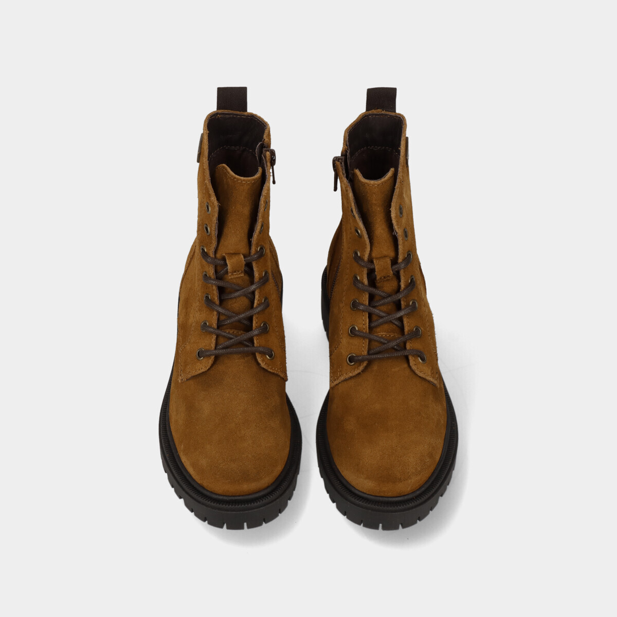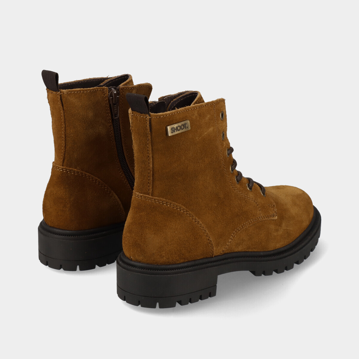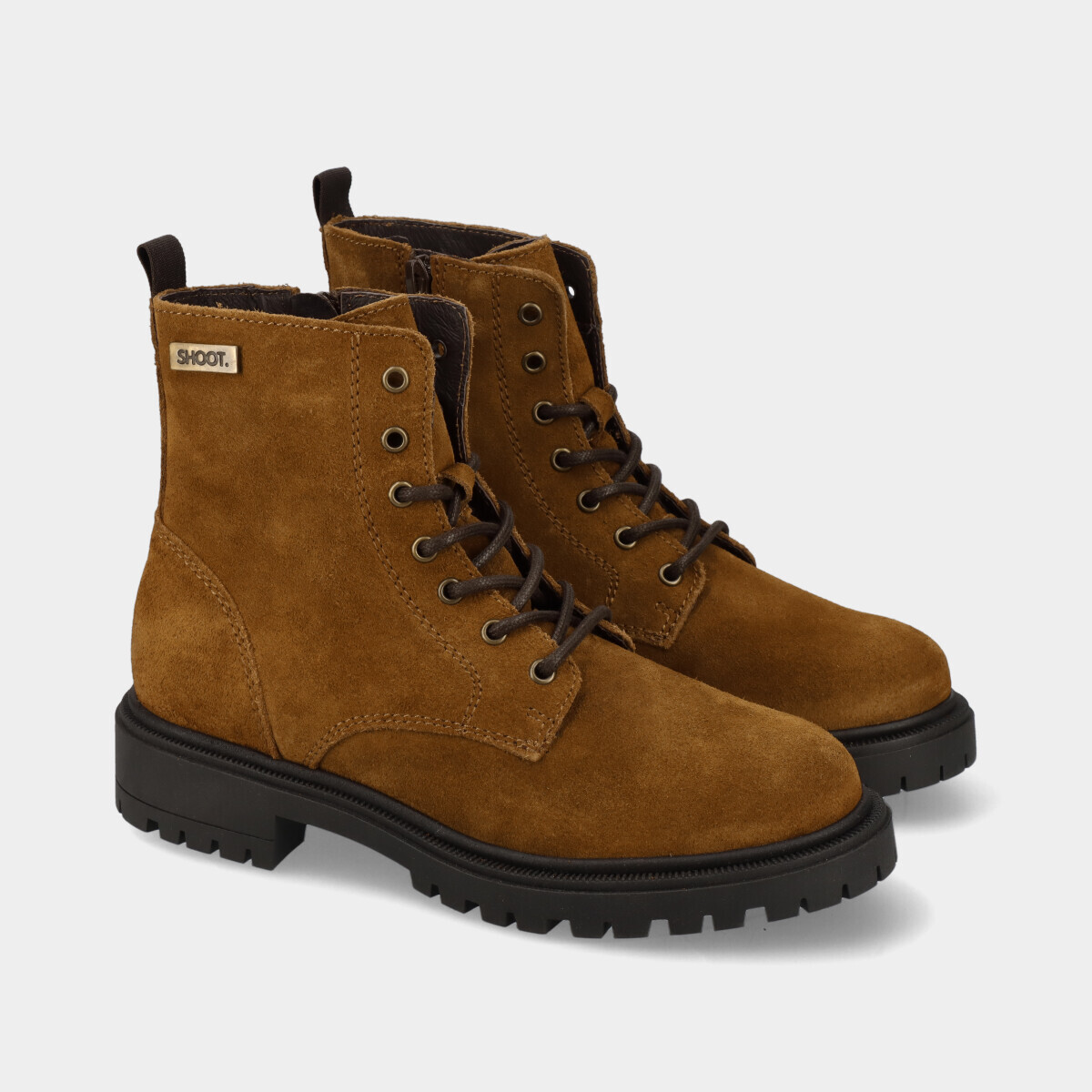 Botins em pele camel para mulher, com palmilha confortável, sola de borracha robusta, atacadores e fecho. Práticos e de qualidade nacional, ideais para o dia a dia.