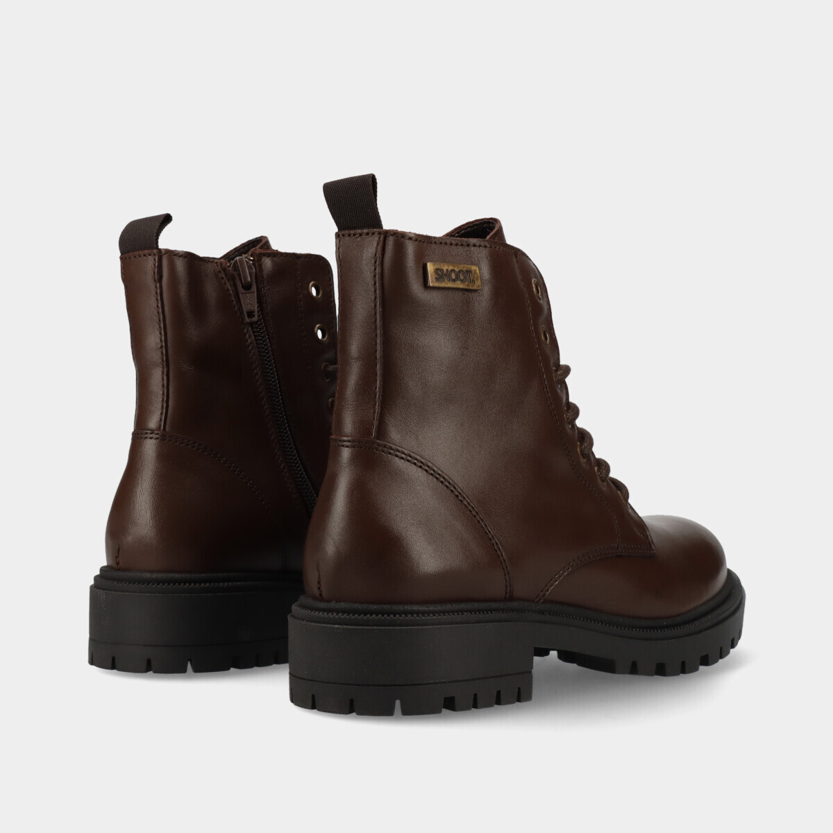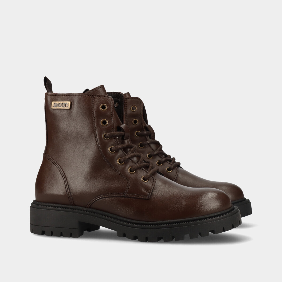 Botins estilo militar em pele castanha para mulher, com forro confortável, sola de borracha robusta, atacadores e fecho. Práticos e de qualidade nacional, ideais para o dia a dia.