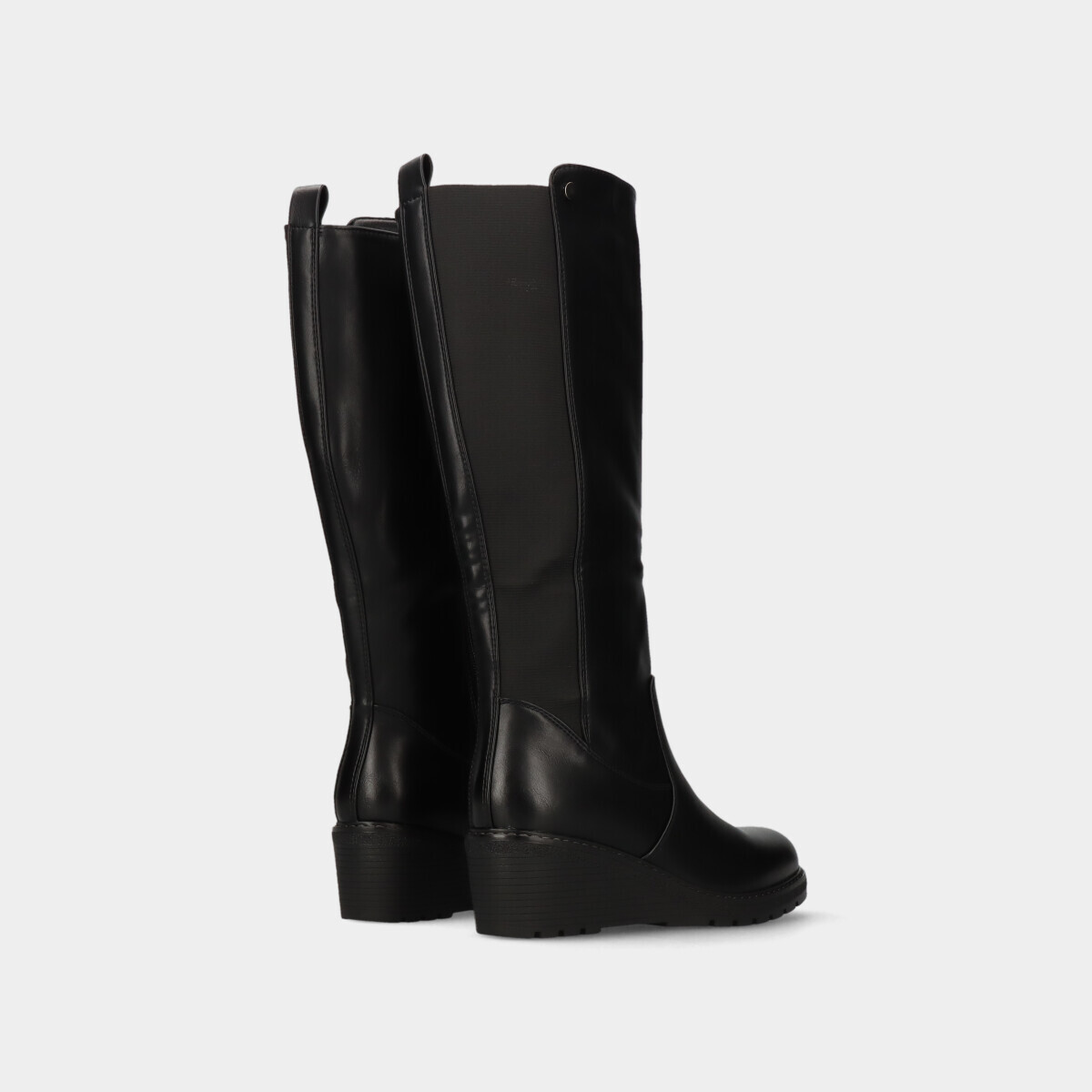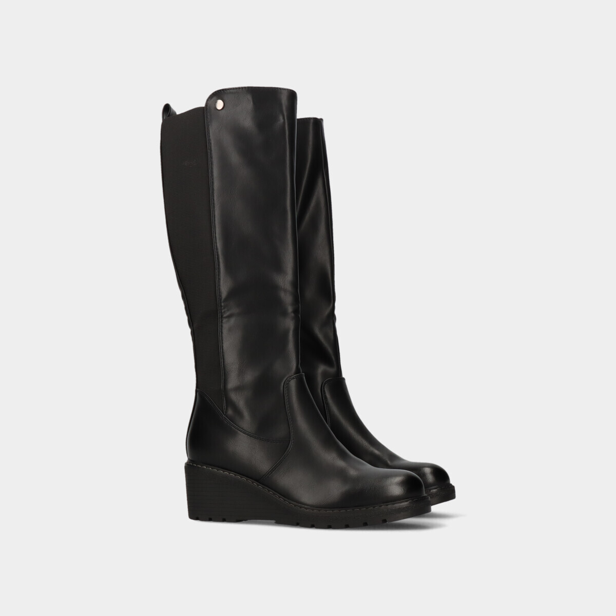 Botas para mulher em preto com frente redonda. Fecho lateral e elástico que facilita o calçar e tacão em cunha para maior conforto.