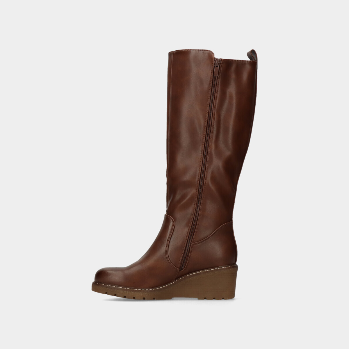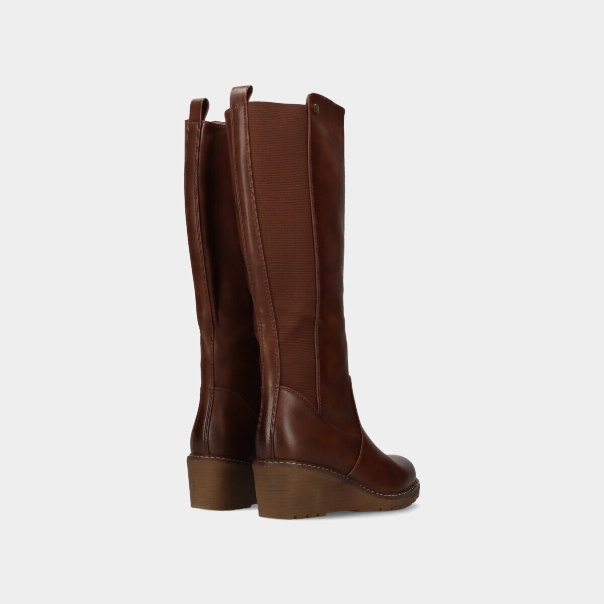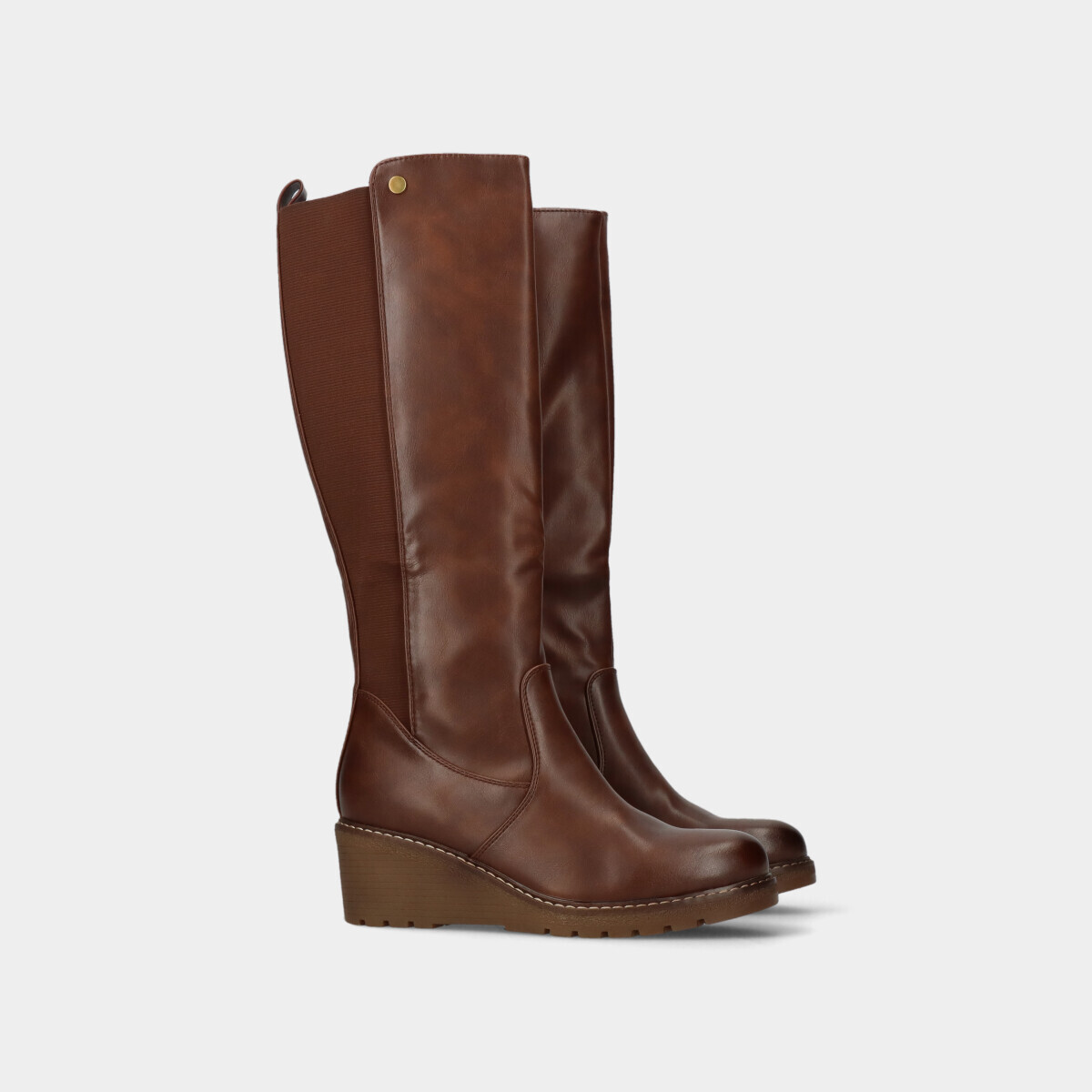 Botas para mulher em castanho com frente redonda. Fecho lateral e elástico que facilita o calçar e tacão em cunha para maior conforto.