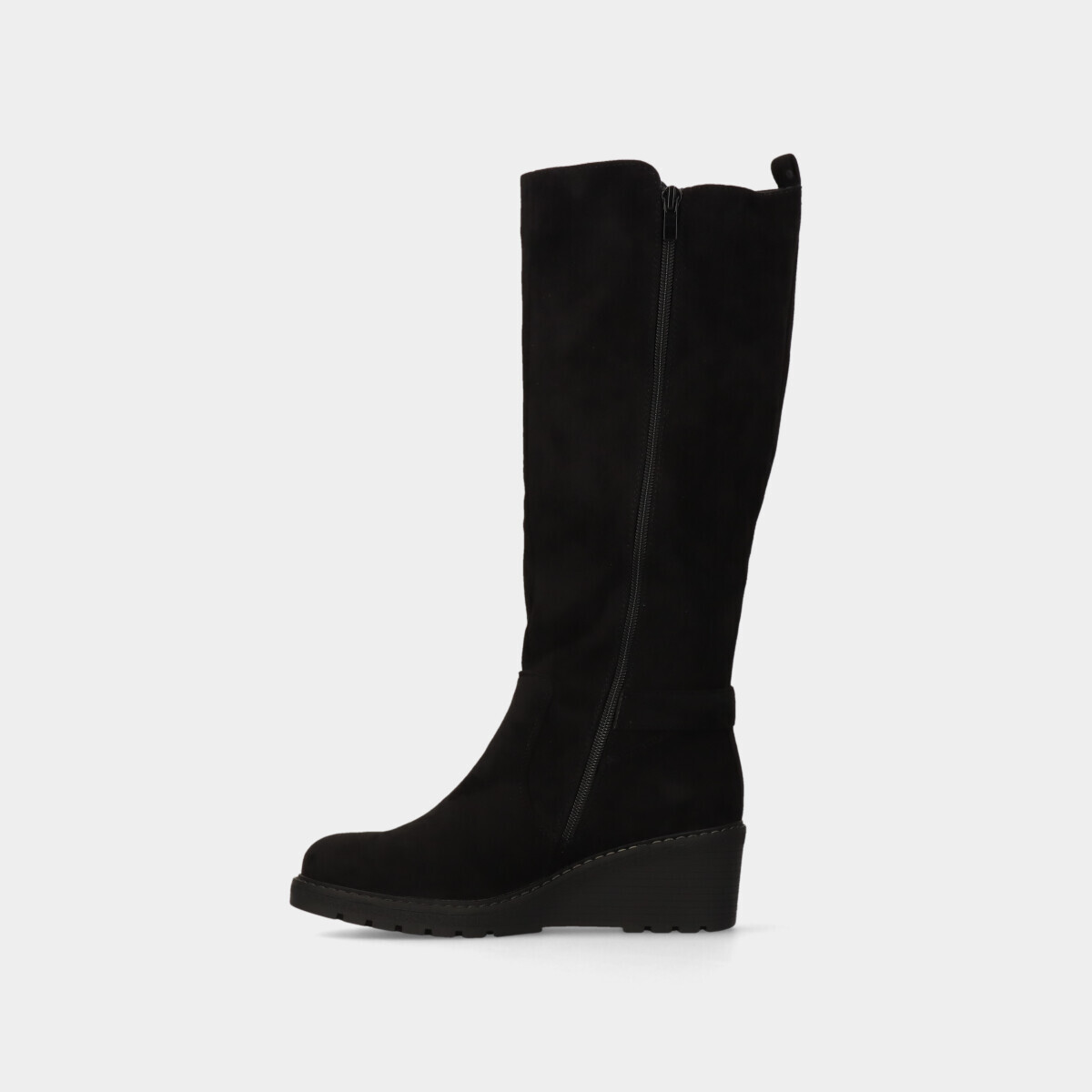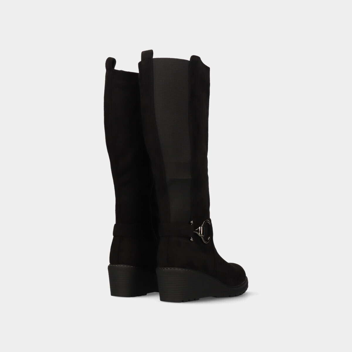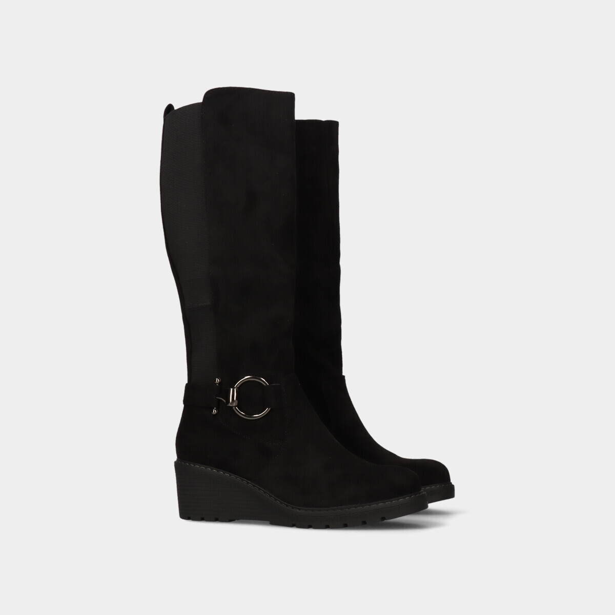 Botas para mulher em preto com frente redonda. Fecho lateral e elástico que facilita o calçar e tacão em cunha para maior conforto.