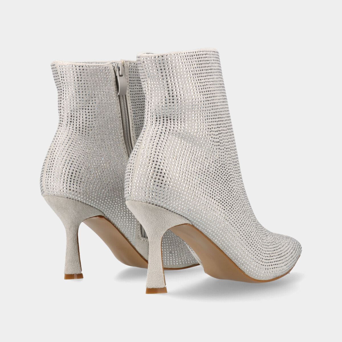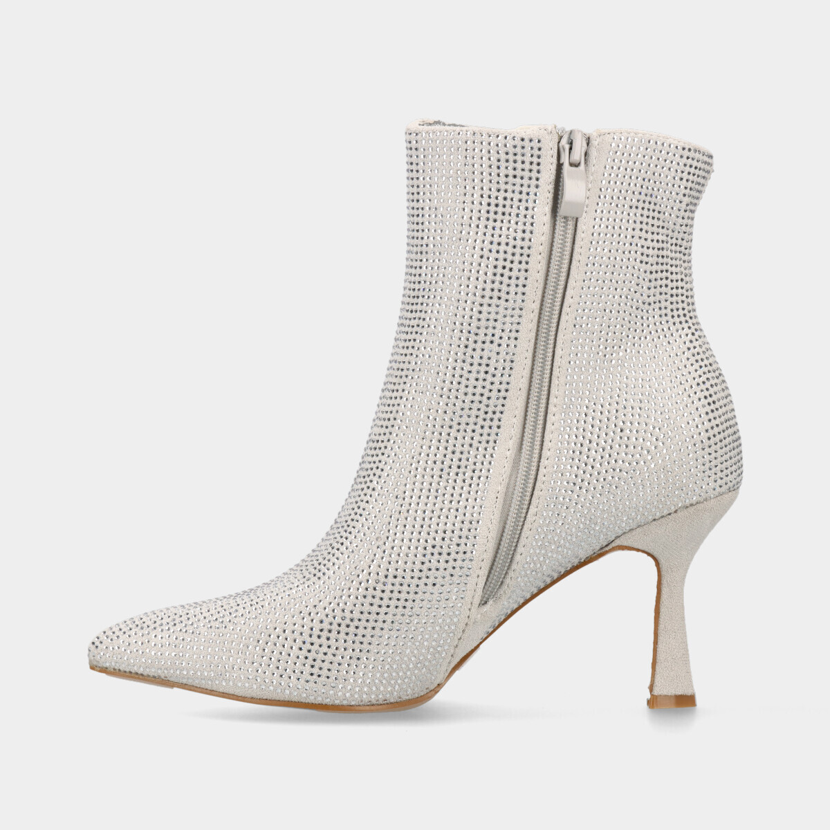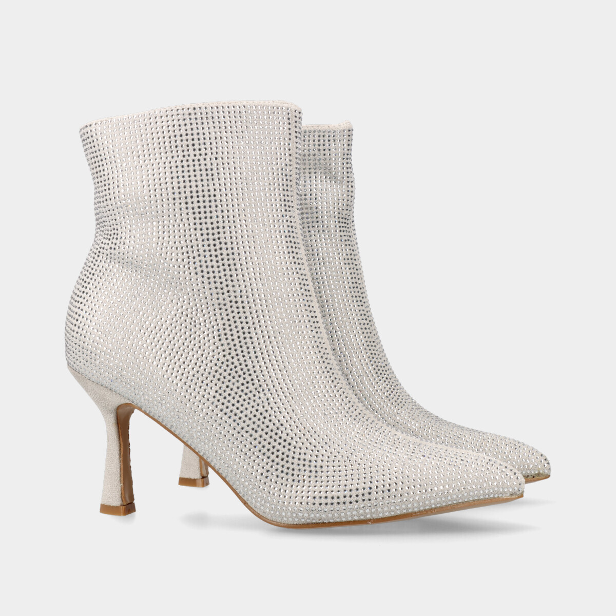 Botim de salto para mulher em prateado, repleto de pedras brilhantes, com fecho prático na lateral.
