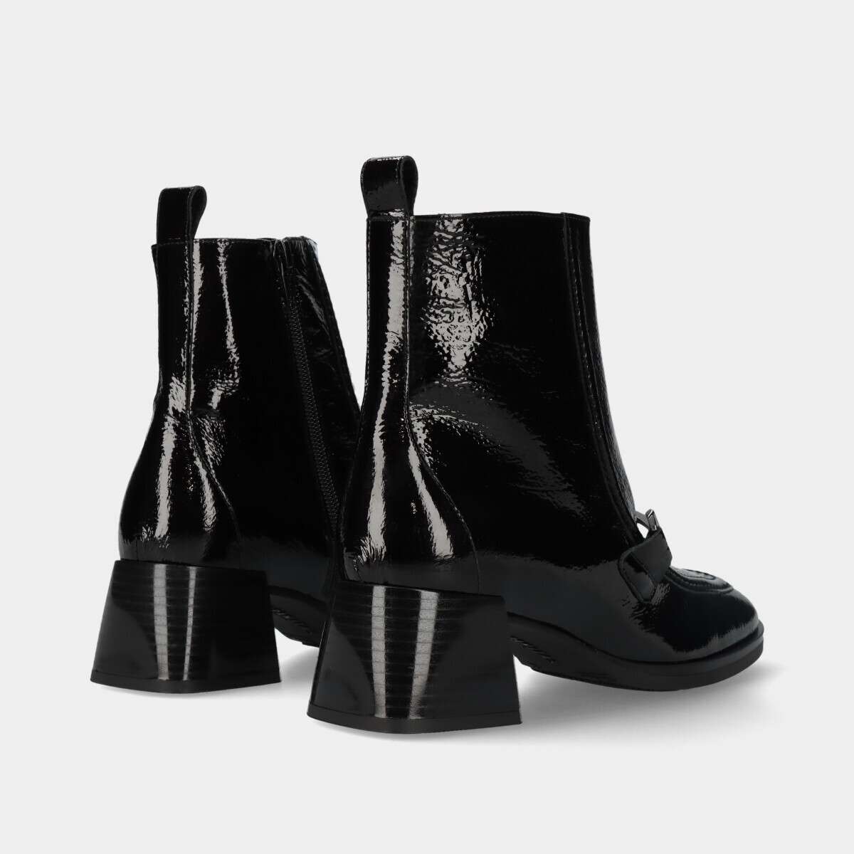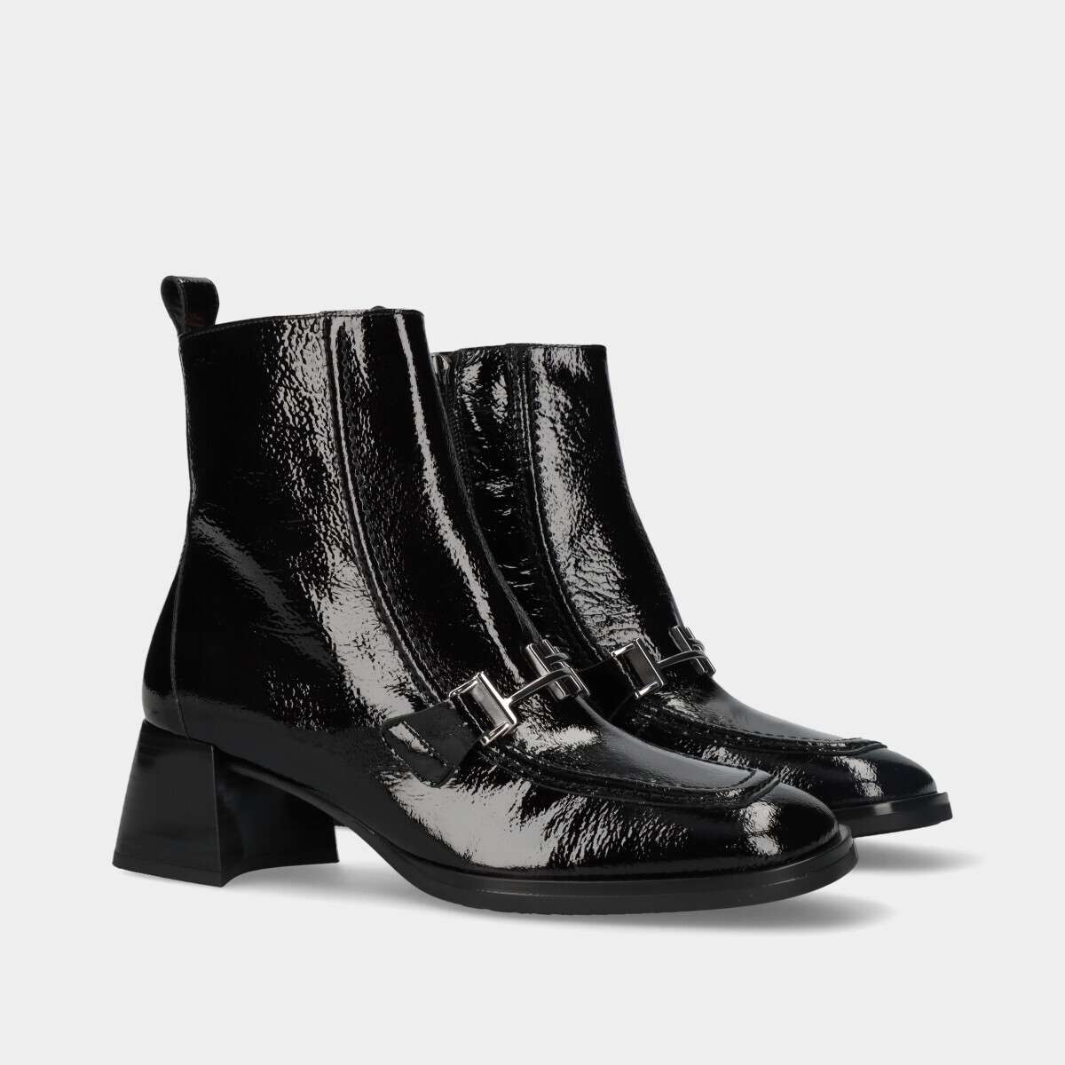 Botins estilo mocassim em preto com salto bloco e ornamento de corrente com isótipo de duplo “H” no peito do pé. Estes botins contam com a tecnologia TRIFLOW que amortece cada passo, proporcionando flexibilidade e conforto no caminhar.