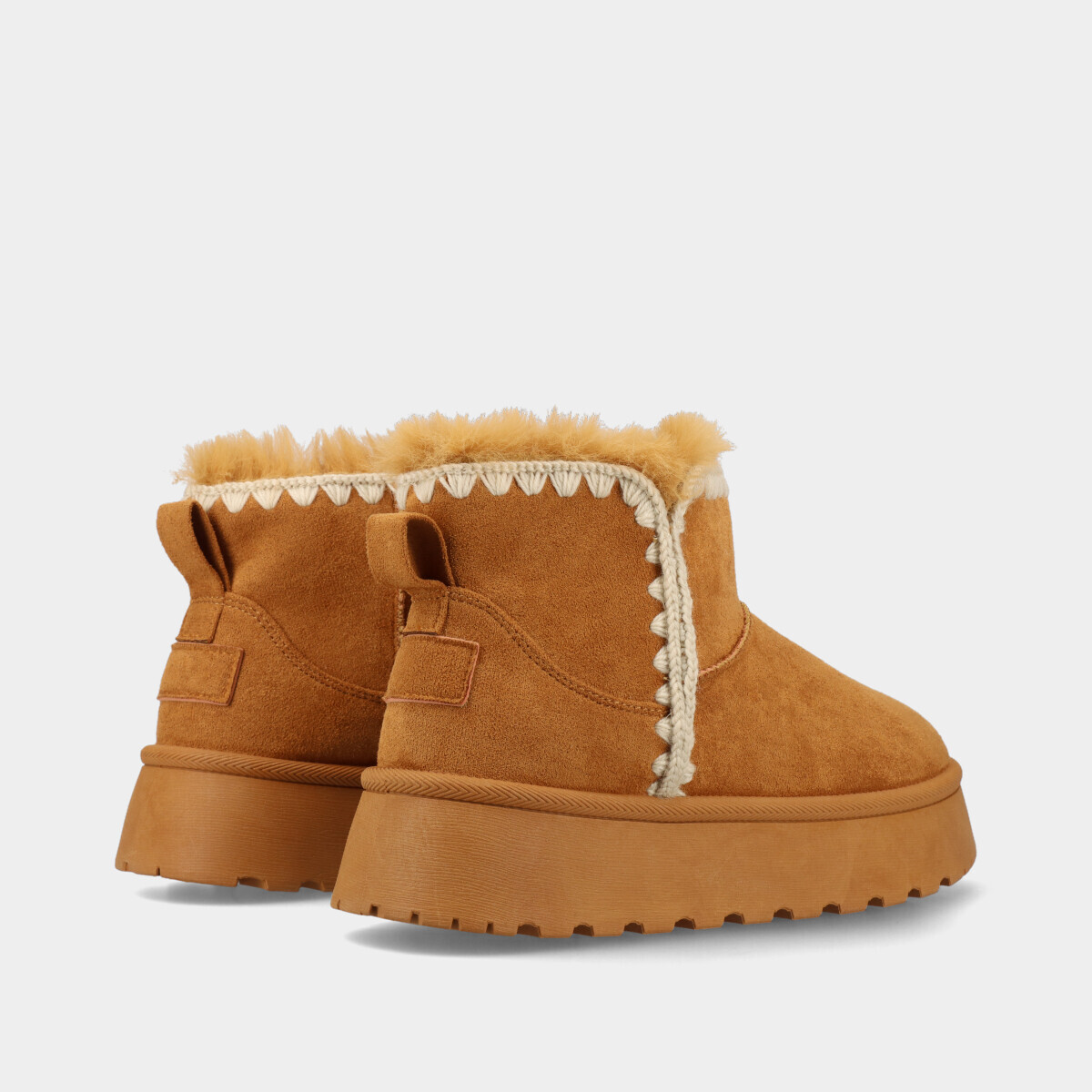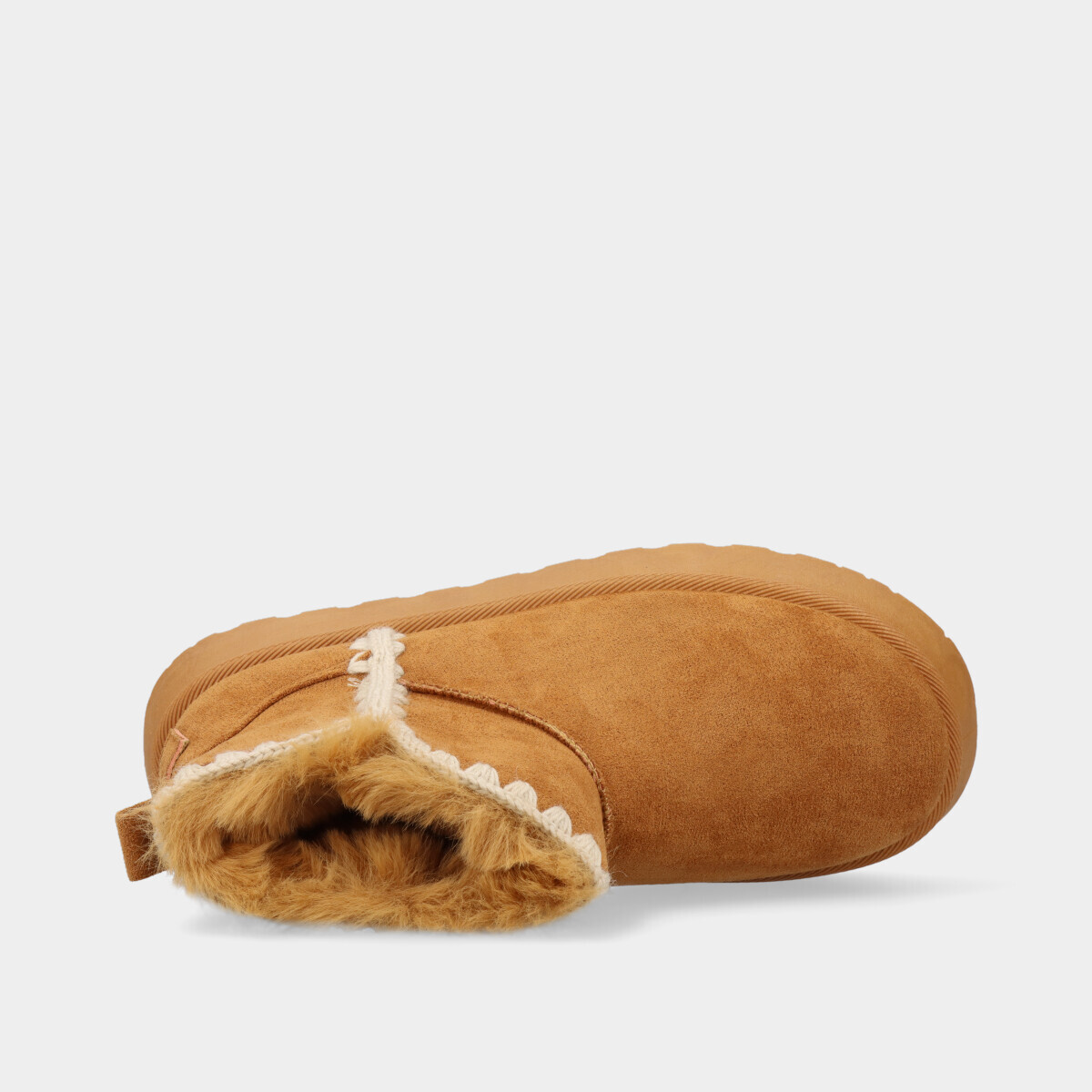 Botim de plataforma em camel, com 4 cm de altura, interior em pelo quente e detalhe em croché, perfeito para um look de inverno moderno.