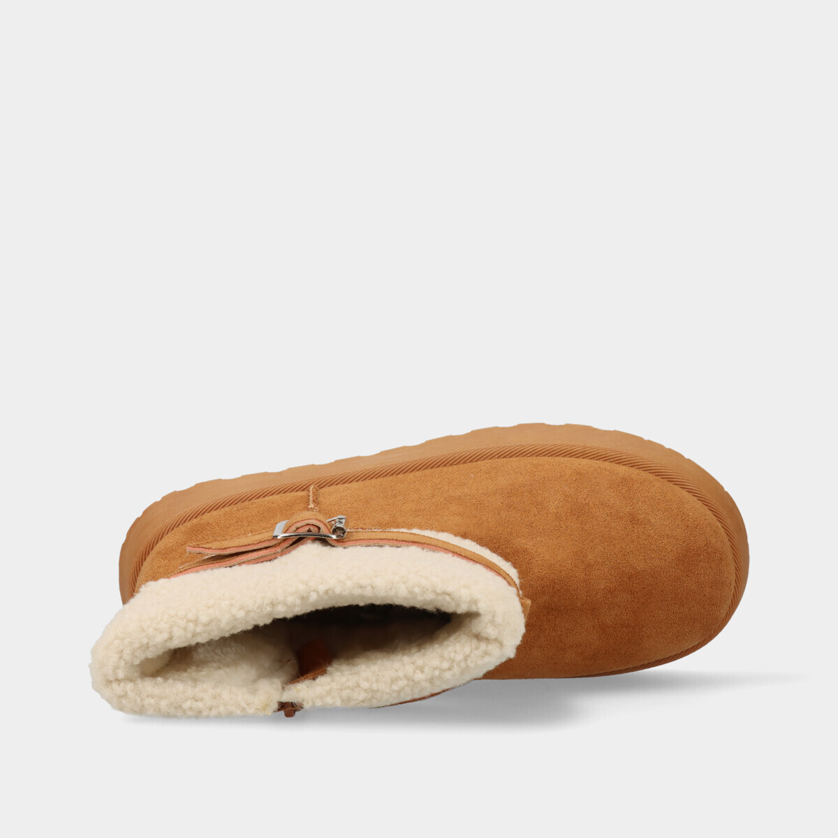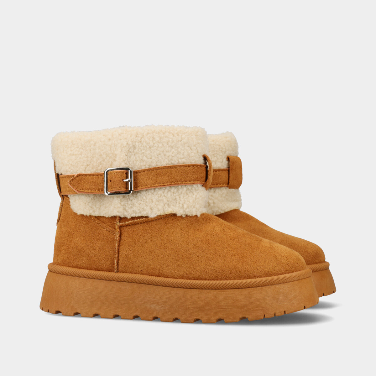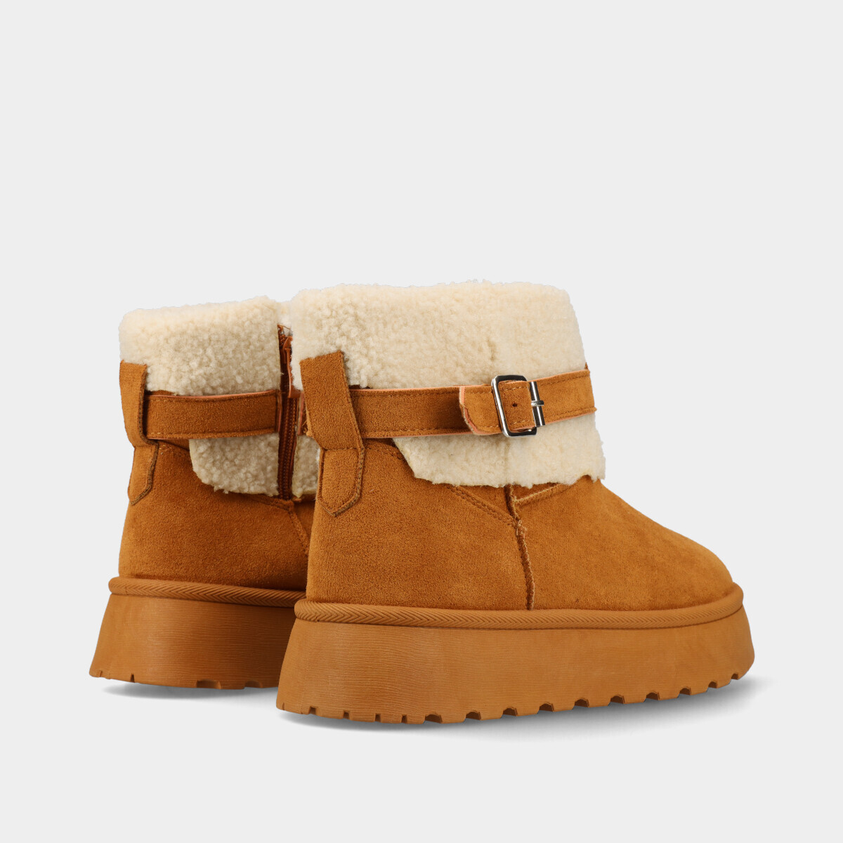 Botim de plataforma em camel, com 4 cm de altura, interior em pelo quente, biqueira redonda, gola de pelo, fivela e fecho lateral. Perfeito para um look de inverno moderno e aconchegante.