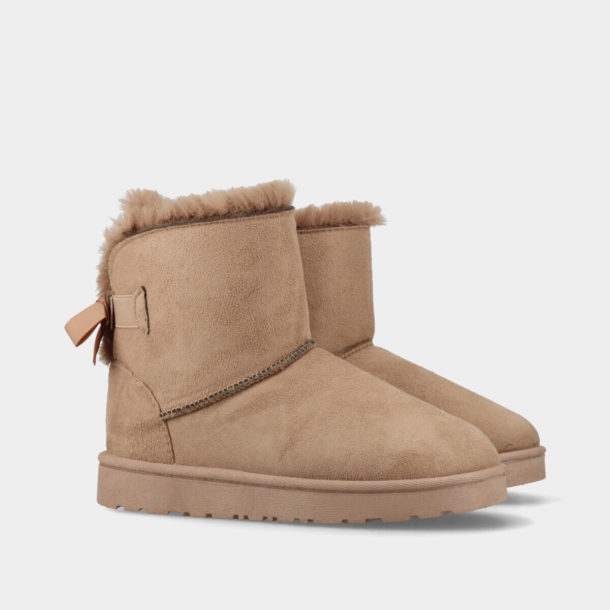 Botim em taupe para mulher, com interior em pelo quente, sola flexível, elástico e laço traseiro. Perfeito para um look de inverno confortável.