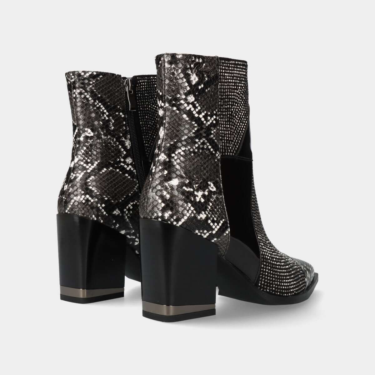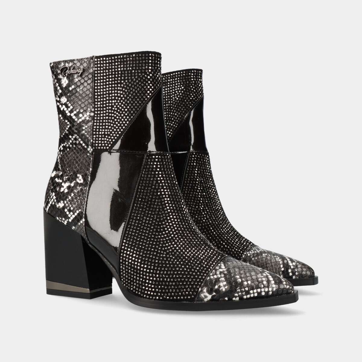 Botas texanas pretas, com detalhes em padrão animal, glitter e efeito verniz, salto largo e fecho lateral.