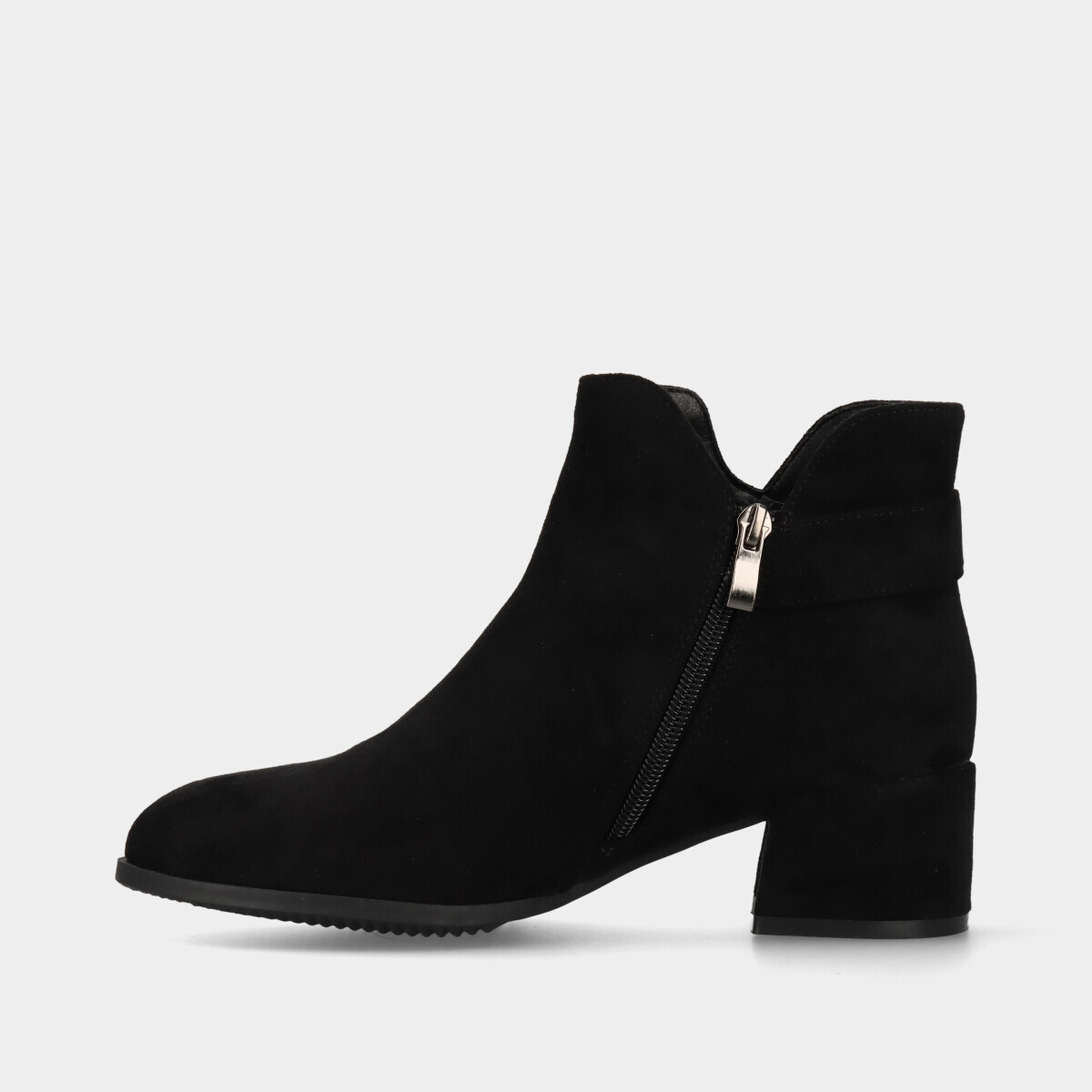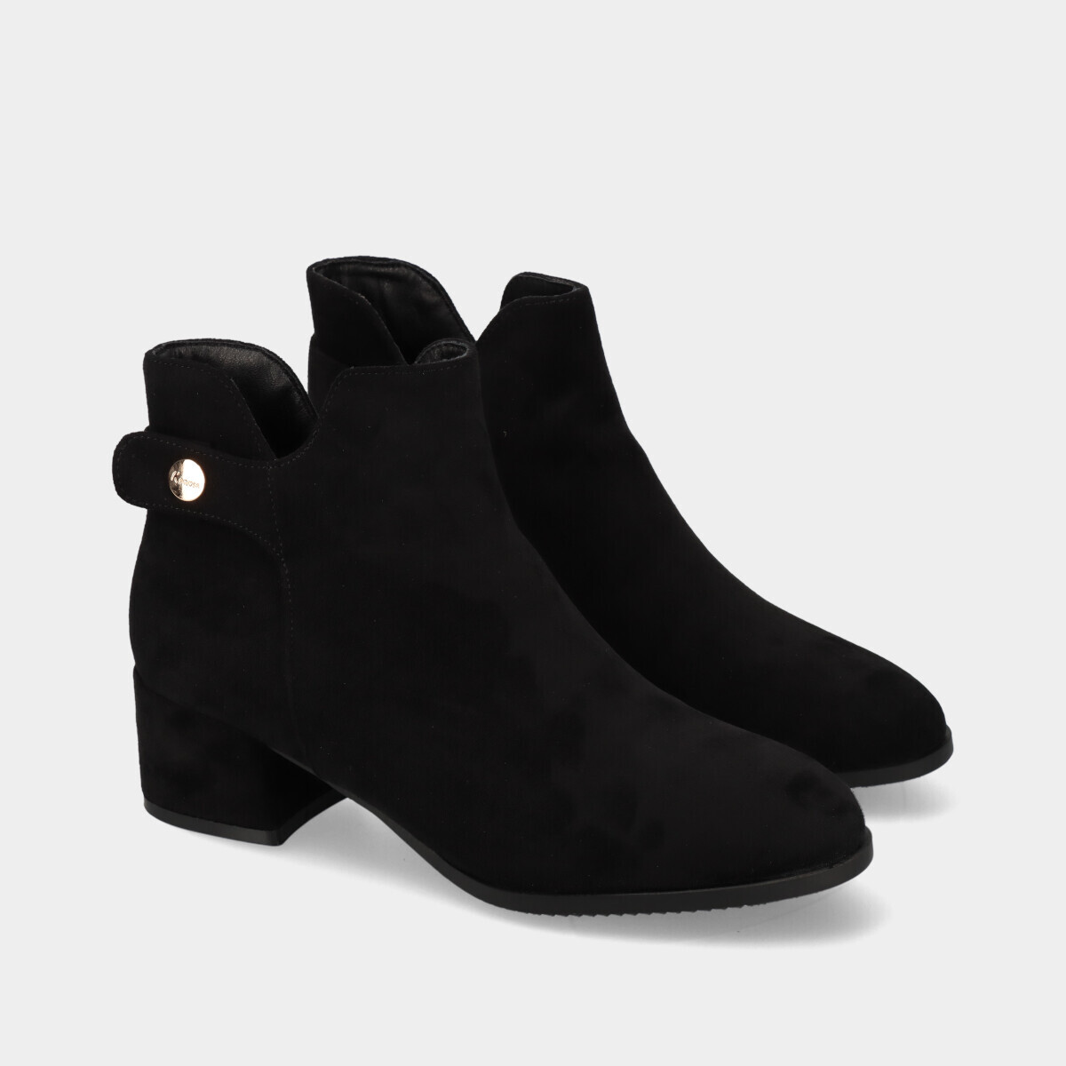 Botim de salto baixo para mulher, em preto com efeito camurça, detalhe dourado, palmilha acolchoada, fecho lateral que facilita o calçar e tacão largo para maior conforto.