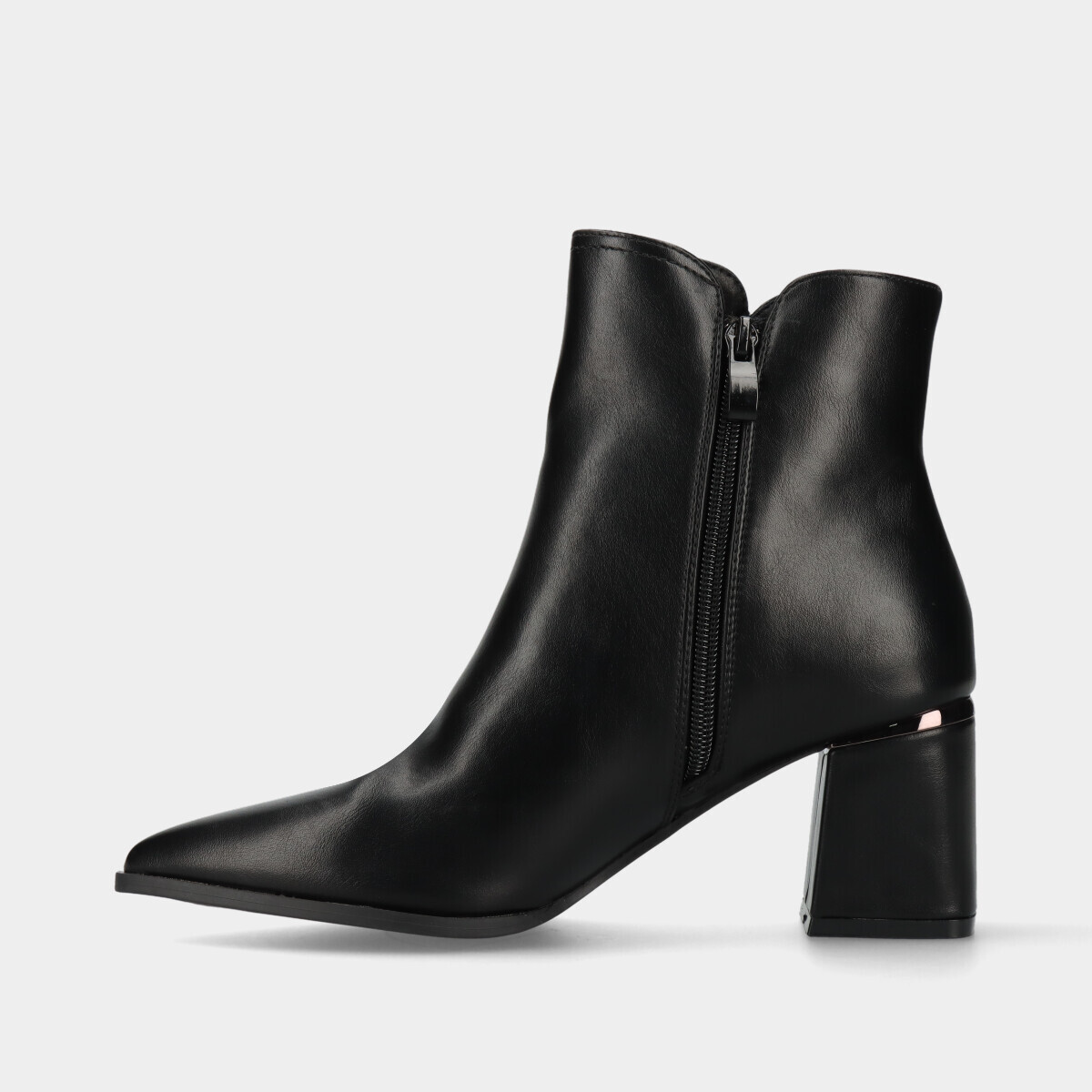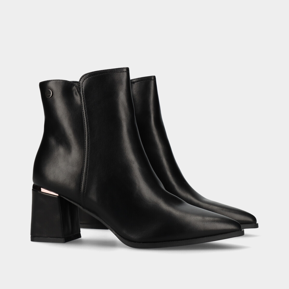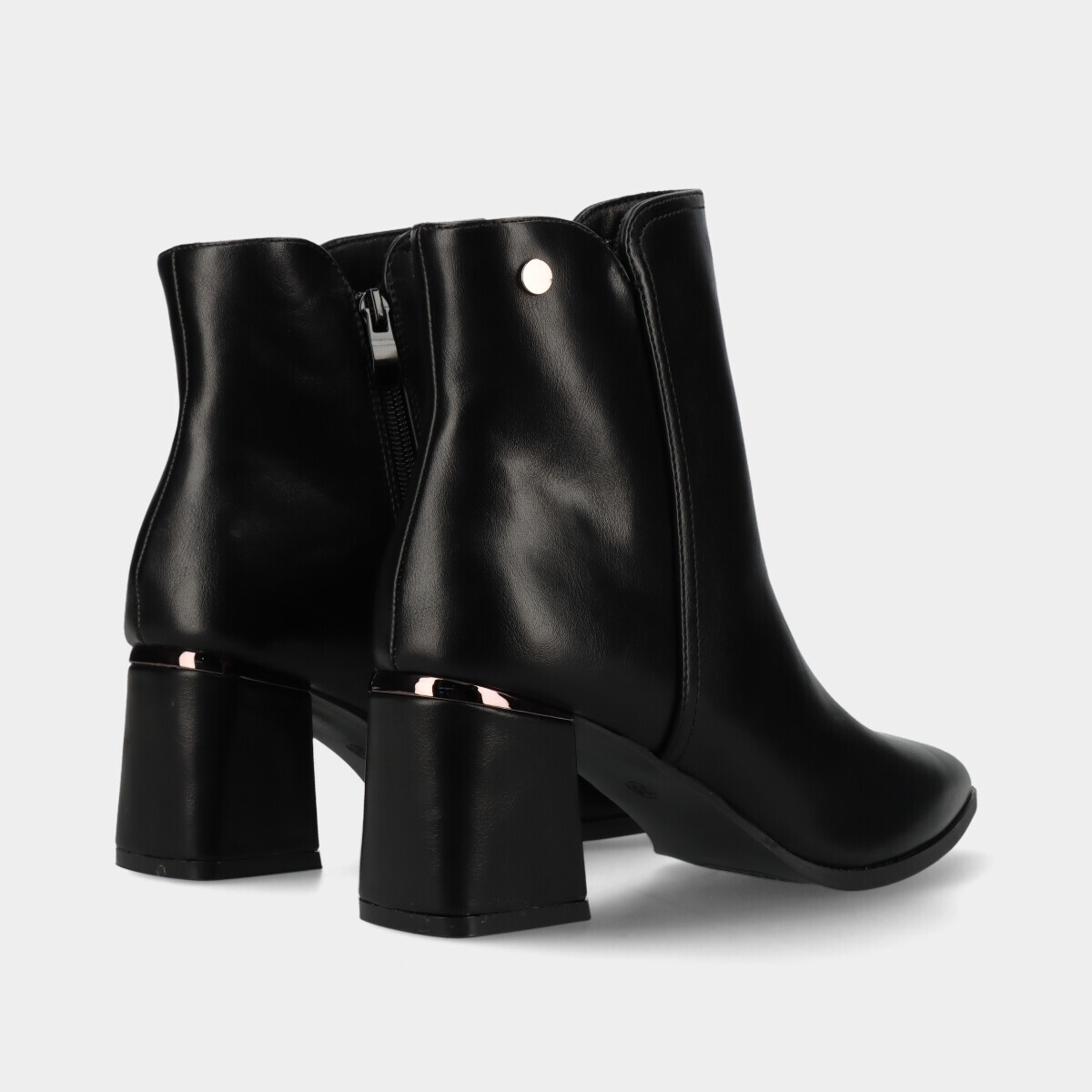 Botim de salto médio para mulher em preto, com efeito pele e fecho prático na lateral.