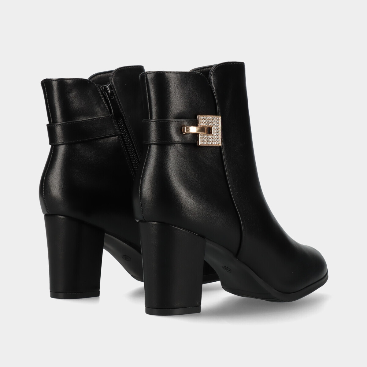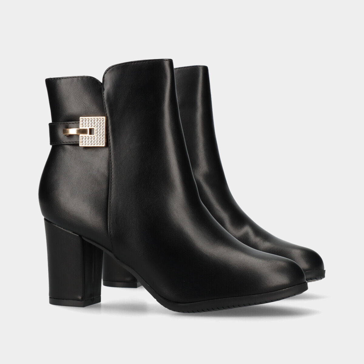 Botim de salto médio para mulher em preto com efeito pele, aplicação dourada com brilhantes, palmilha acolchoada e fecho prático na lateral.