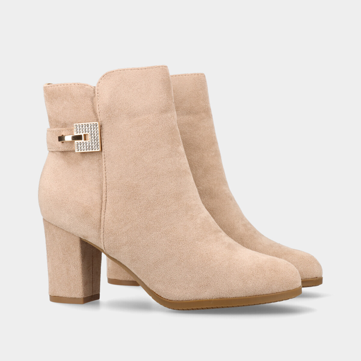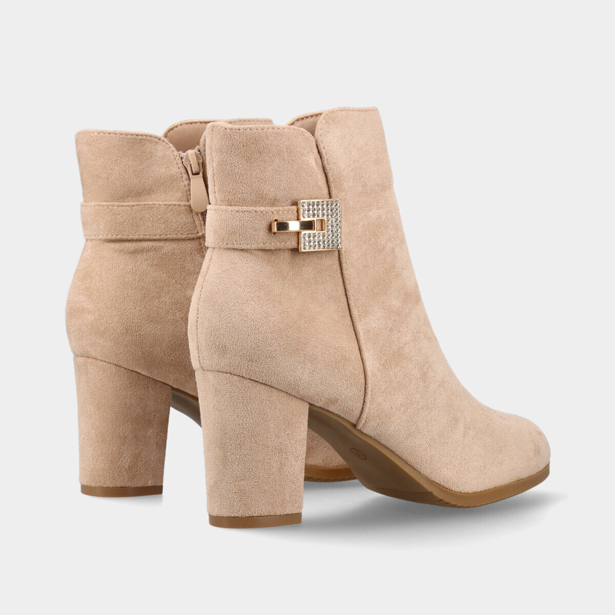 Botim de salto médio para mulher em bege com efeito camurça, aplicação dourada com brilhantes, palmilha acolchoada e fecho prático na lateral.