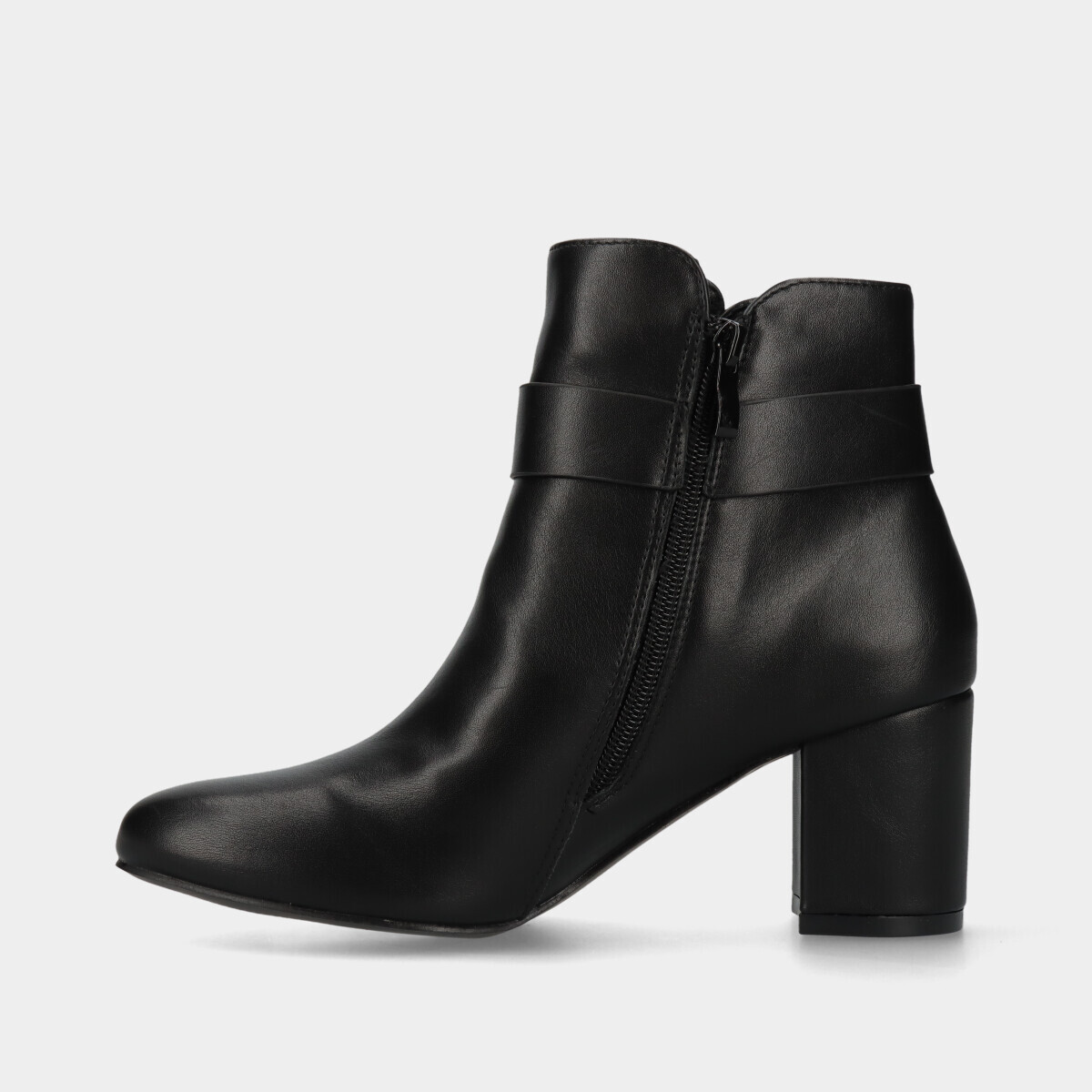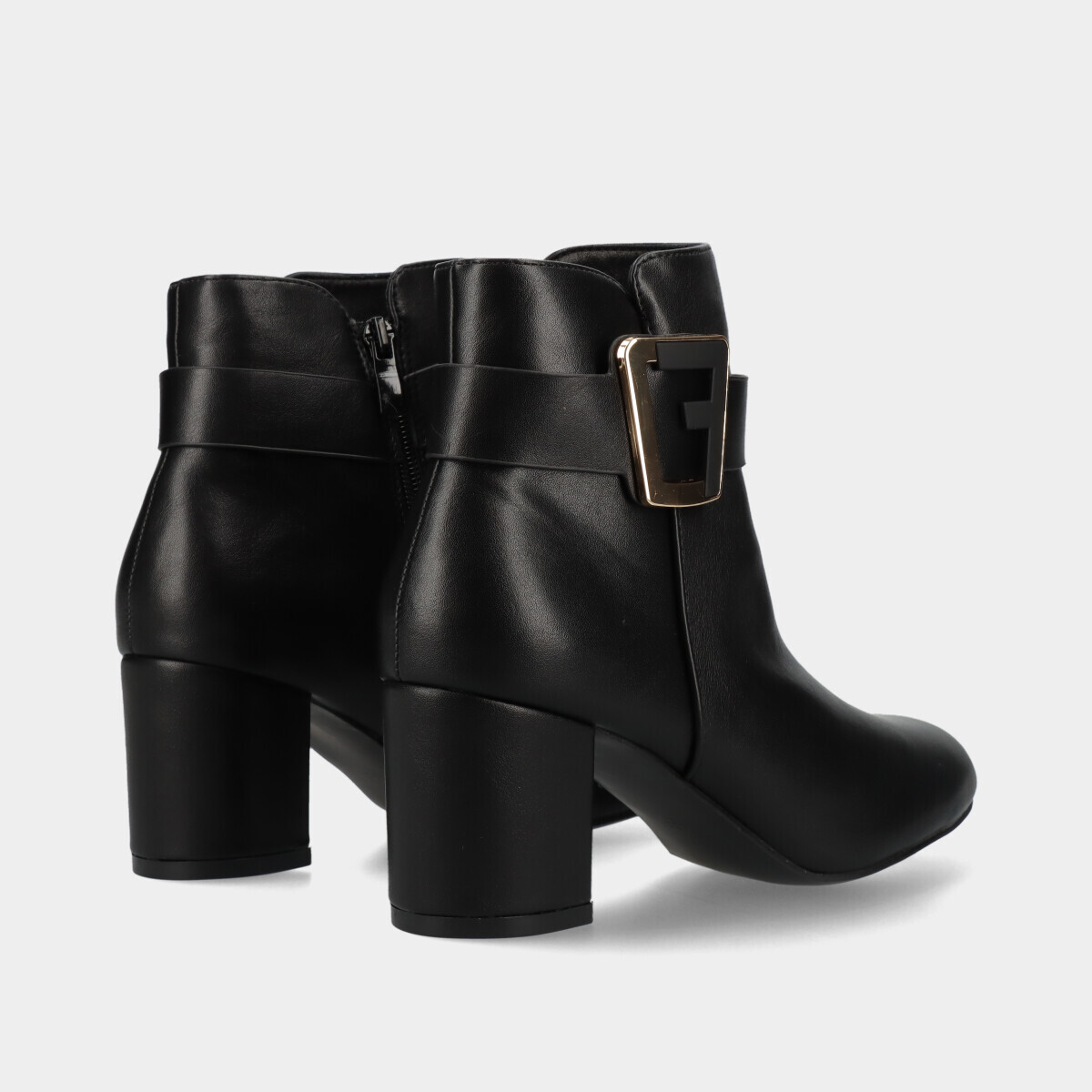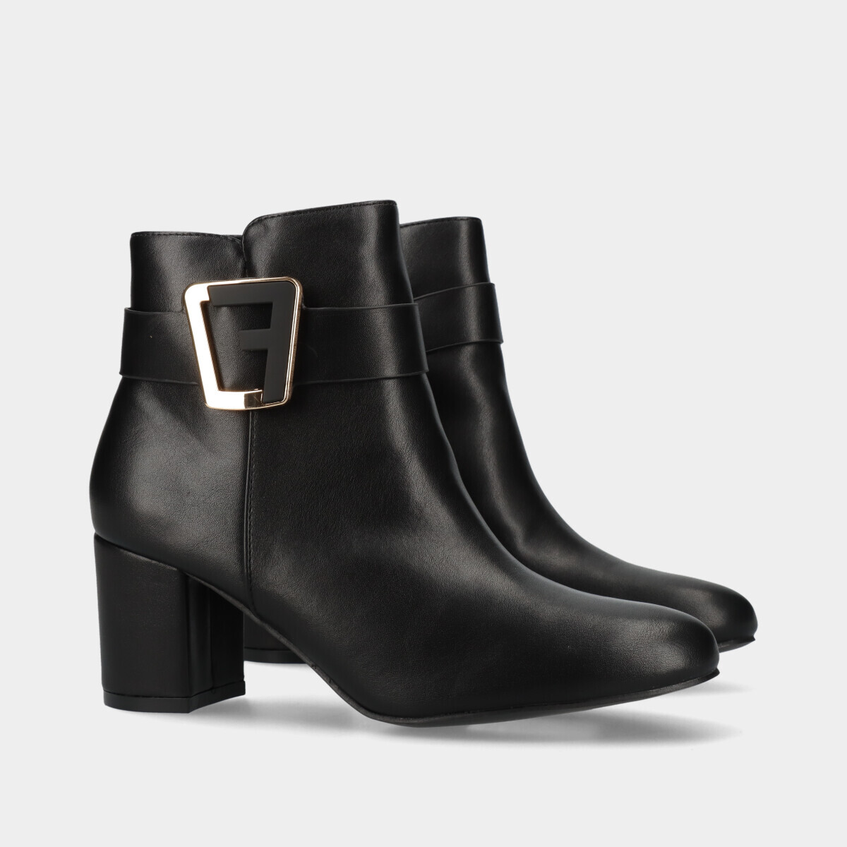 Botim de salto médio para mulher em preto, com aplicação dourada e fecho prático na lateral.