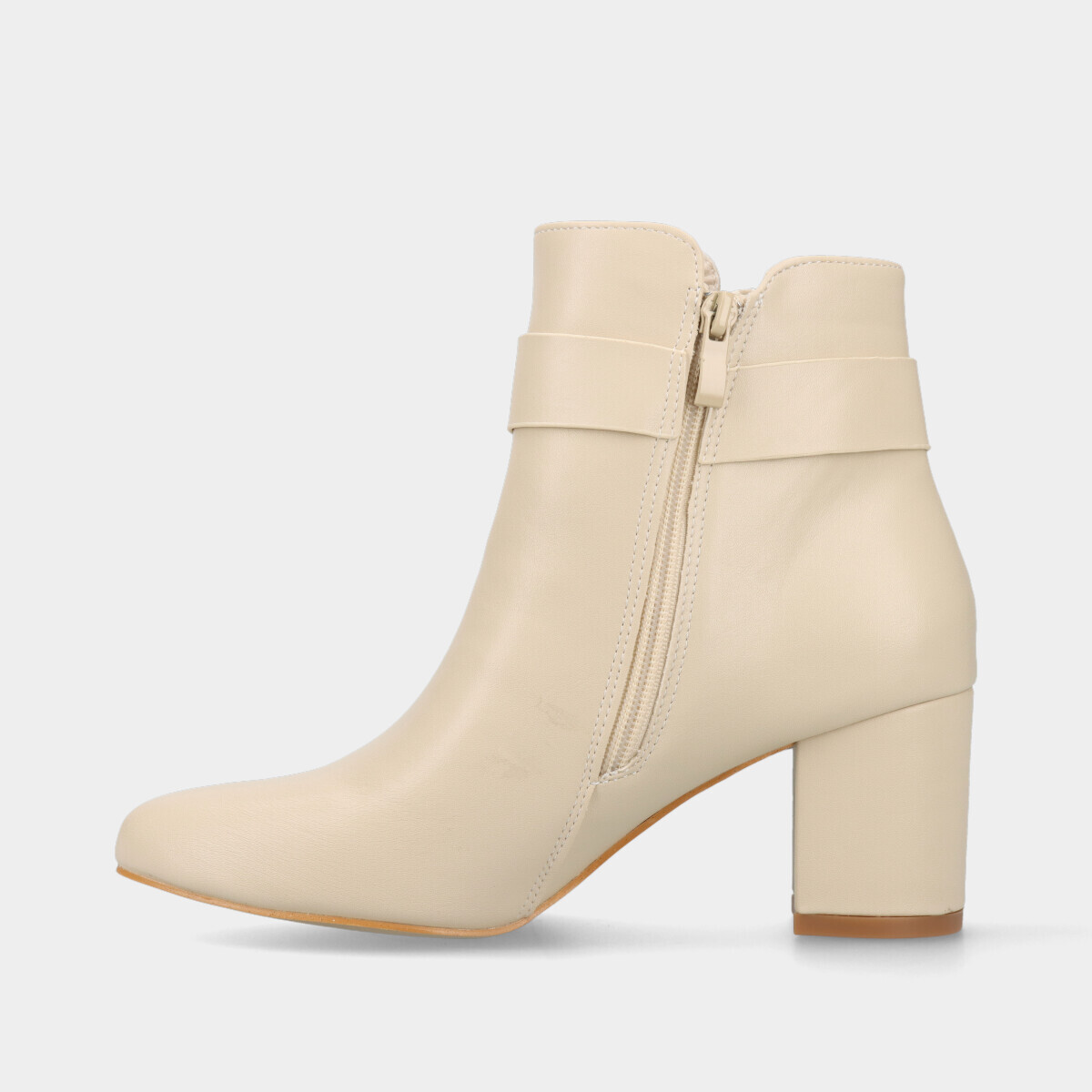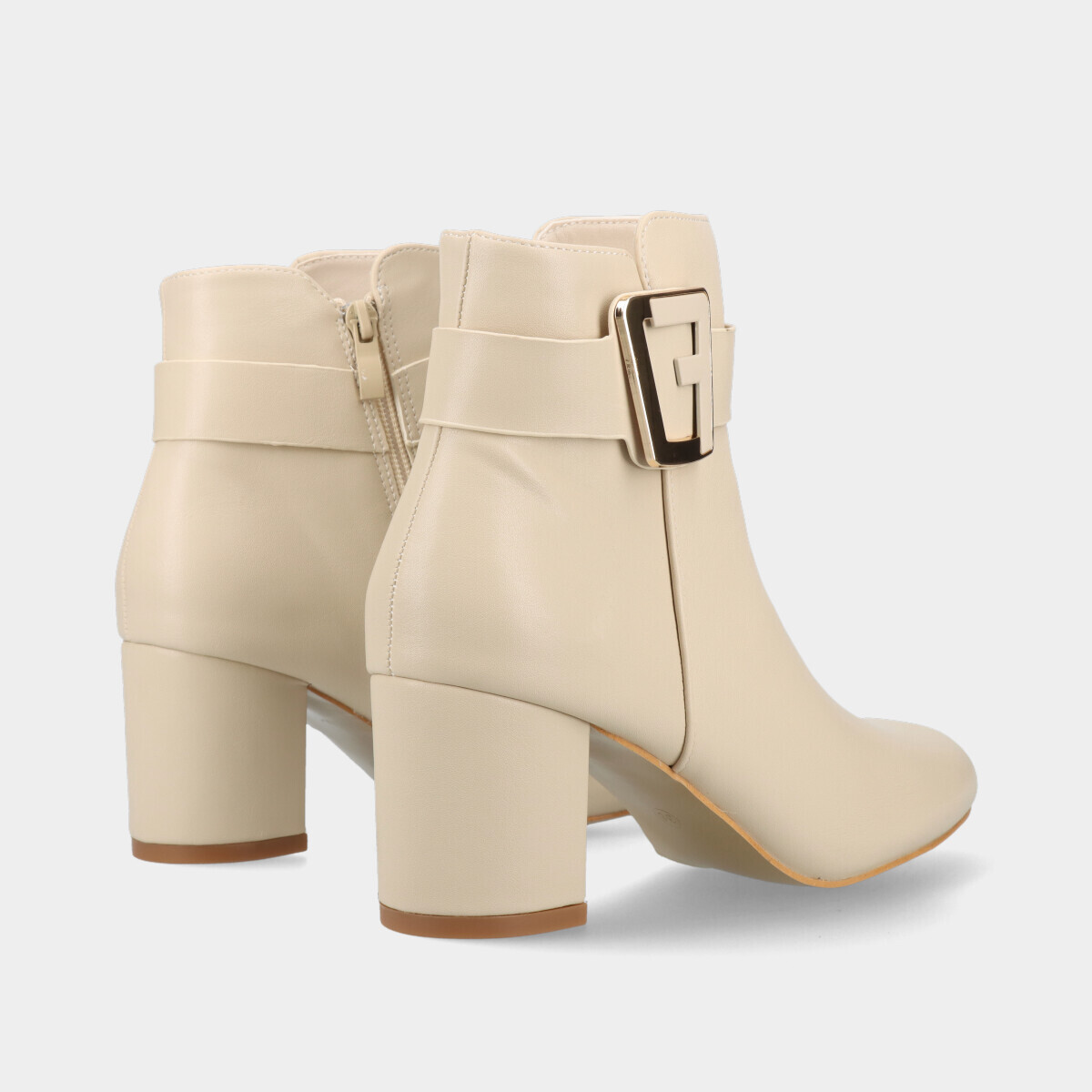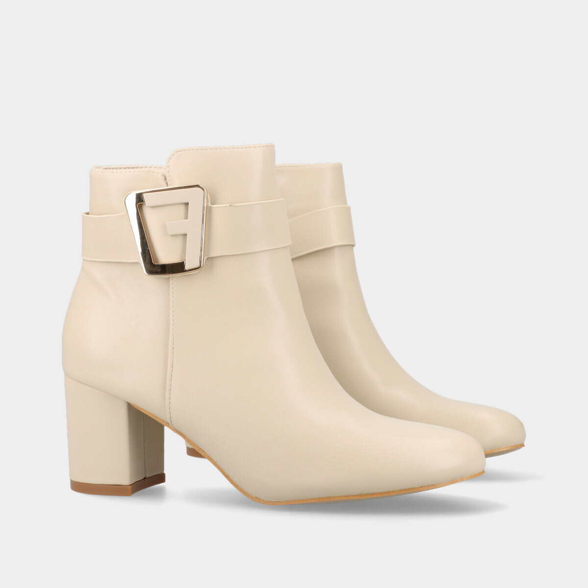 Botim de salto médio para mulher em bege, com aplicação dourada e fecho prático na lateral.