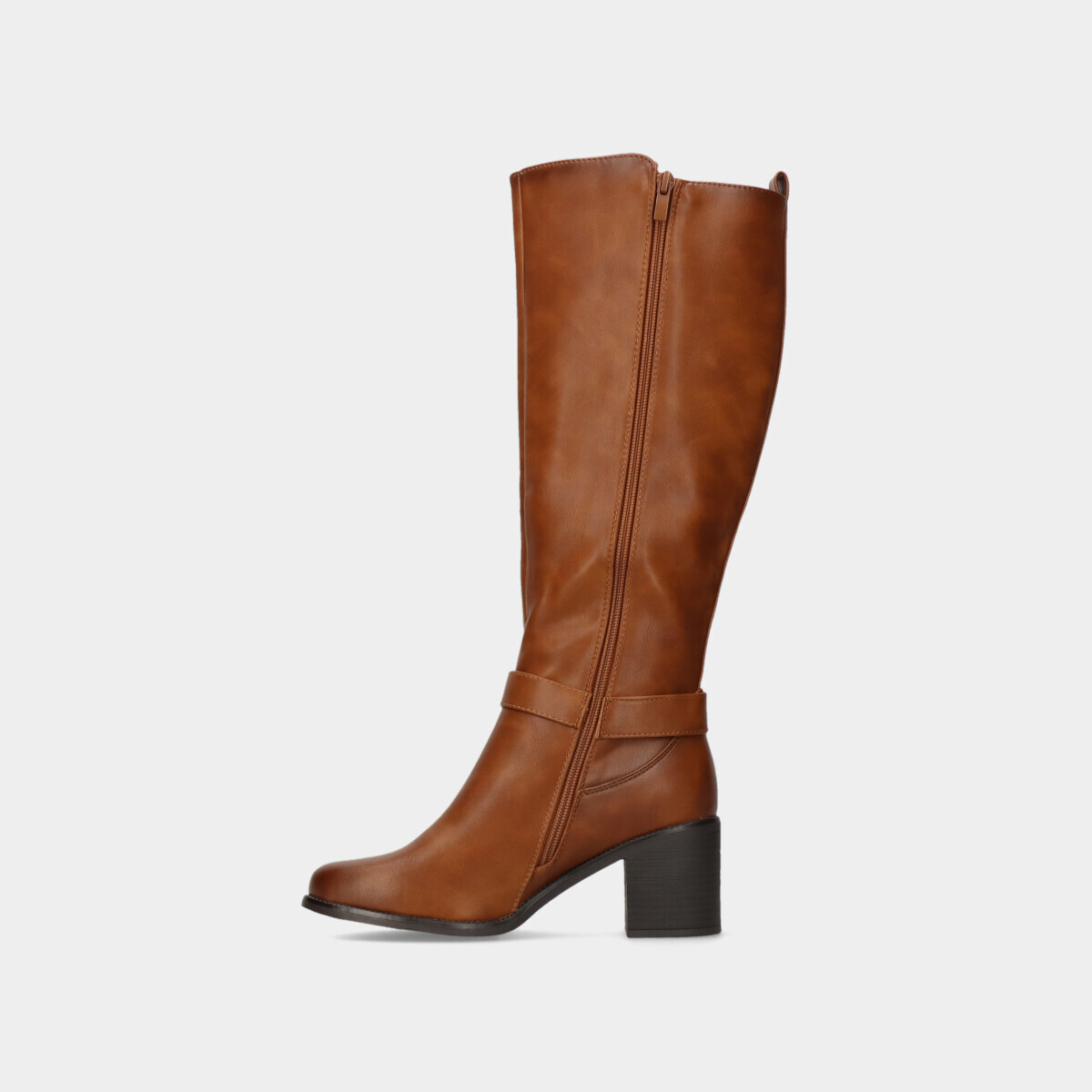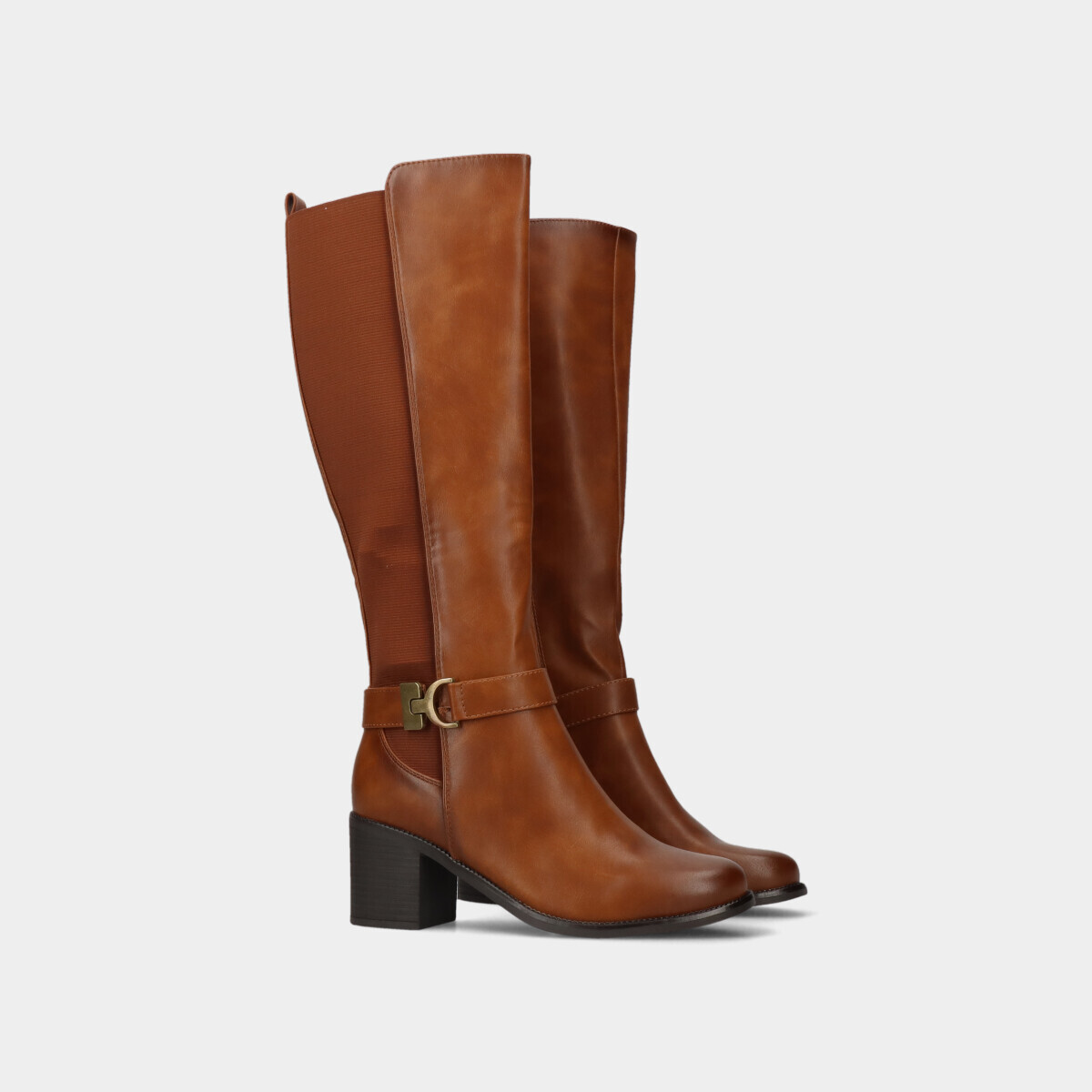 Botas para mulher em preto com aplicação decorativa dourada e frente redonda. Fecho lateral e elástico que facilita o calçar e tacão em bloco para maior conforto.