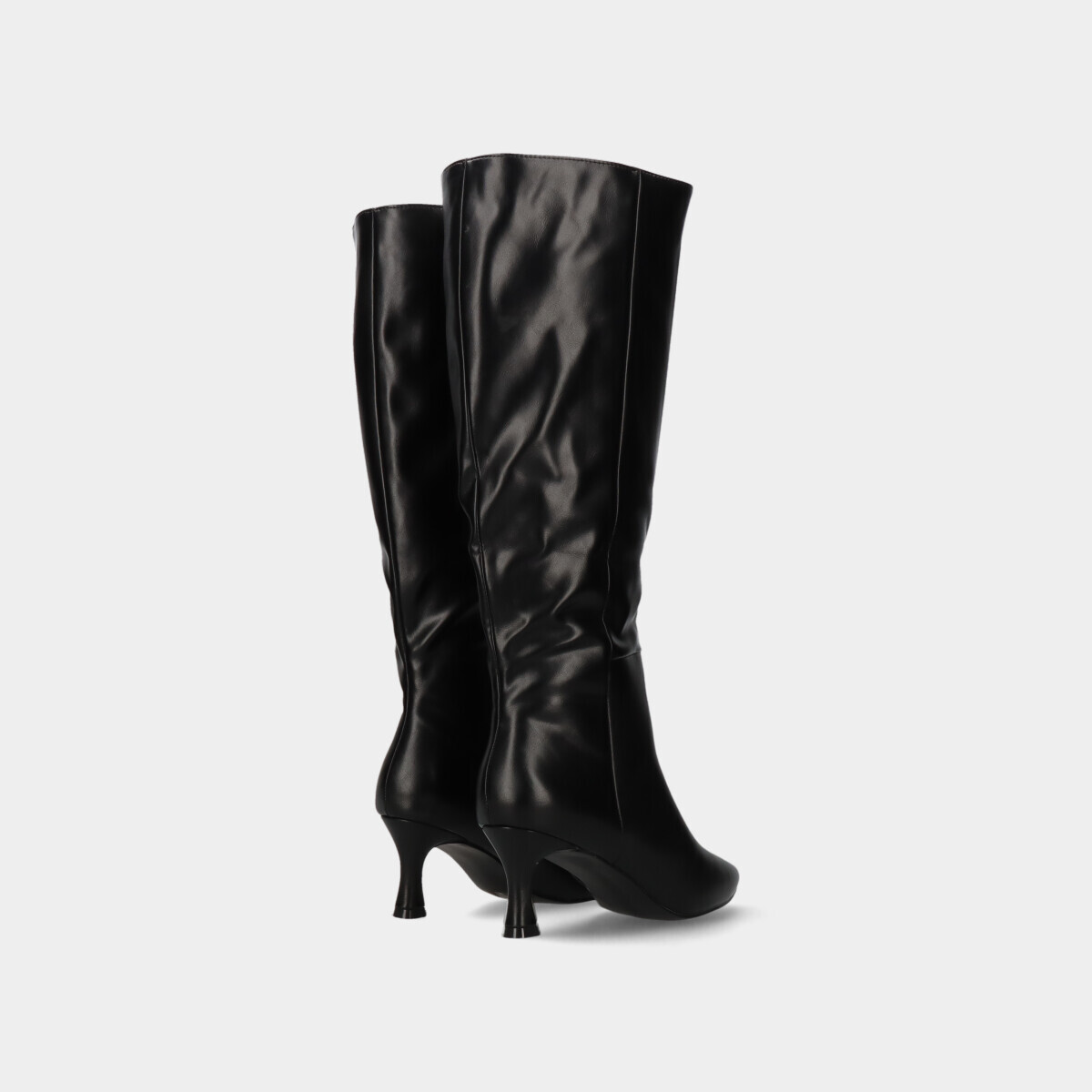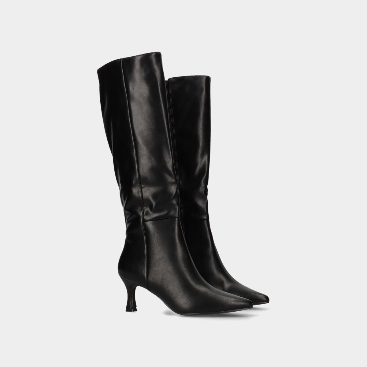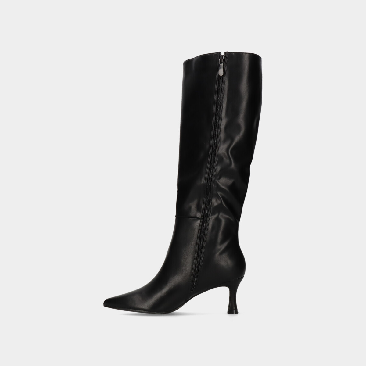 Botas para mulher em preto, com efeito pele e biqueira pontiaguda, fecho lateral para calçar com facilidade e tacão estável.