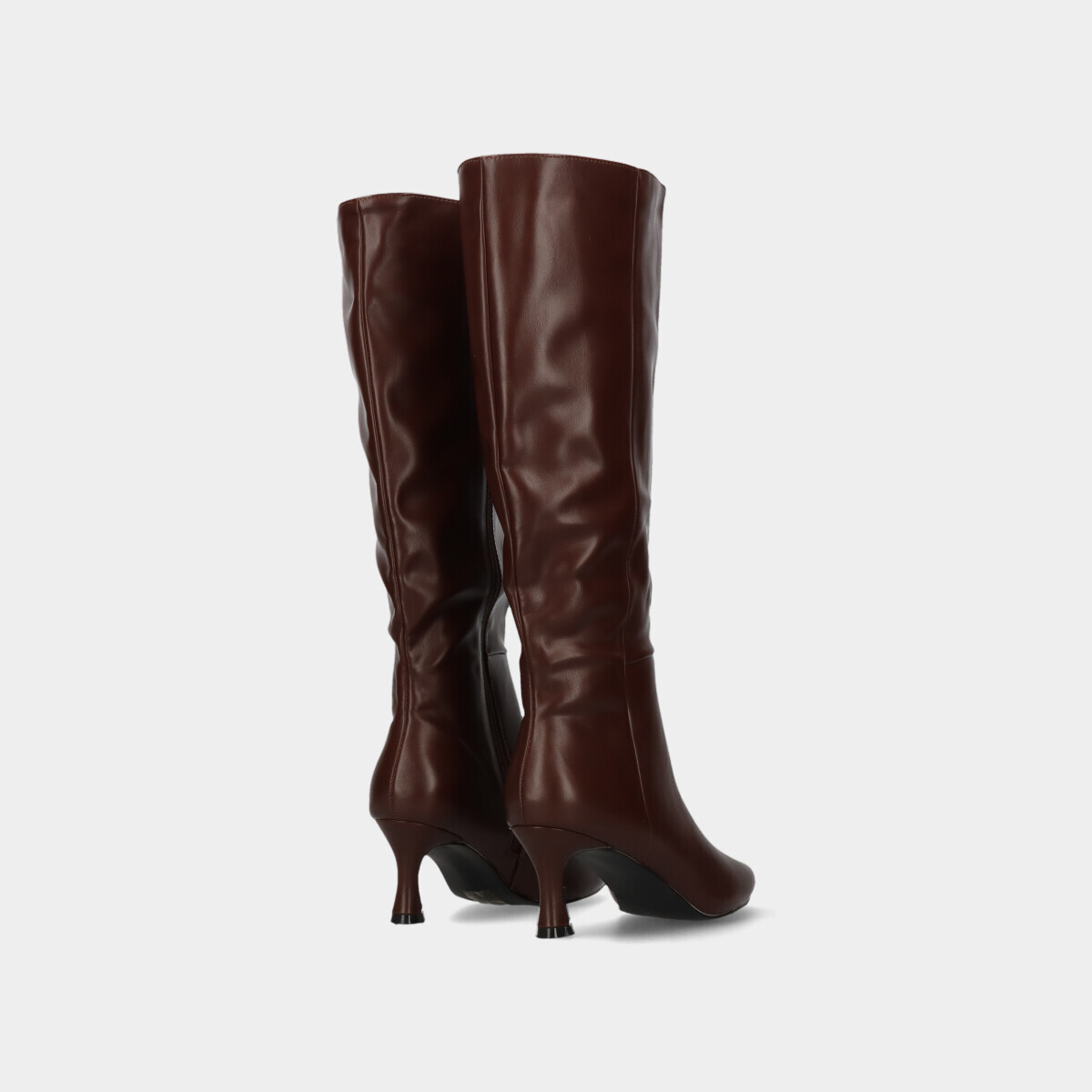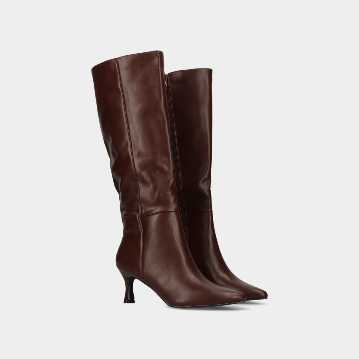 Botas para mulher em castanho, com efeito pele e biqueira pontiaguda, fecho lateral para calçar com facilidade e tacão estável.