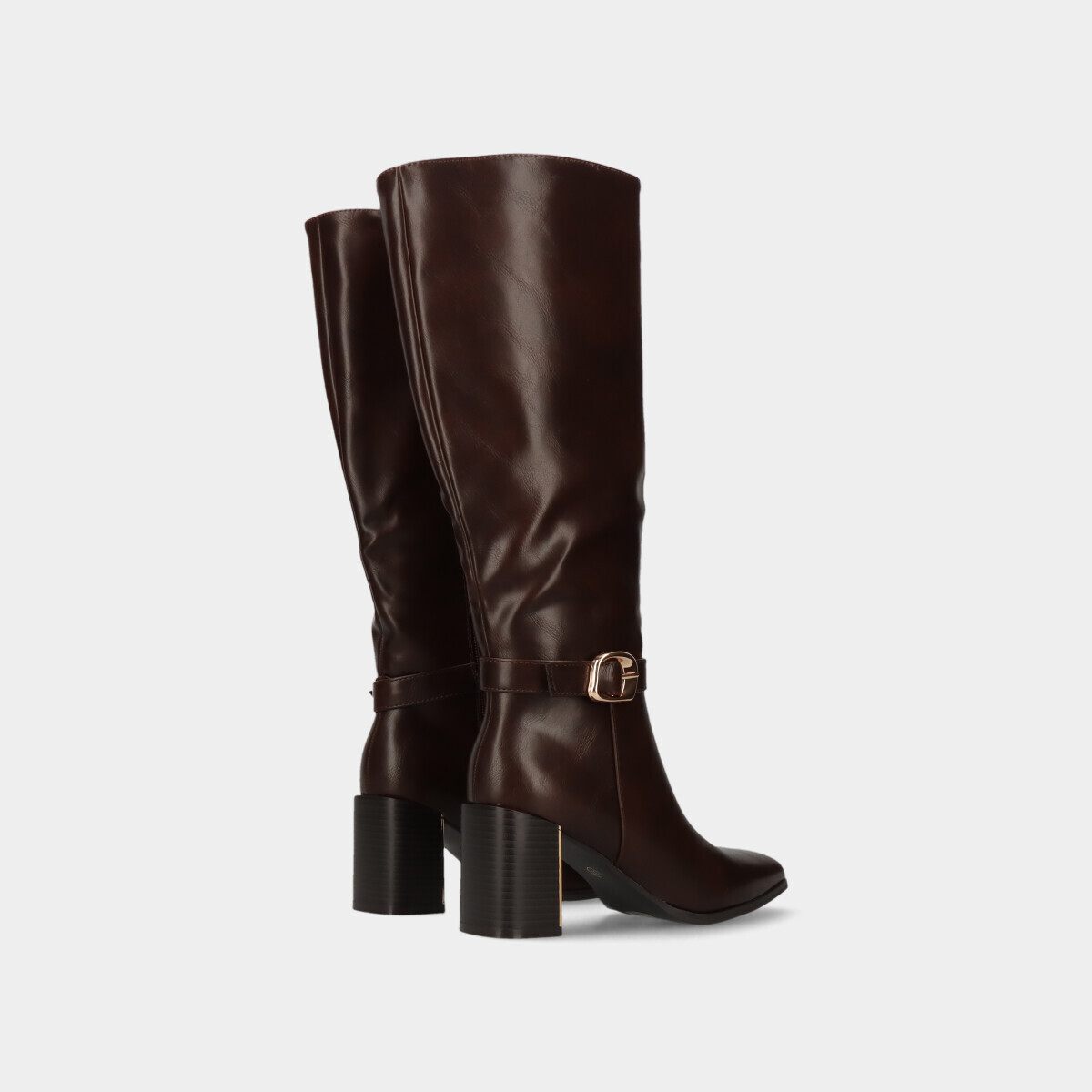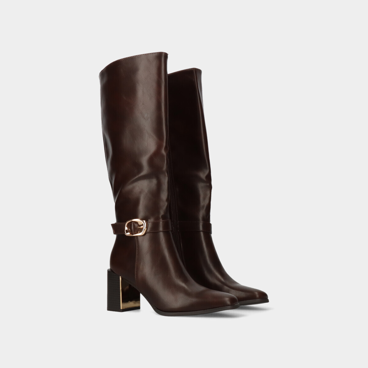 Botas para mulher em castanho com efeito pele, aplicação decorativa e salto com pormenor dourado. Fecho lateral que facilita o calçar e tacão largo para maior conforto e estabilidade.