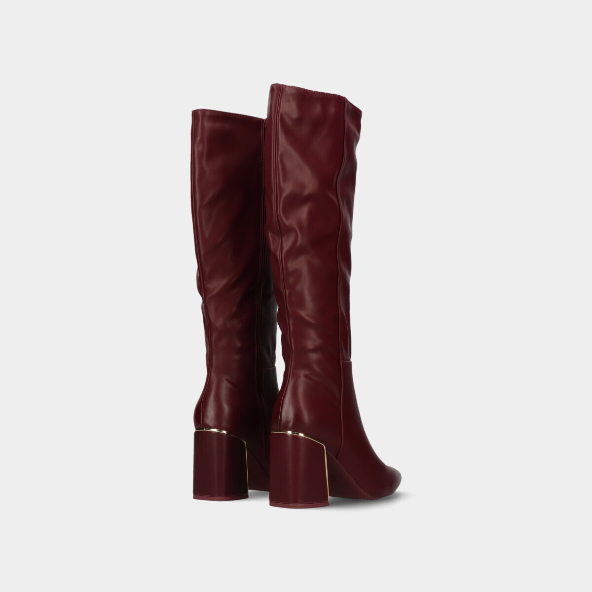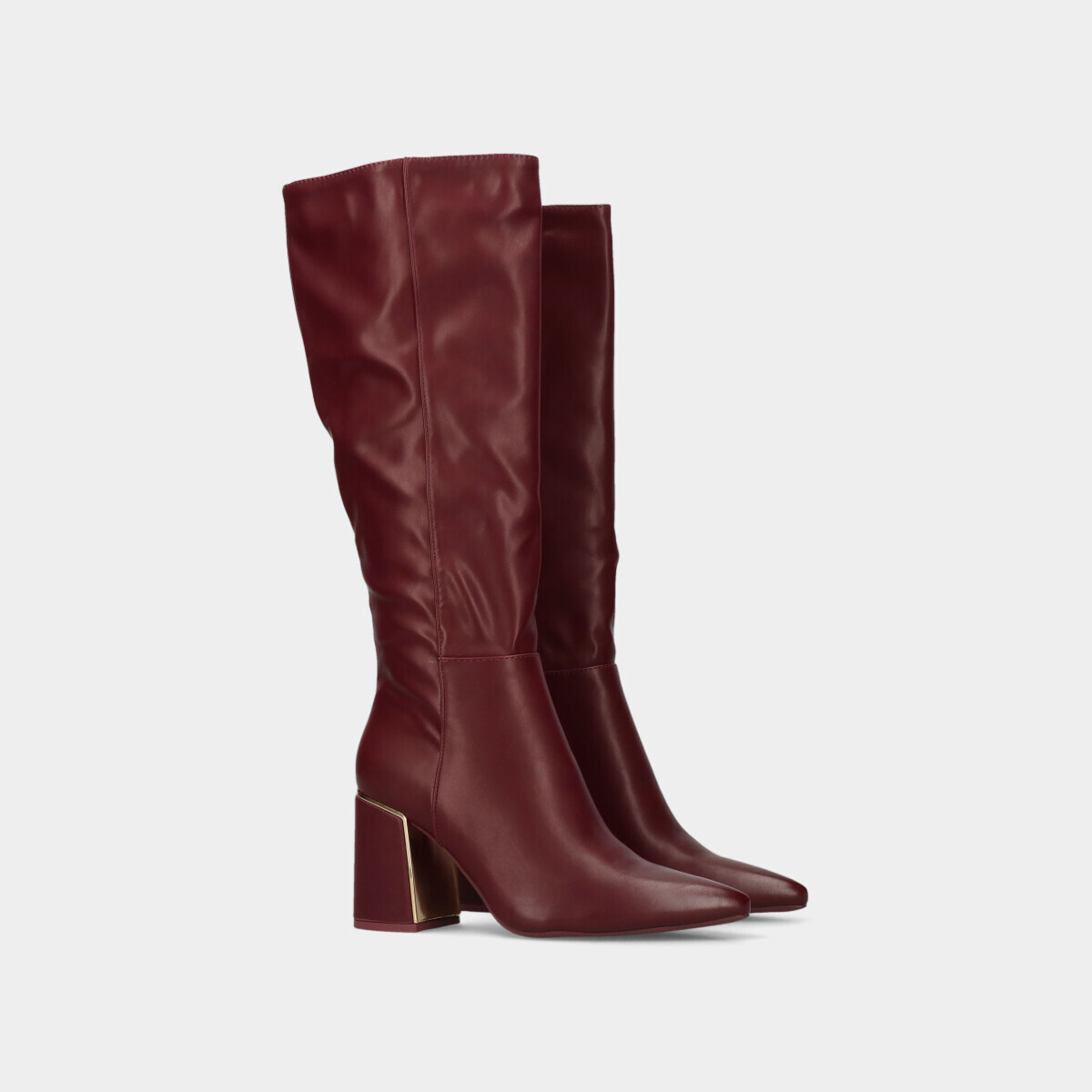 Botas para mulher em bordô com efeito pele, ponta em bico e salto com pormenor dourado. Fecho lateral que facilita o calçar e tacão largo para maior conforto e estabilidade.