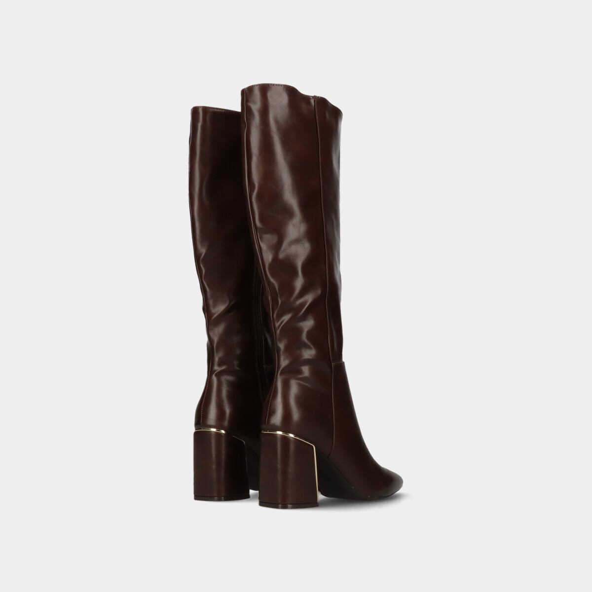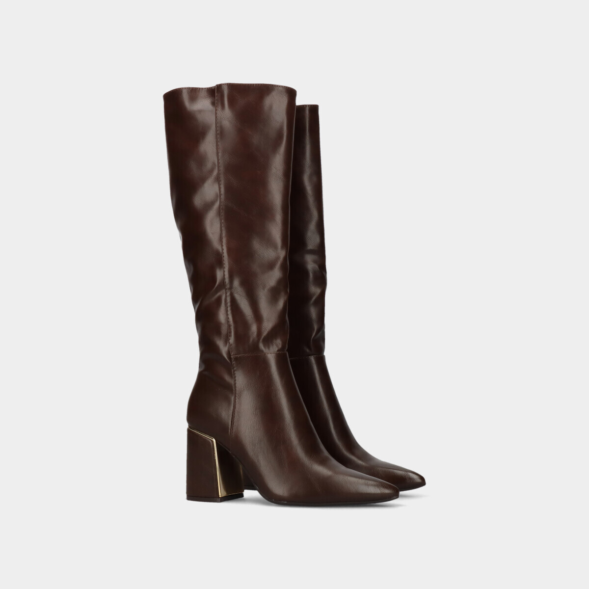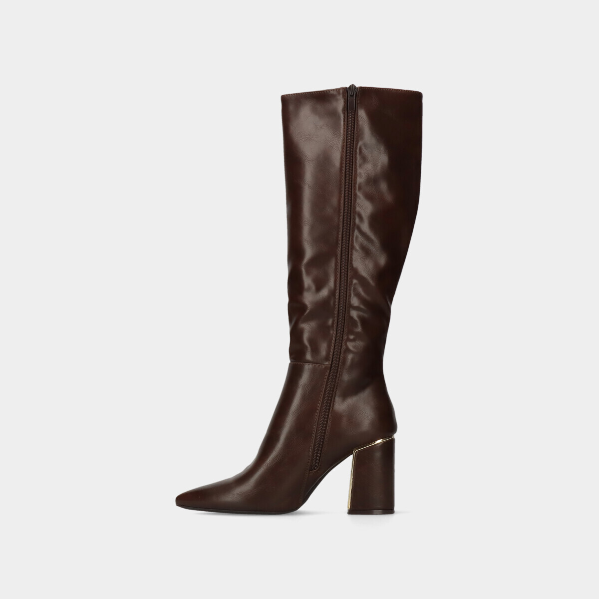 Botas para mulher em castanho com efeito pele, ponta em bico e salto com pormenor dourado. Fecho lateral que facilita o calçar e tacão largo para maior conforto e estabilidade.