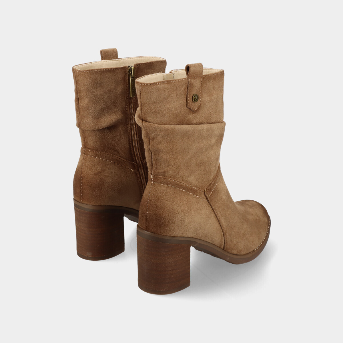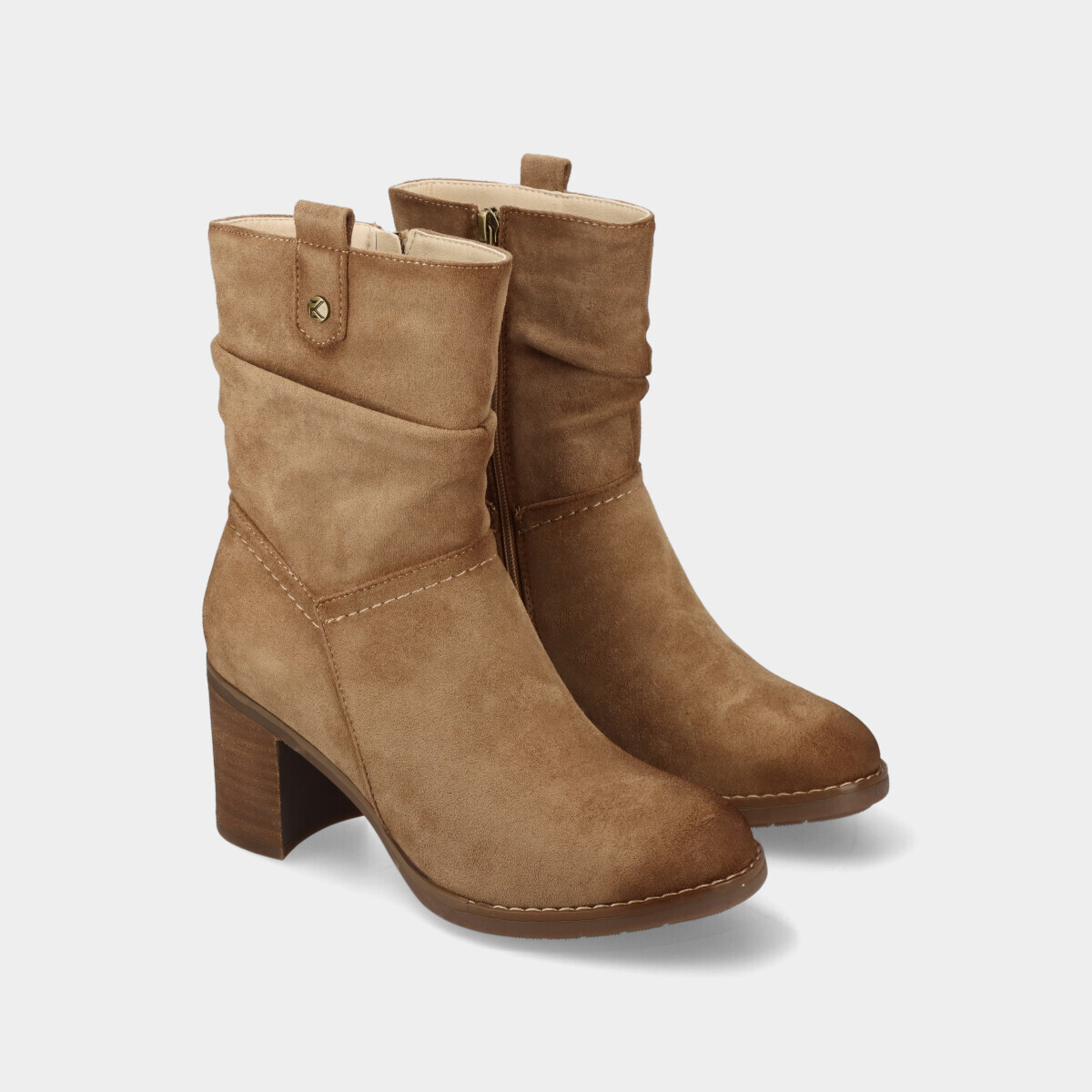 Botins de salto para mulher em taupe, com efeito camurça, ponta redonda, fecho lateral que facilita o calçar e salto quadrado que proporciona maior conforto.
