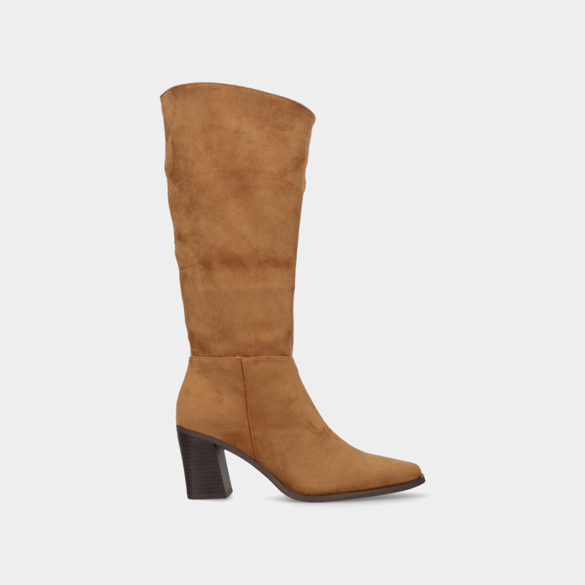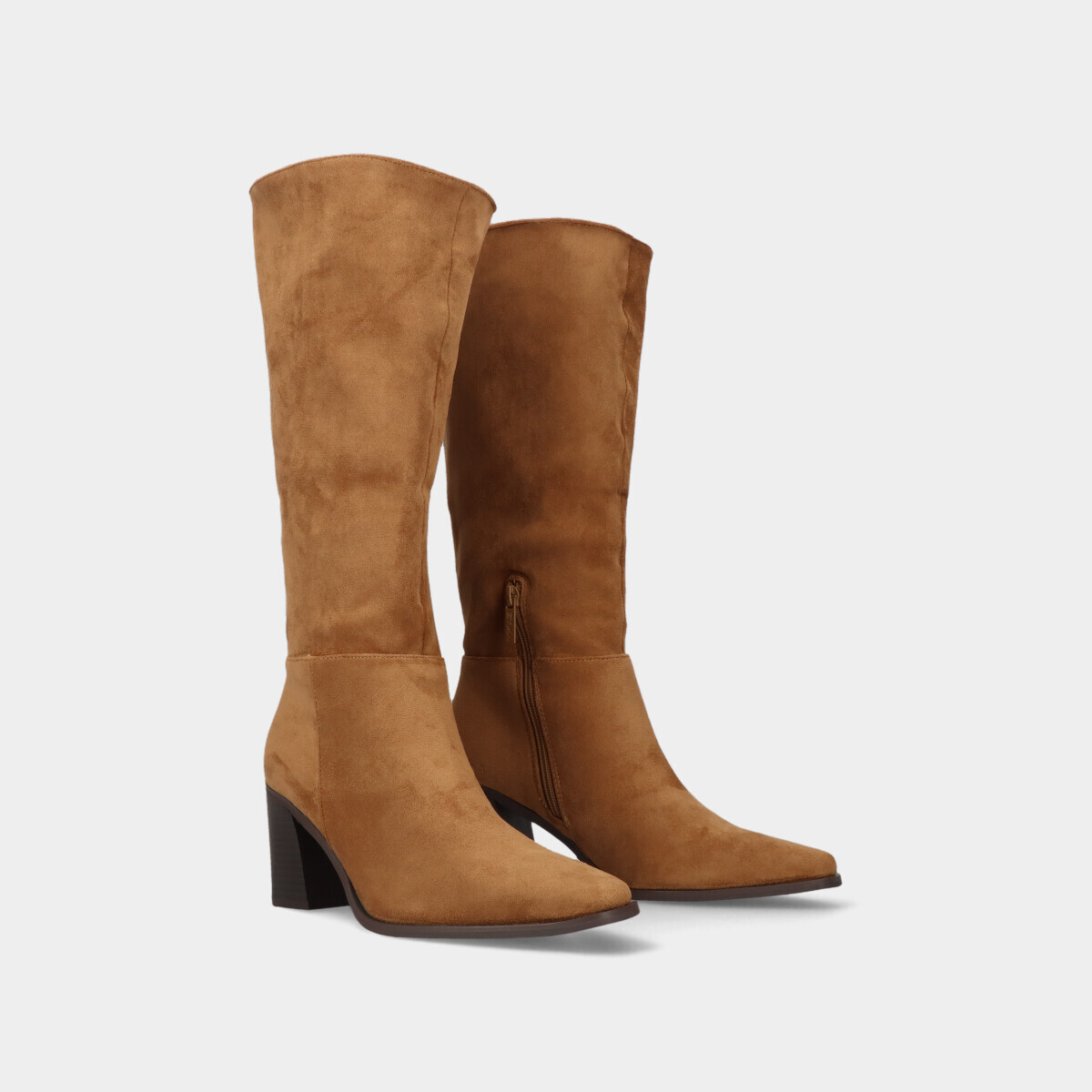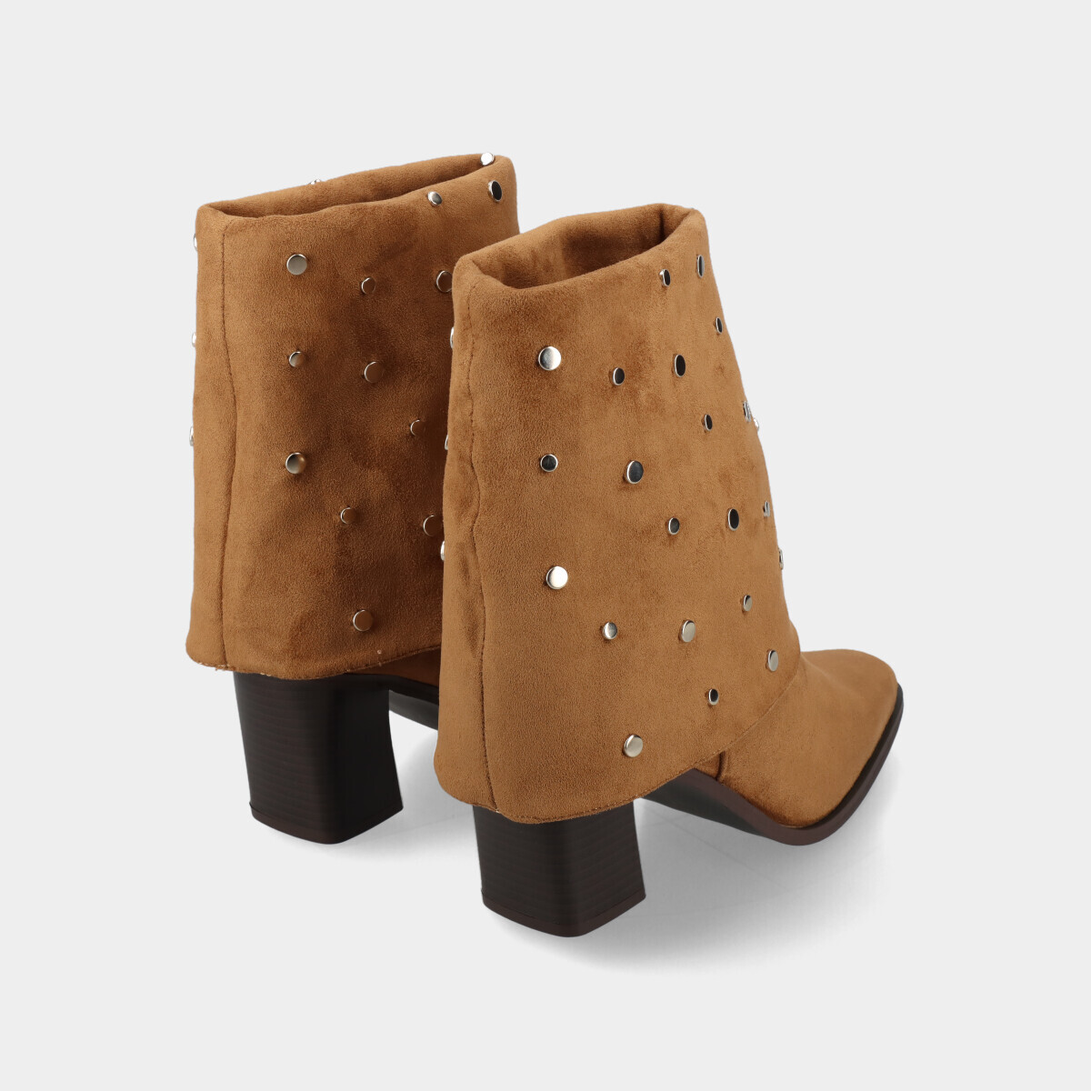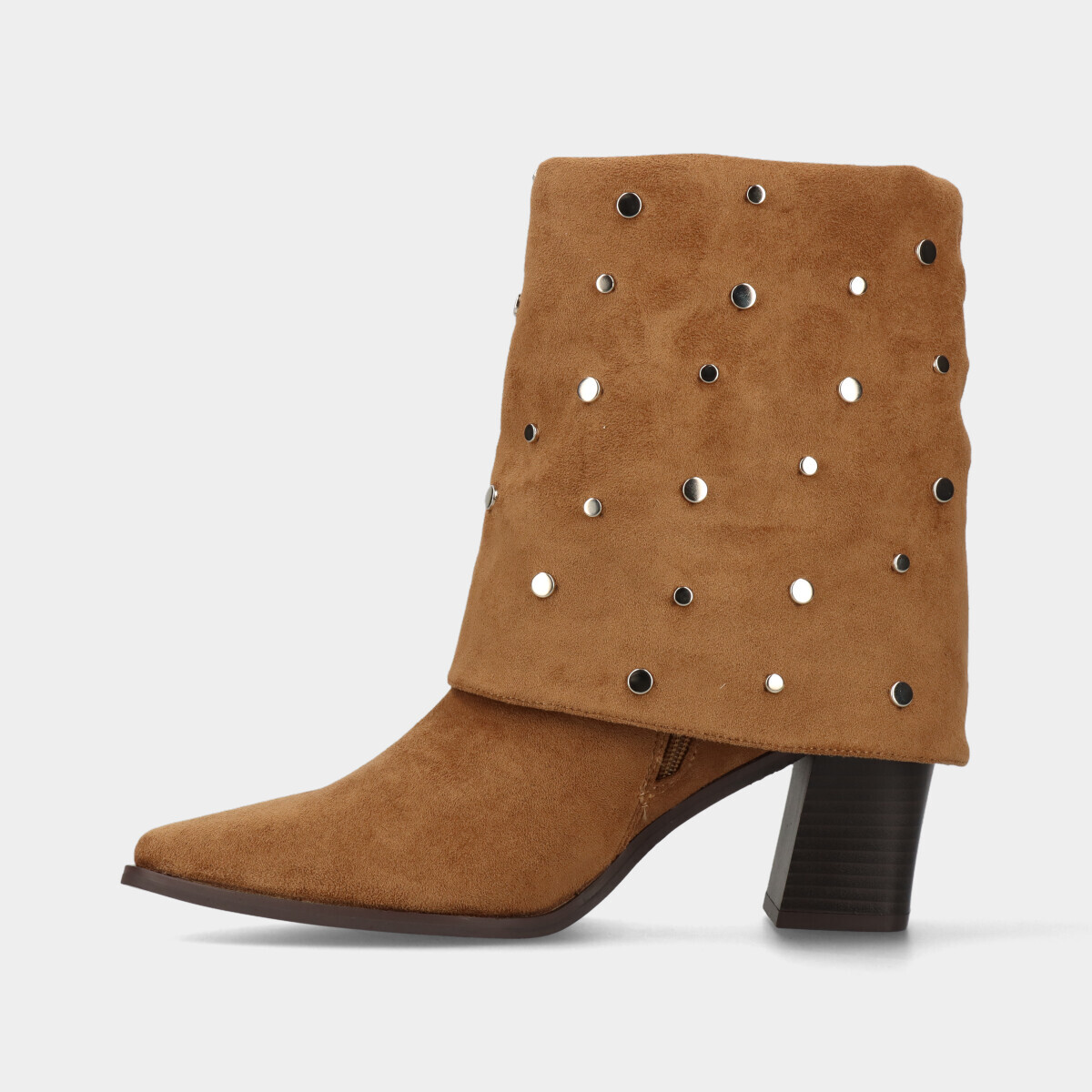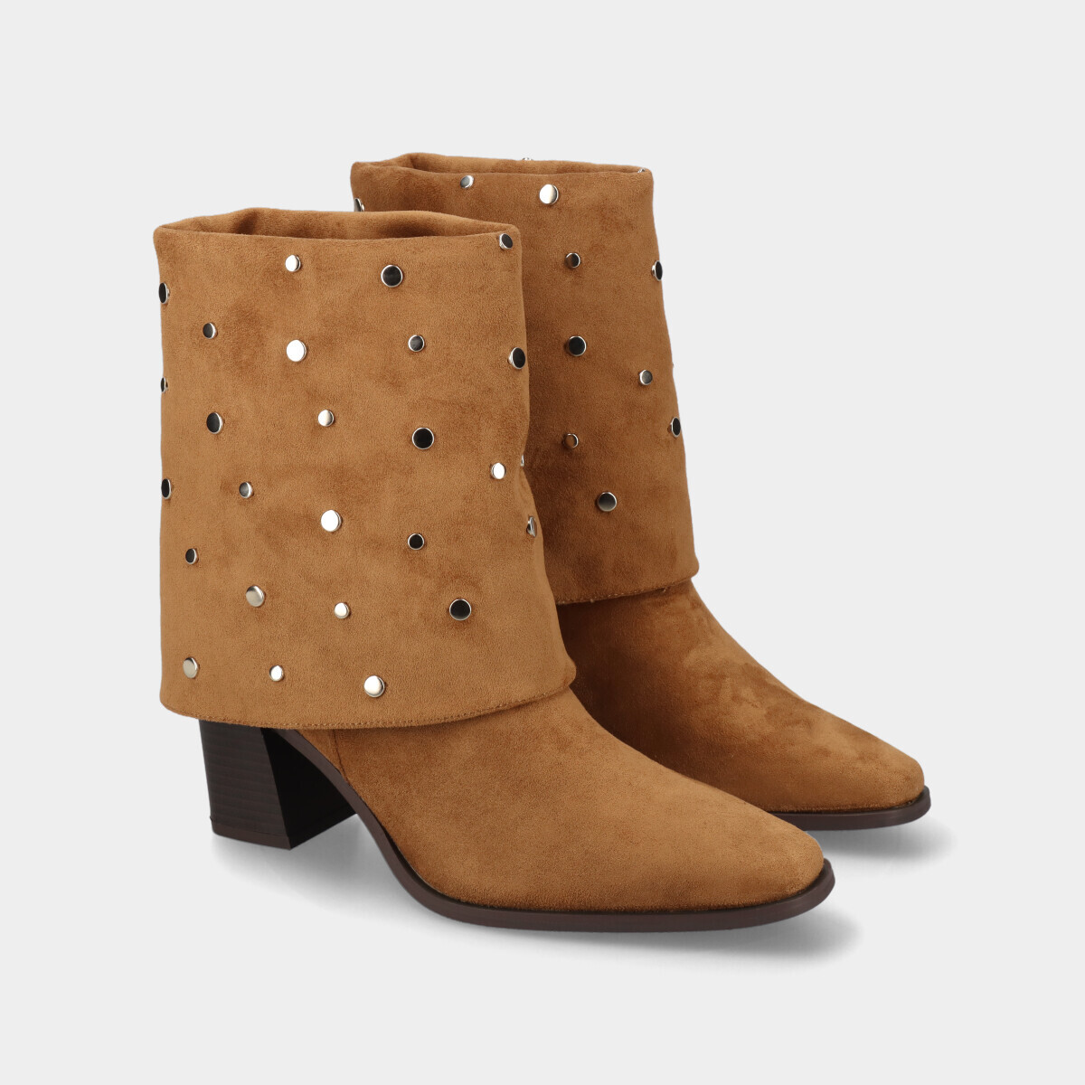 Botas de salto para mulher em camel, com cano dobrável que permite usar o cano para cima ou dobrado, tachas prateadas e efeito camurça. Fecho interior até meio cano facilita o calçar e salto quadrado proporciona maior conforto.