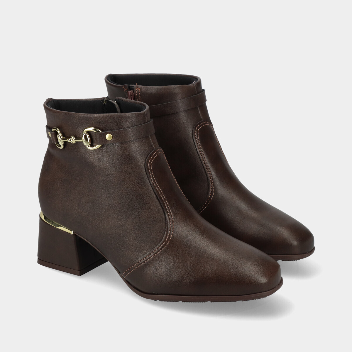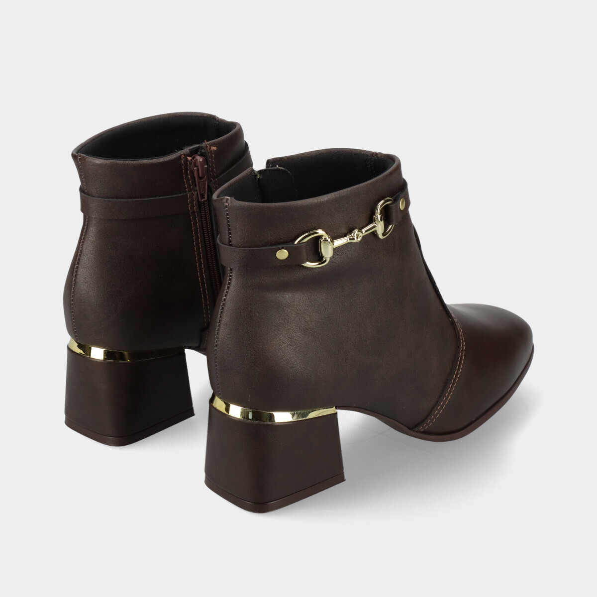 Botas de salto castanhas de conforto para mulher, com biqueira afunilada, aplicação dourada, palmilha e rebordos acolchoados, e fecho lateral. Botas femininas elegantes para uso diário.