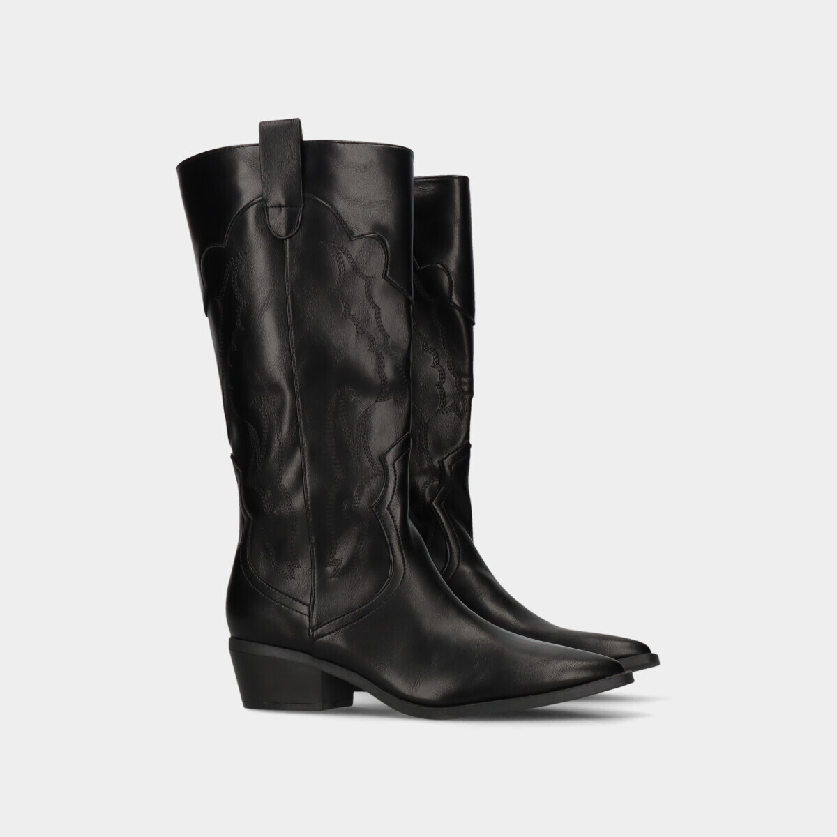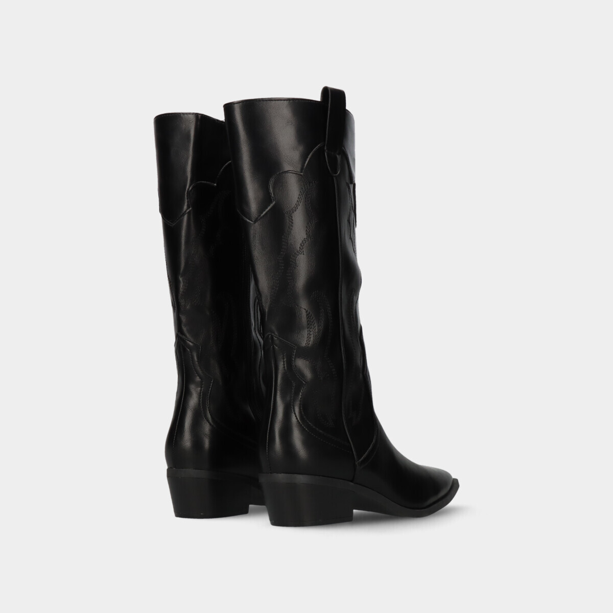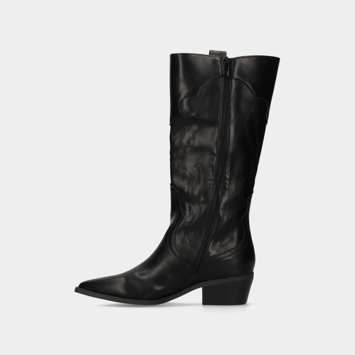 Botas texanas na cor preta com cano alto de efeito pele. Fecho interior que facilita o calçar e tacão baixo para maior conforto.