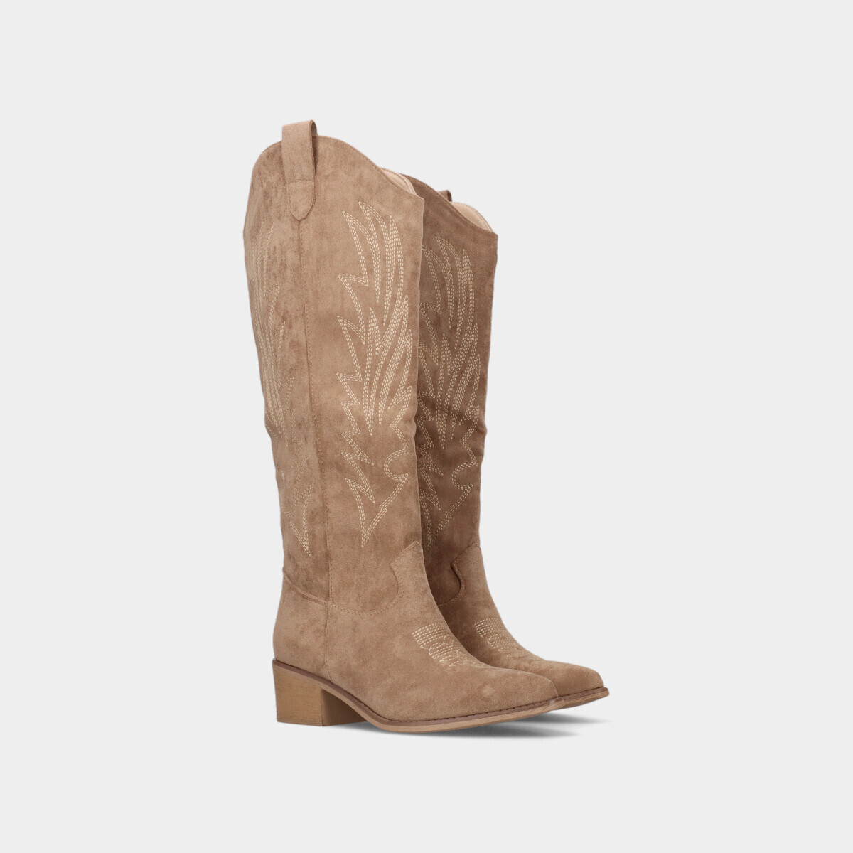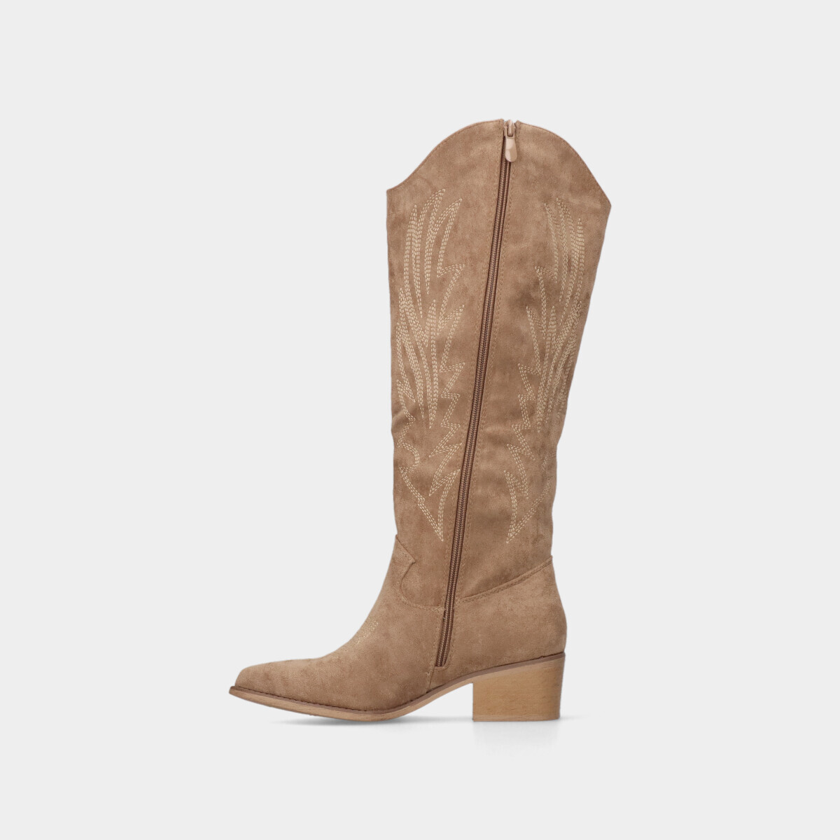 Texanas em taupe, com efeito camurça, biqueira pontiaguda e fecho lateral para calçar facilmente.