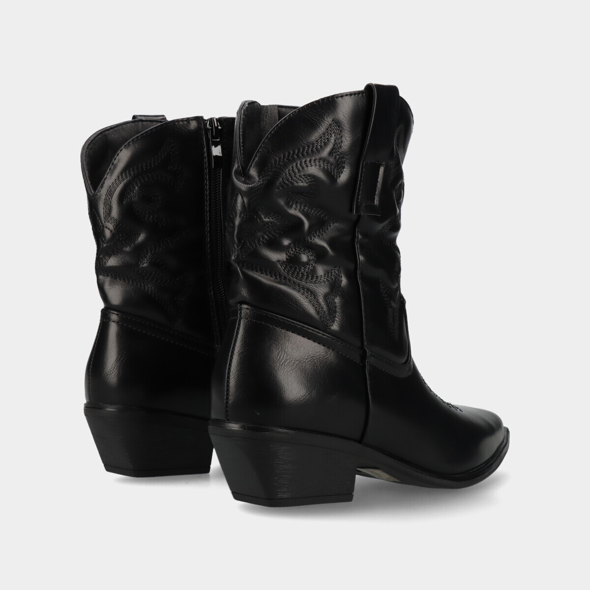 Texanas em preto, com efeito pele, biqueira pontiaguda e fecho lateral para calçar facilmente.