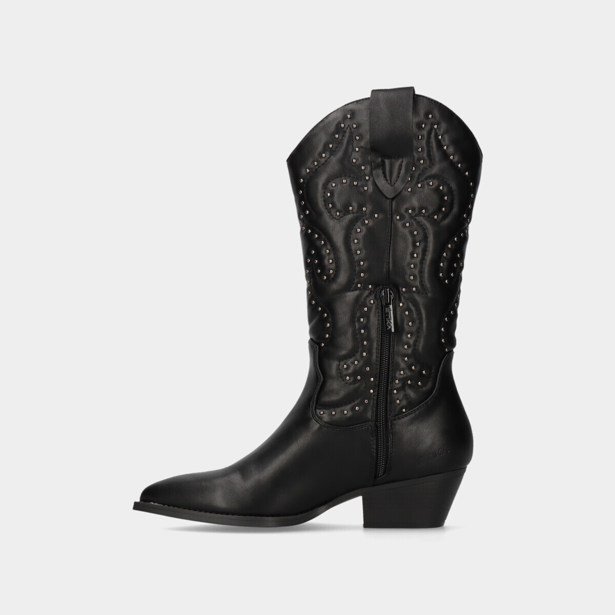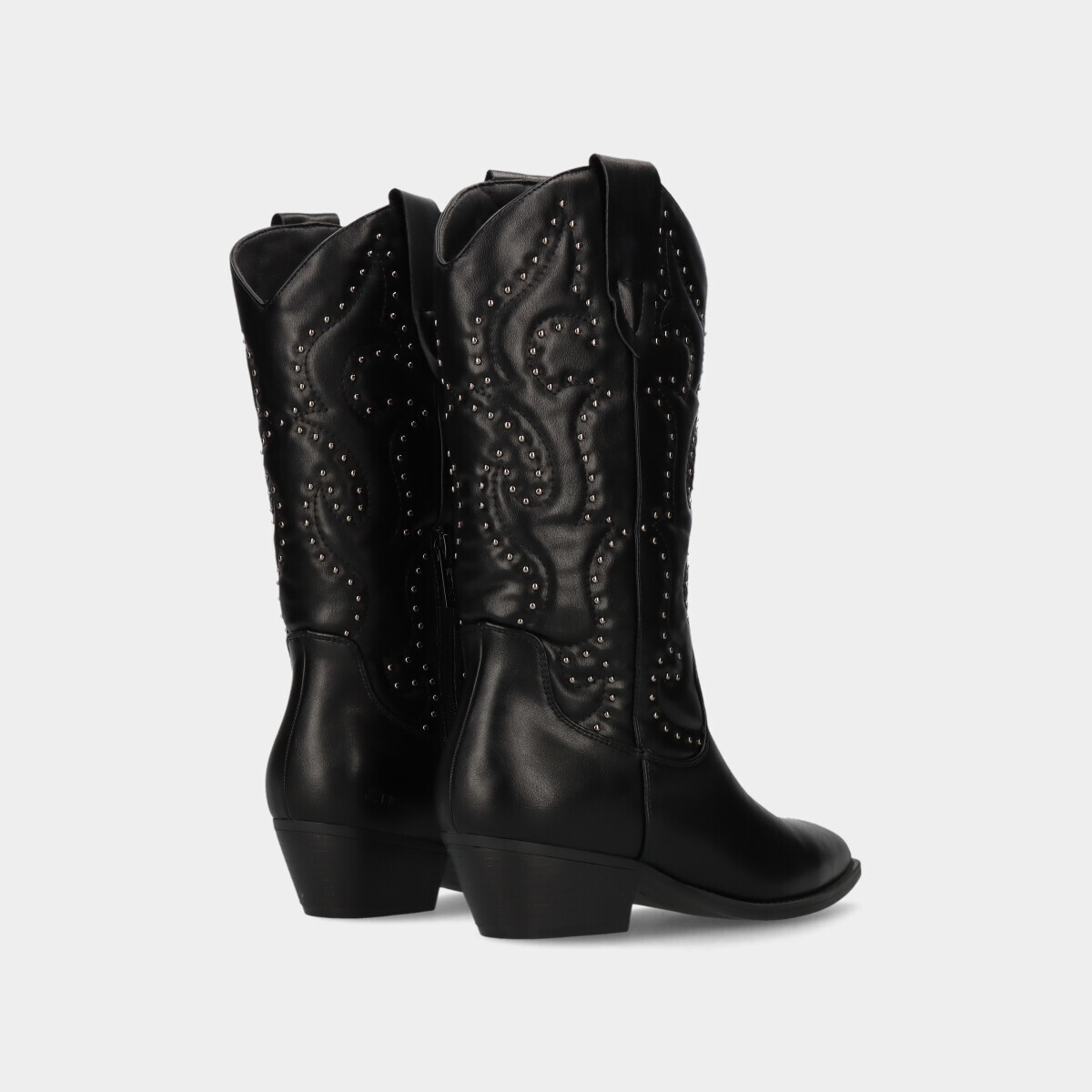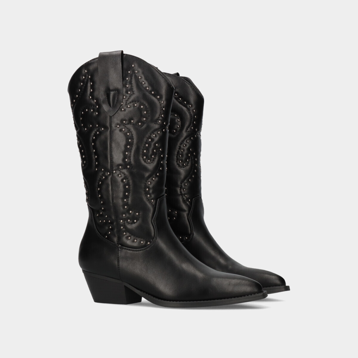 Botas texanas em preto para mulher, de cano alto, com tachas prateadas e efeito pele. Fecho interior até meio cano que facilita o calçar e salto baixo para maior conforto.