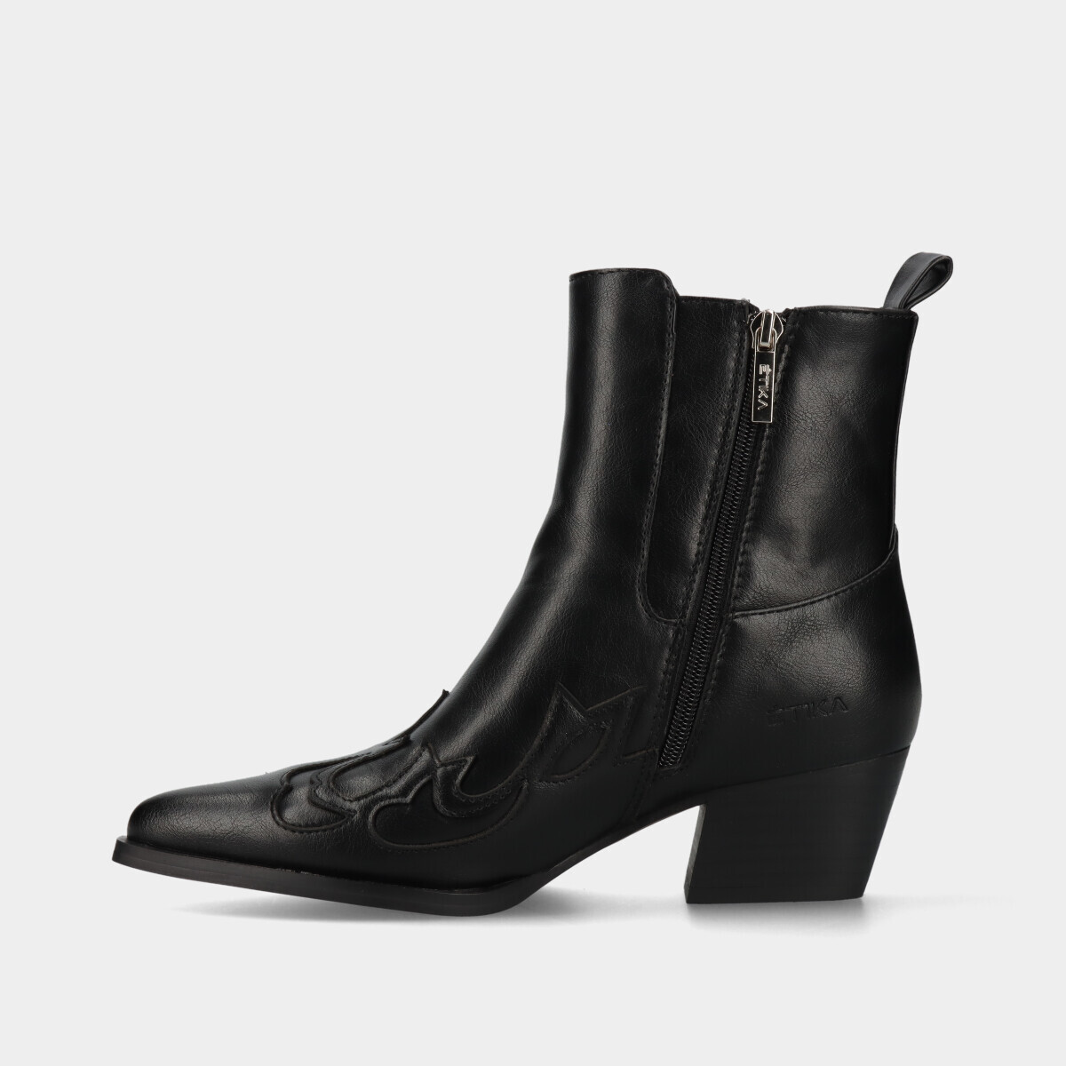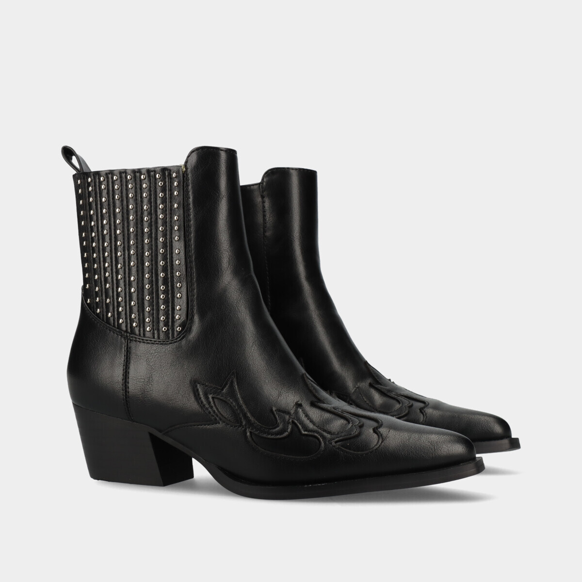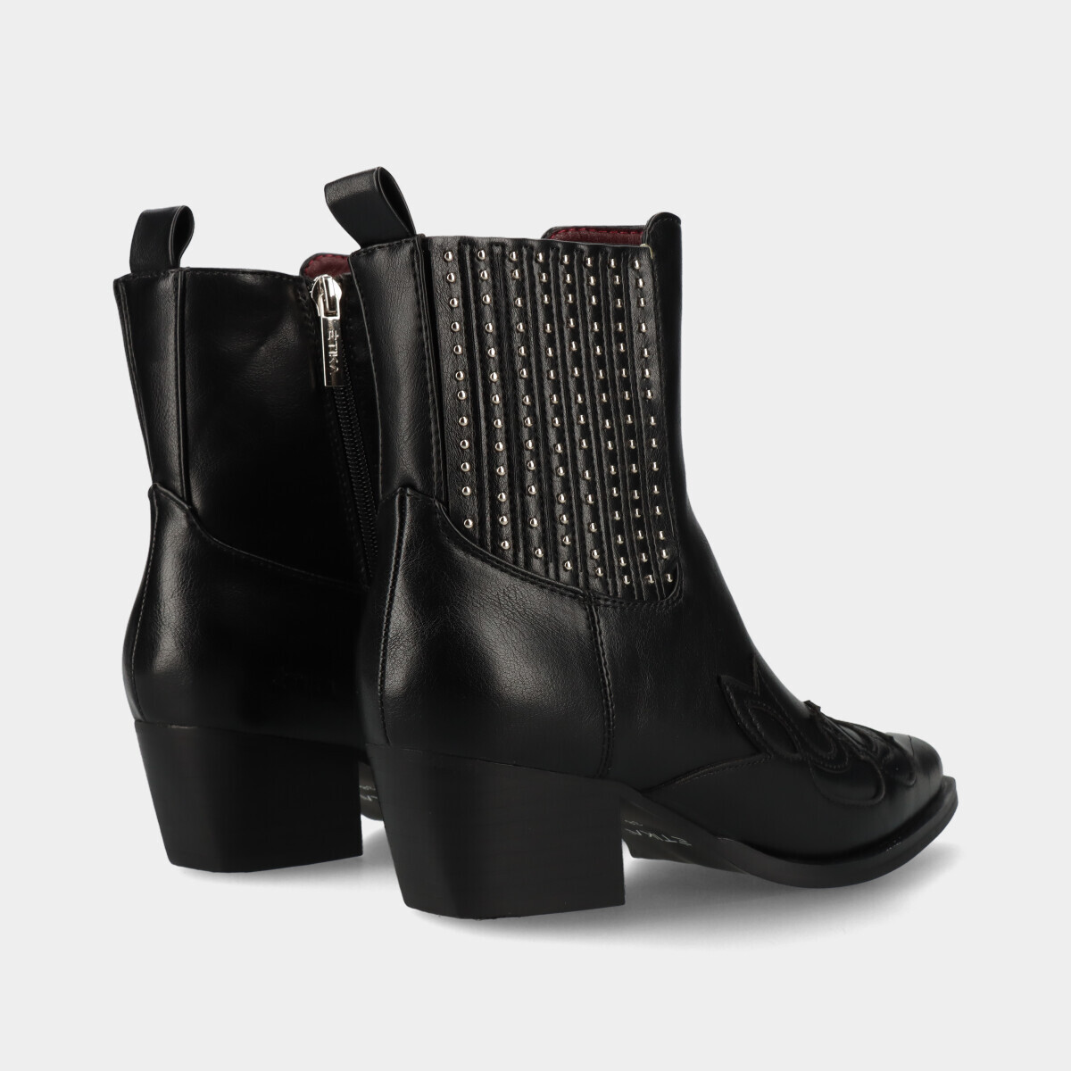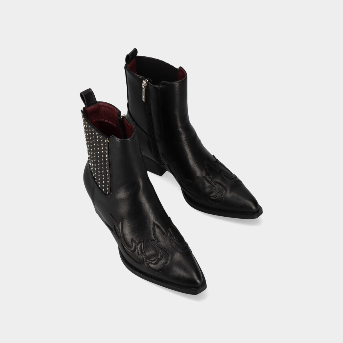Botas texanas em preto para mulher, com efeito pele e tachas prateadas. Elástico na lateral e fecho interior que facilita o calçar e palmilha de espuma para maior conforto.