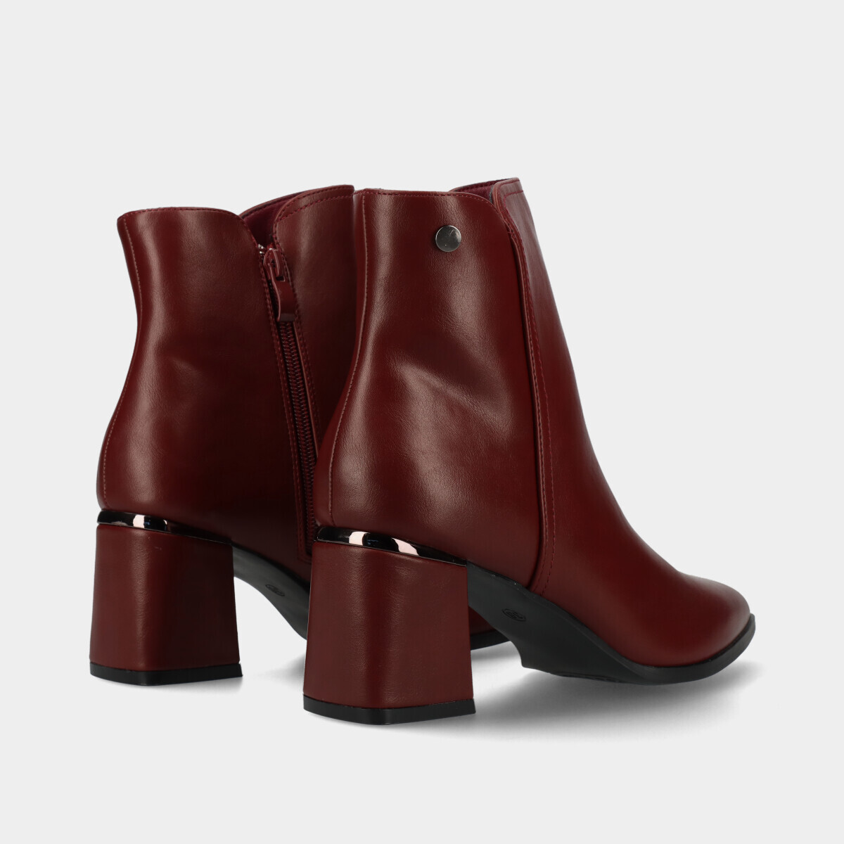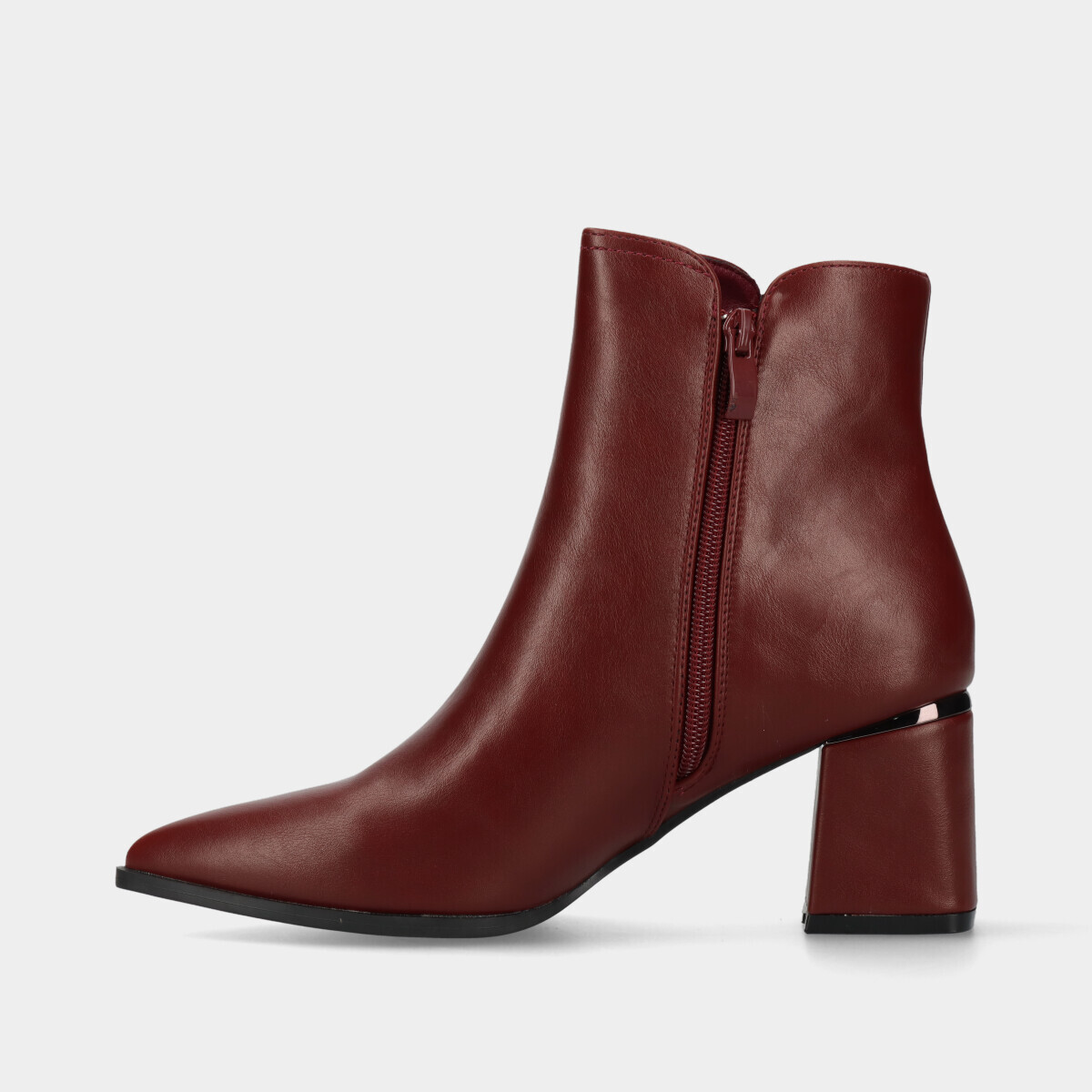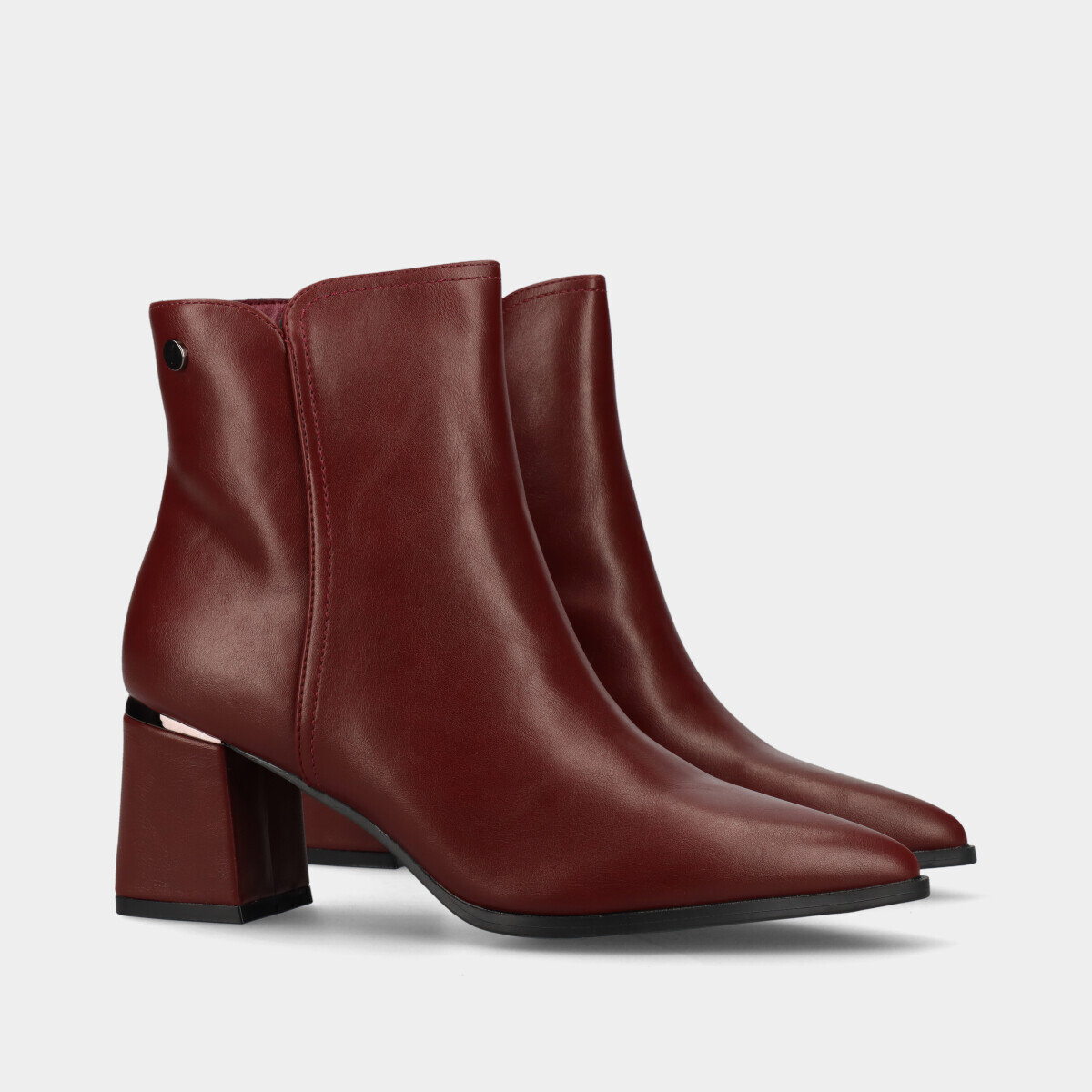 Botim de salto médio para mulher em bordô, com efeito pele e fecho prático na lateral.