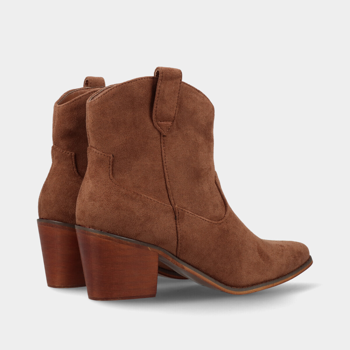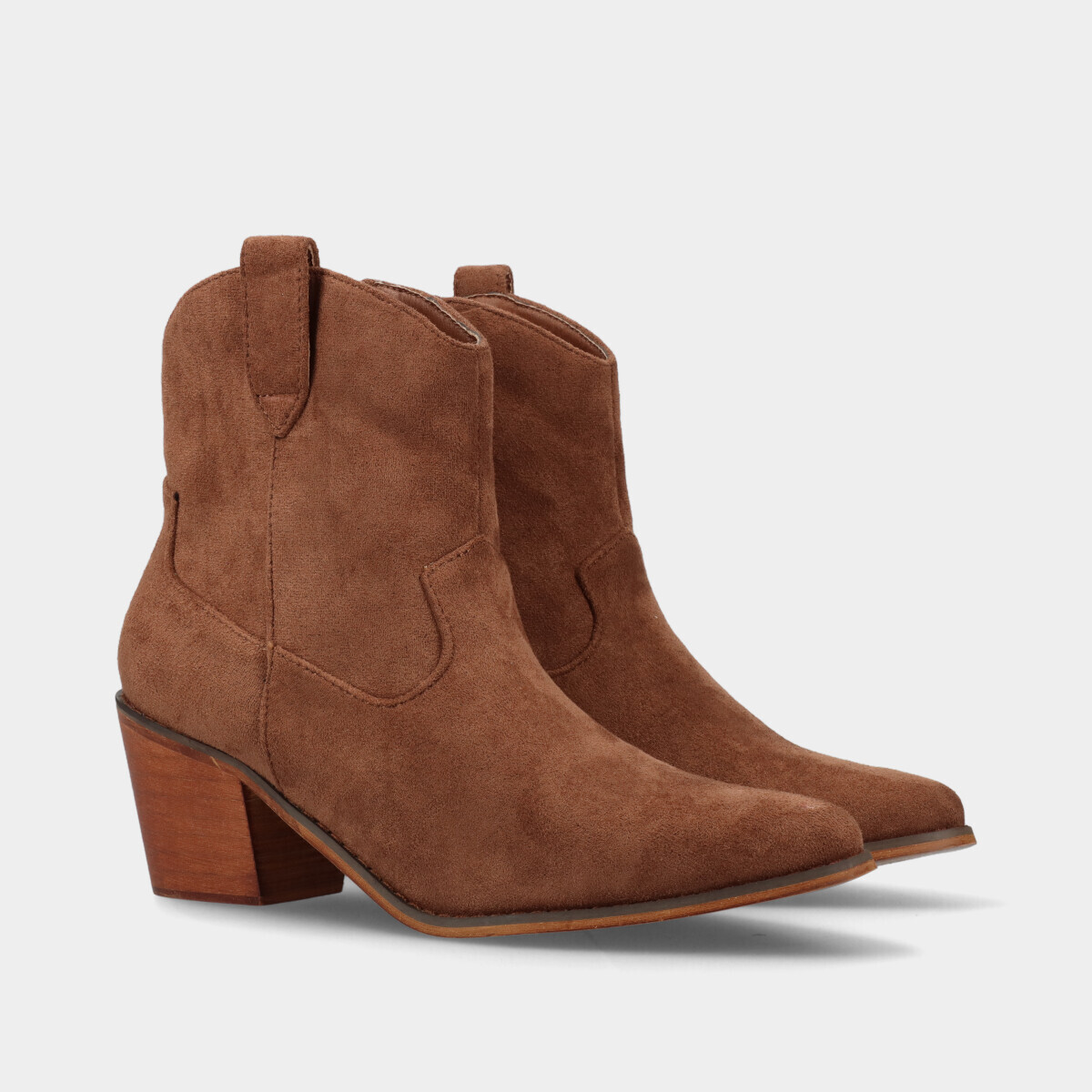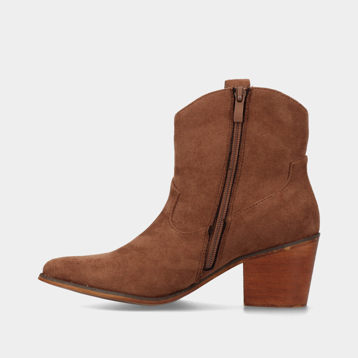 Botas texanas na cor castanha com efeito camurça. Fecho interior que facilita o calçar e tacão em bloco para maior conforto.