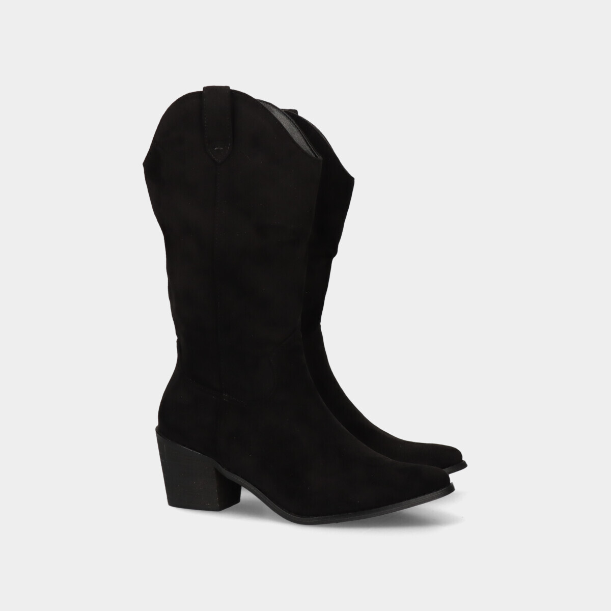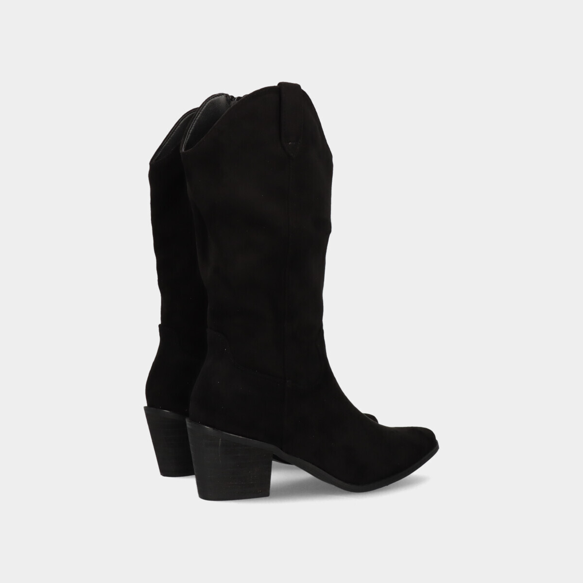 Botas texanas na cor preta, de cano alto com efeito camurça. Fecho interior que facilita o calçar e tacão médio para maior conforto.