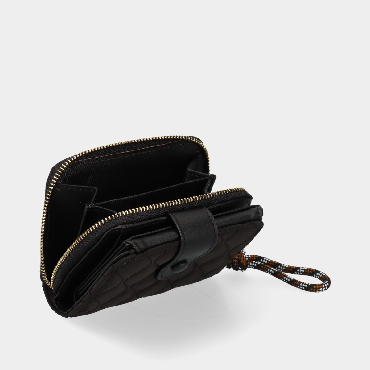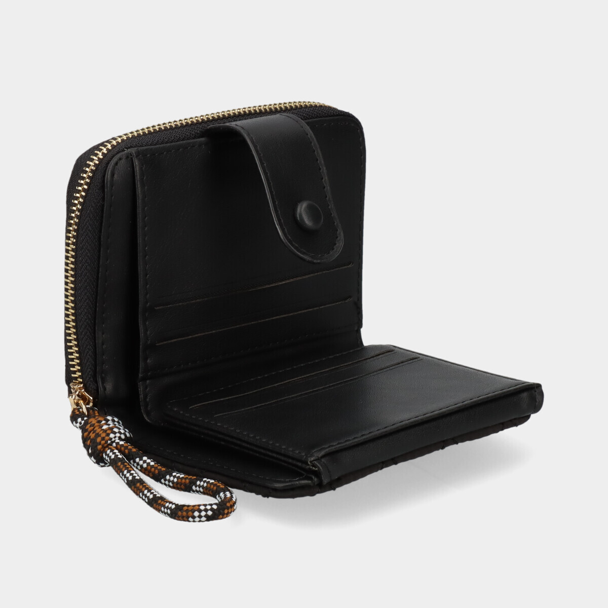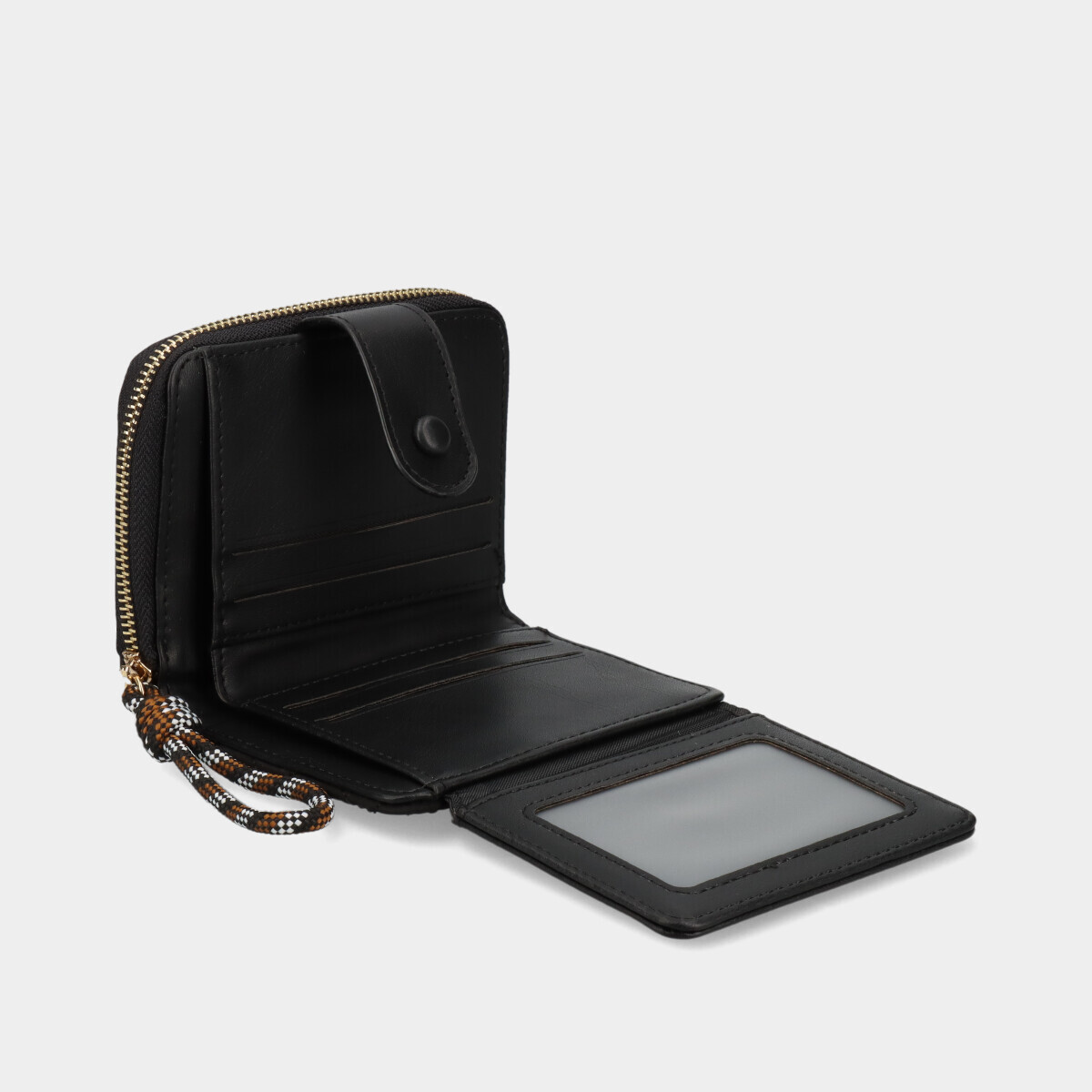 Carteira pequena preta para mulher, com várias ranhuras para cartões e notas, e compartimento com fecho de correr para moedas. Prática e compacta, ideal para o dia a dia ou para levar em malas pequenas.