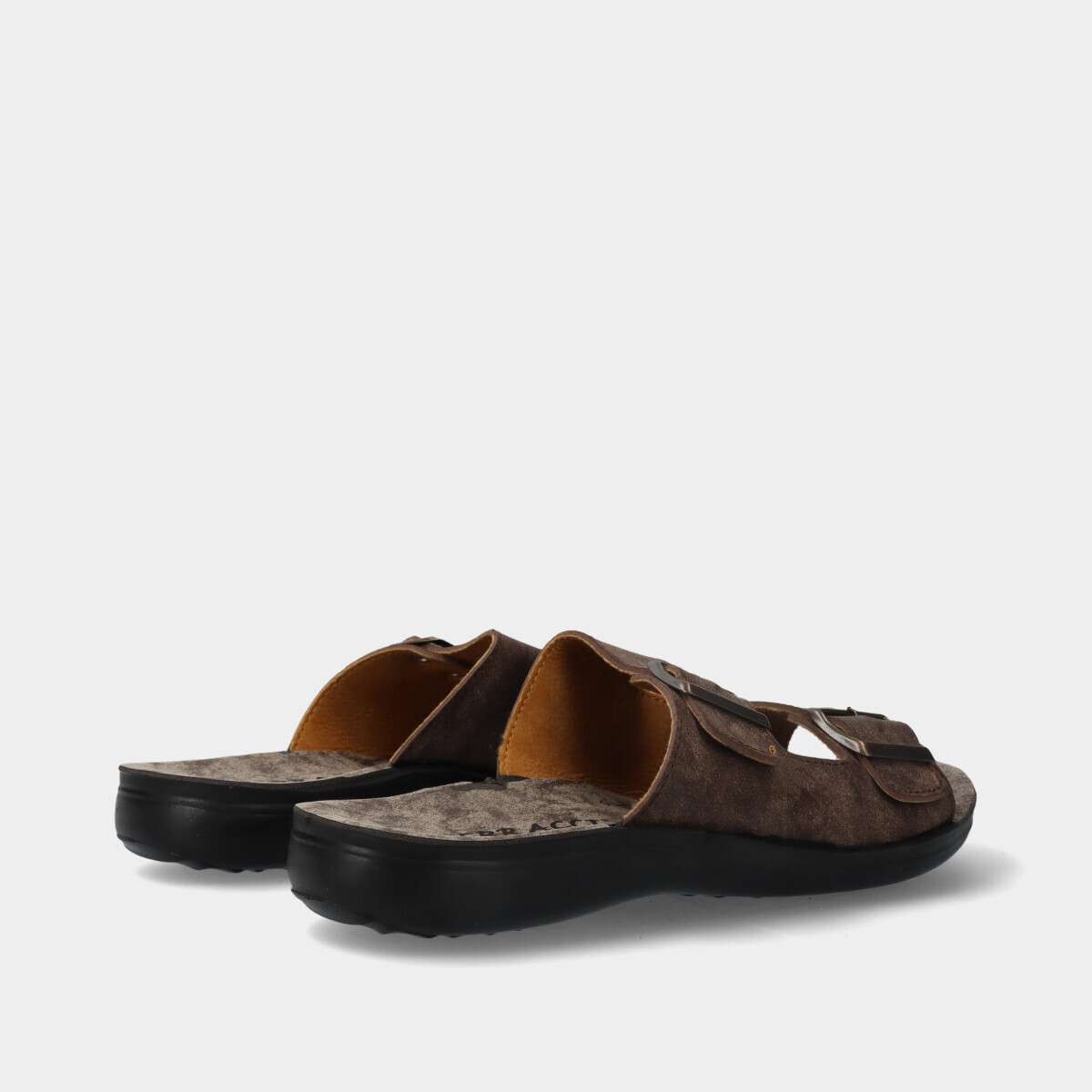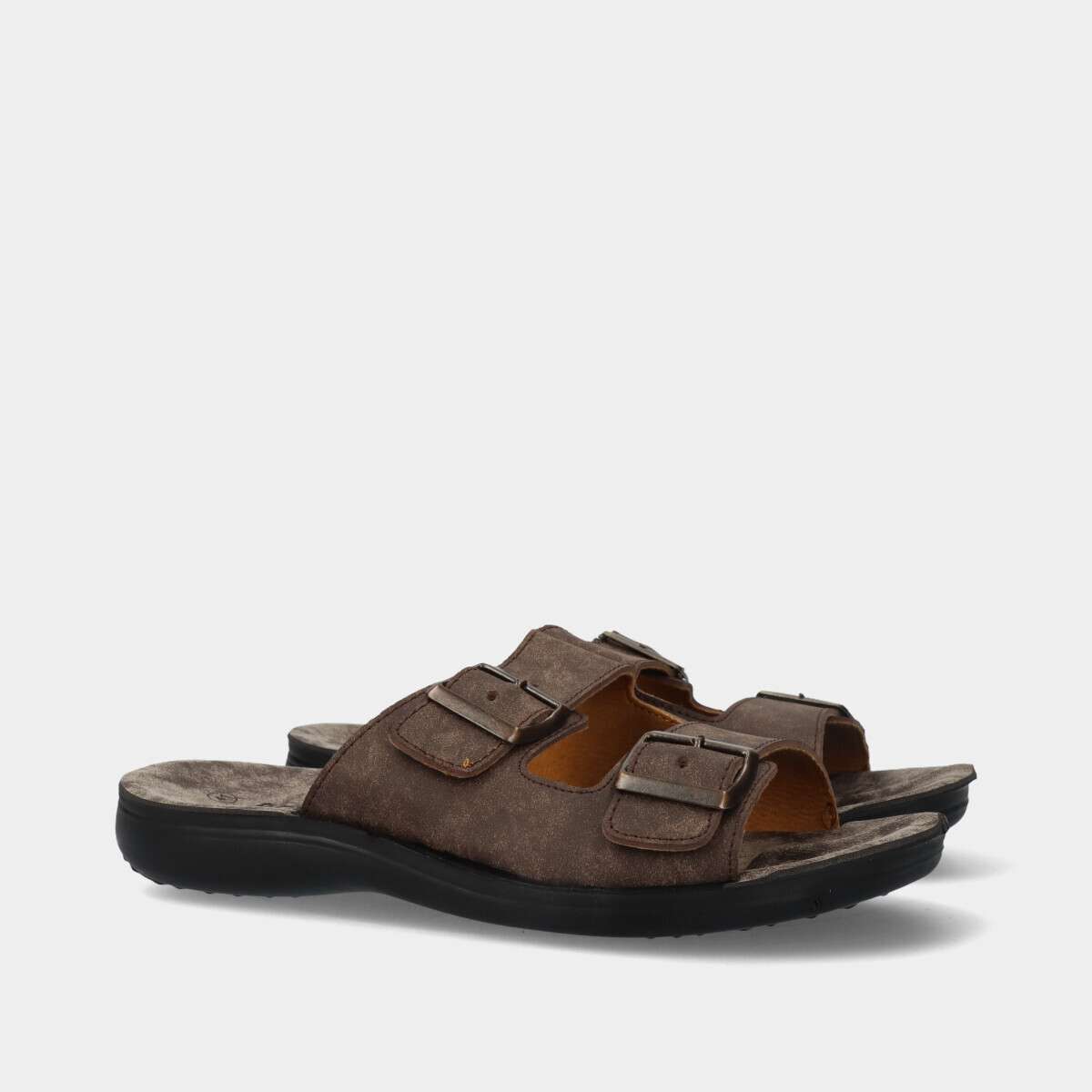 Chinelo de homem na cor castanha com fivelas para fácil ajuste.