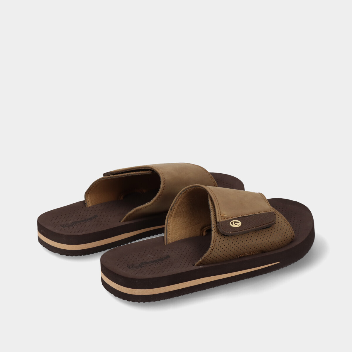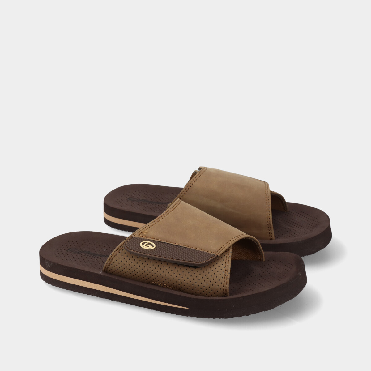 Chinelo de pala para homem, na cor castanha, com velcro ajustável. Leve, confortável e antiderrapante, ideal para usar na piscina, praia ou no dia a dia.