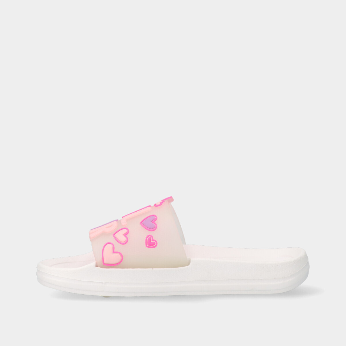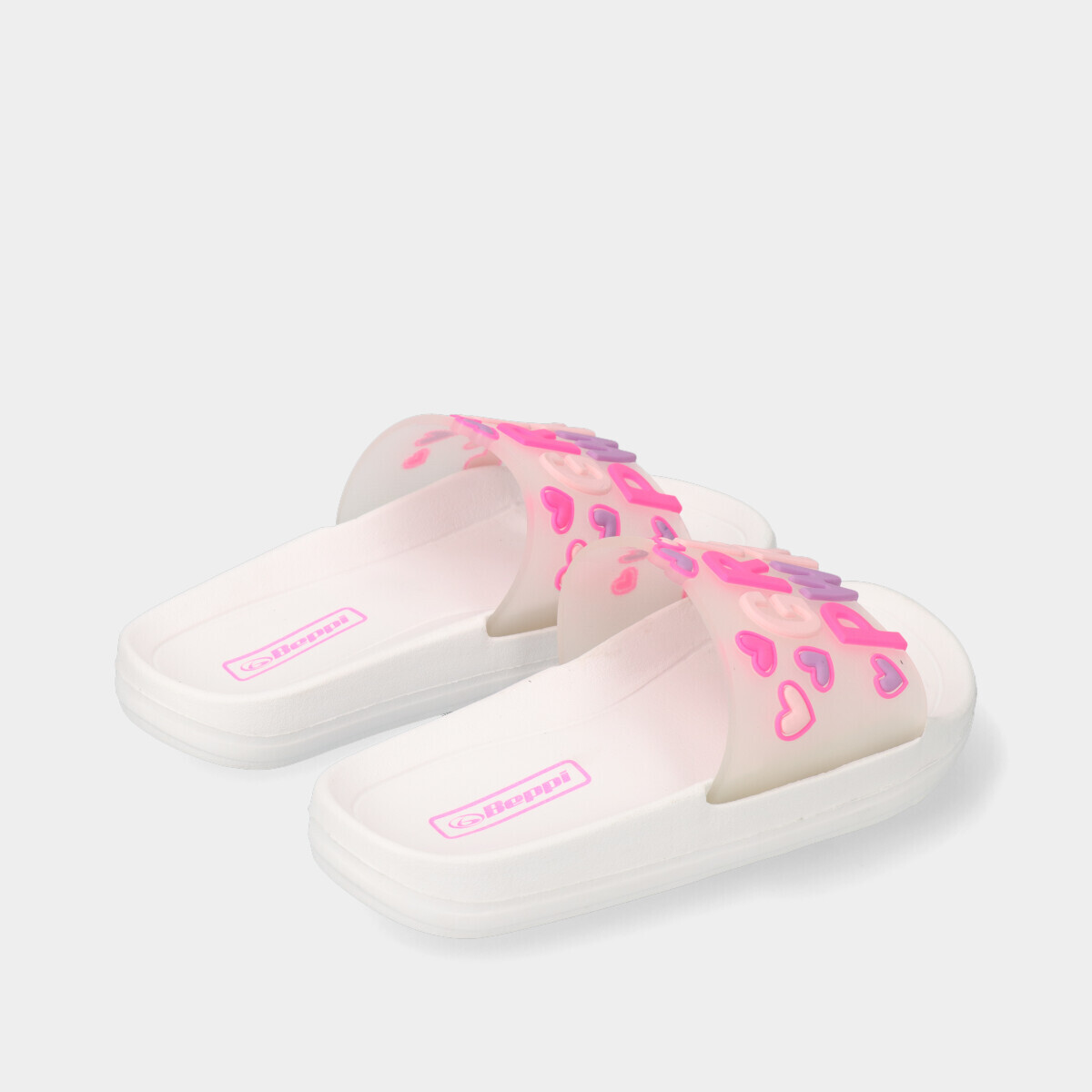 Chinelo antiderrapante, antibacteriano, lavável, leve e confortável. Para menina na cor branca, com divertido tema Girl Power na pala de efeito translúcido.