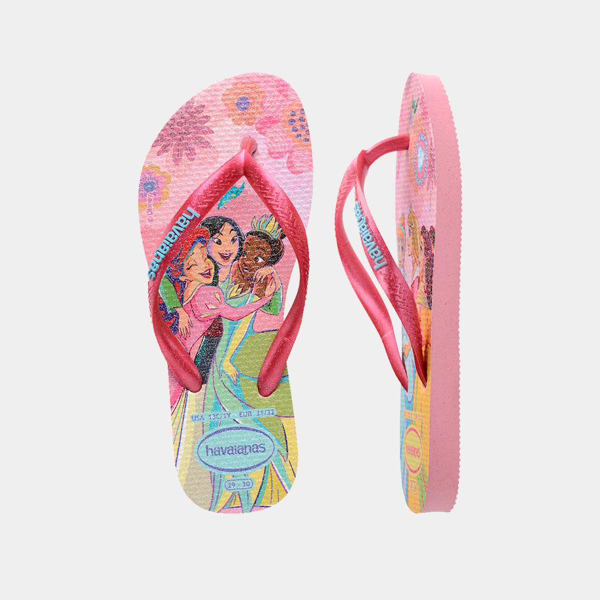 Havaianas Kids rosa com as Princesas da Disney, ideais para crianças. Conforto, leveza e o universo Disney em cada passo.