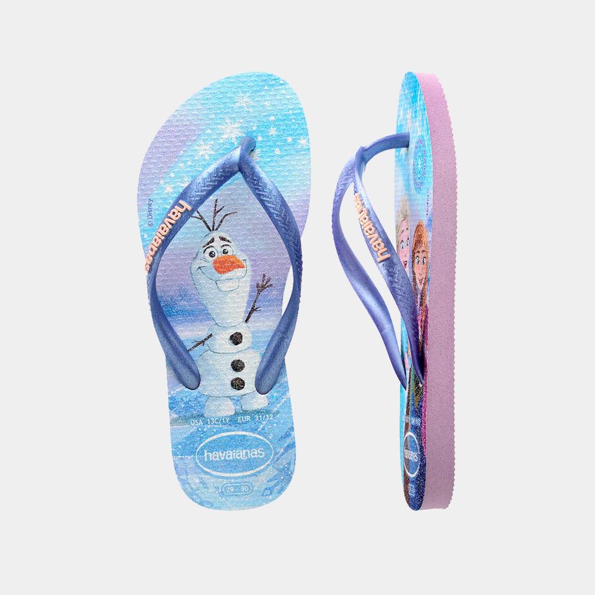 Havaianas Kids lilás com Elsa, Anna e Olaf da Disney, ideais para crianças. Conforto, leveza e o universo Disney em cada passo.