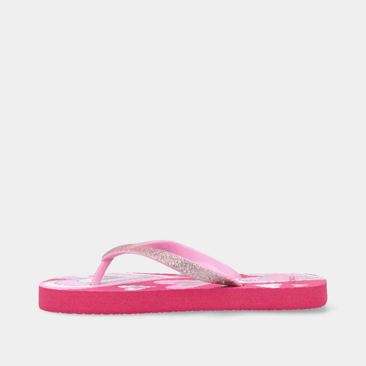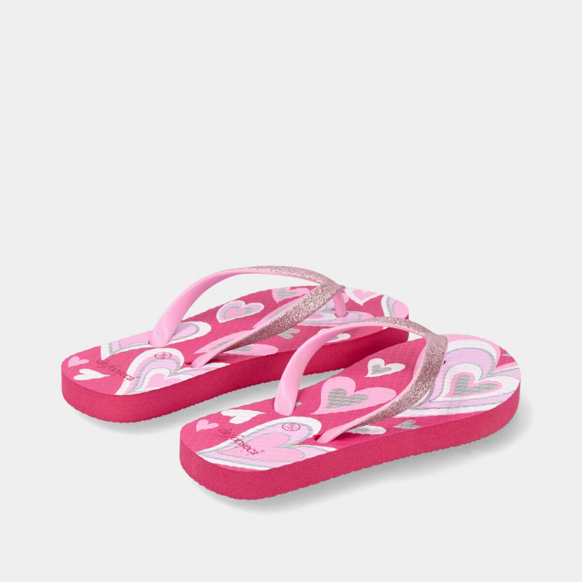 Chinelo infantil de menina na cor fúcsia, com estampado de corações em rosa, prata e lilás, e tiras com glitter.