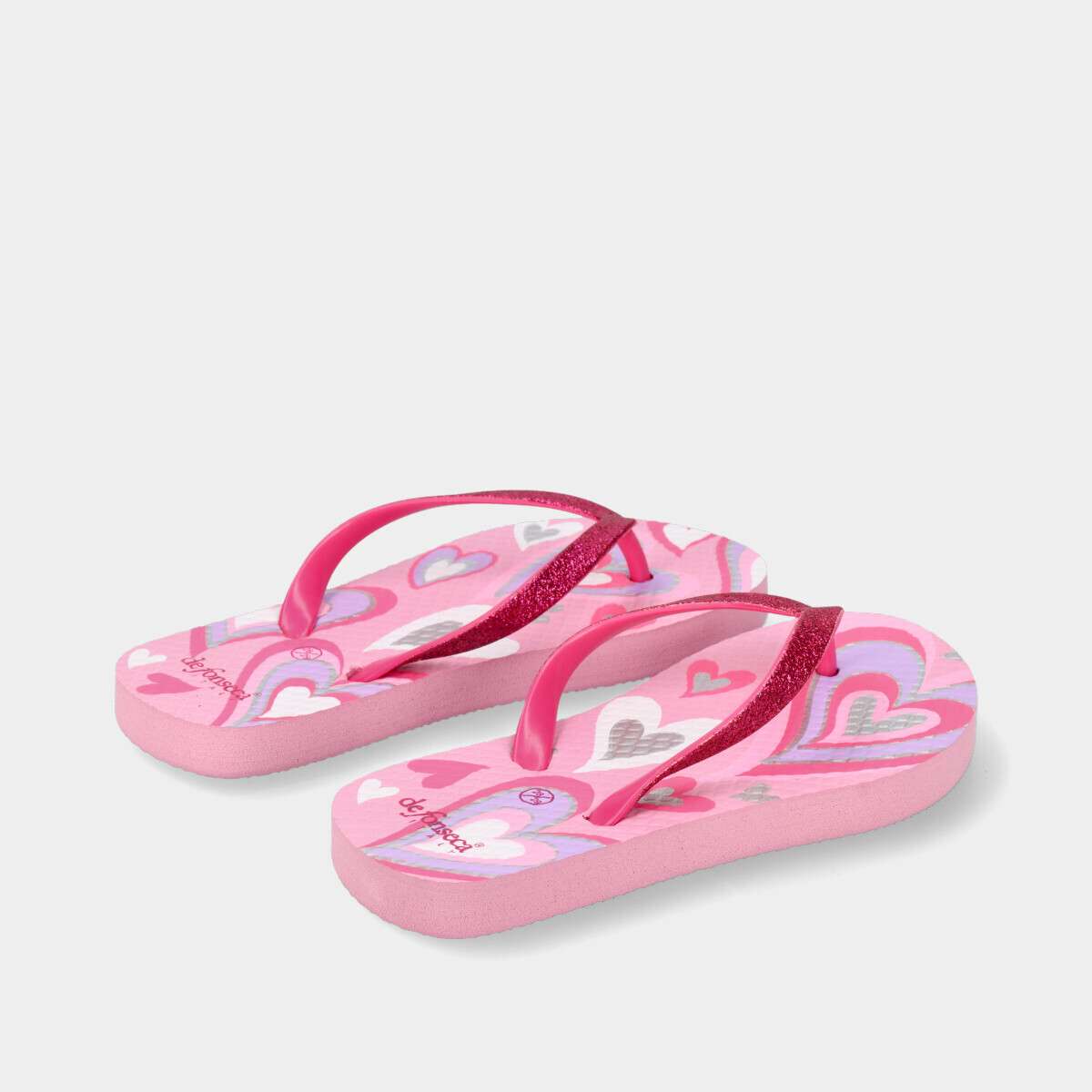 Chinelo infantil de menina na cor rosa, com estampado de corações em fúcsia, prata e lilás, e tiras com glitter fúcsia.