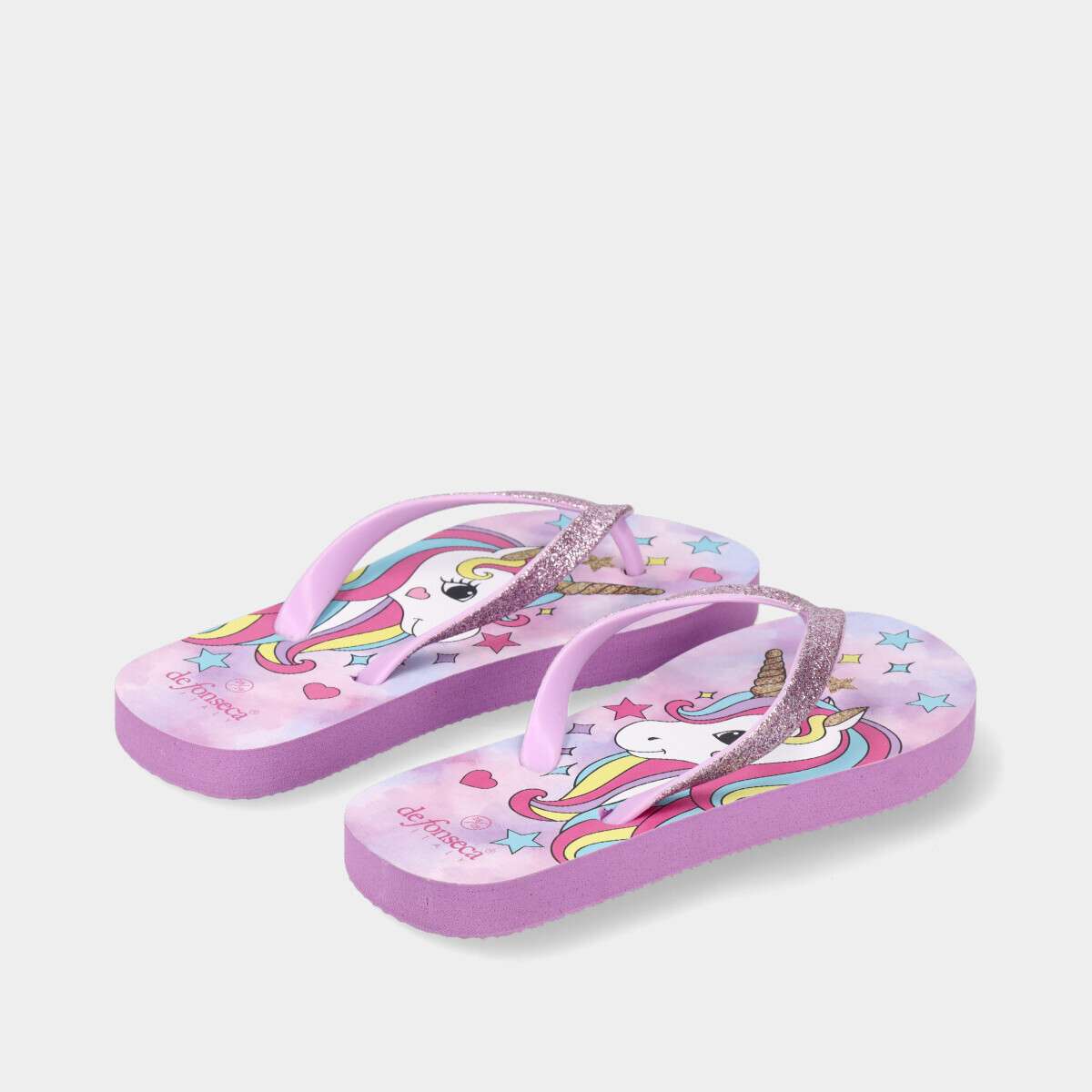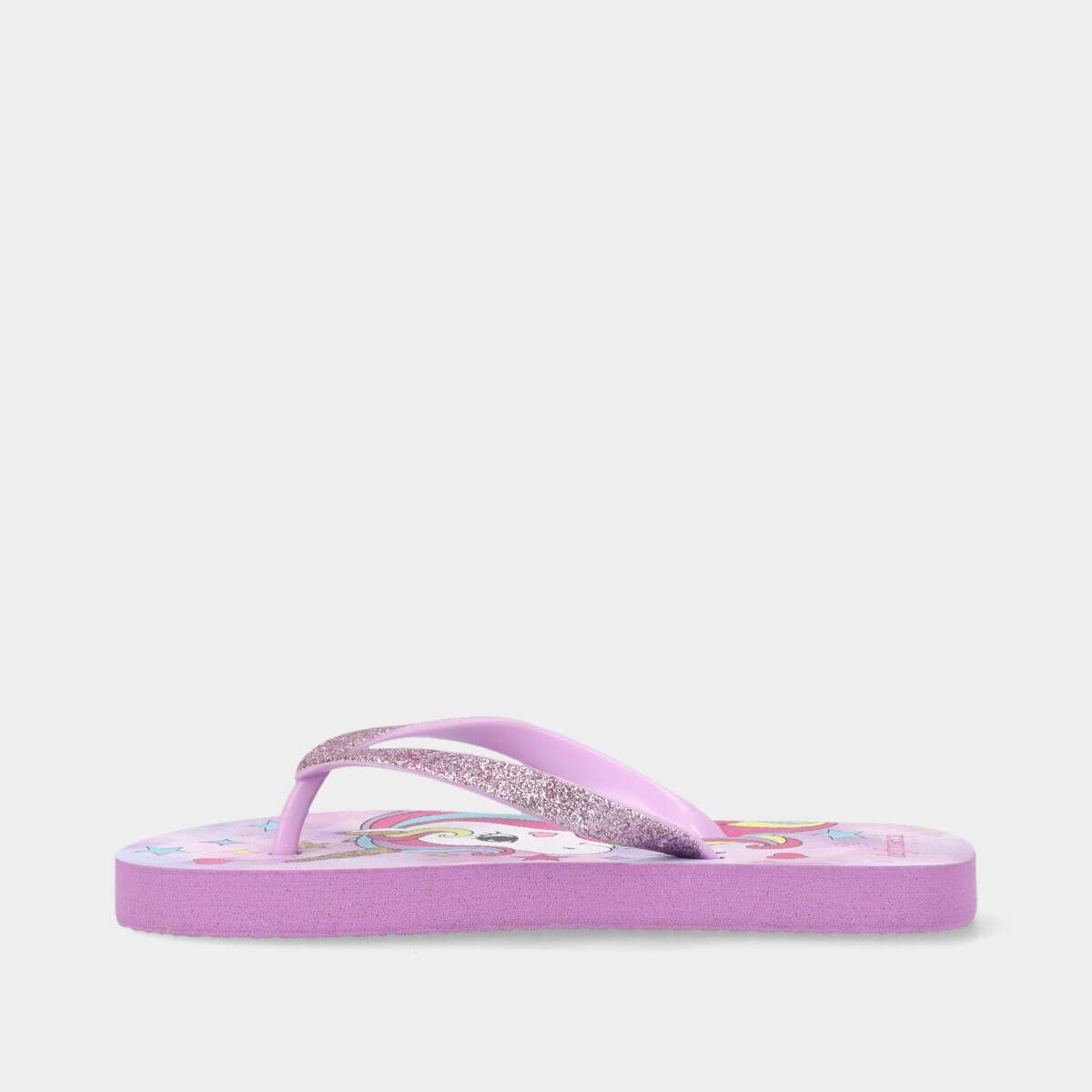Chinelo infantil lilás para menina, com estampado de unicórnio e tiras em glitter.