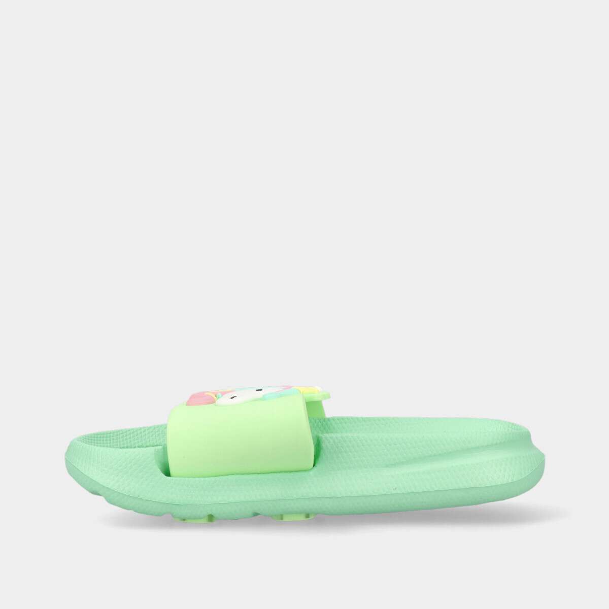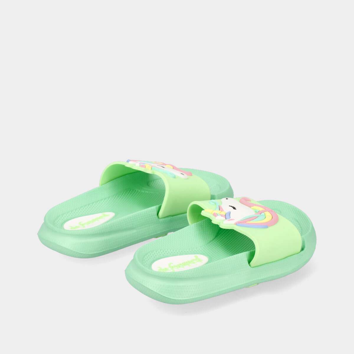 Chinelo infantil verde para menina, leve e confortável, com estampado de unicórnio.
