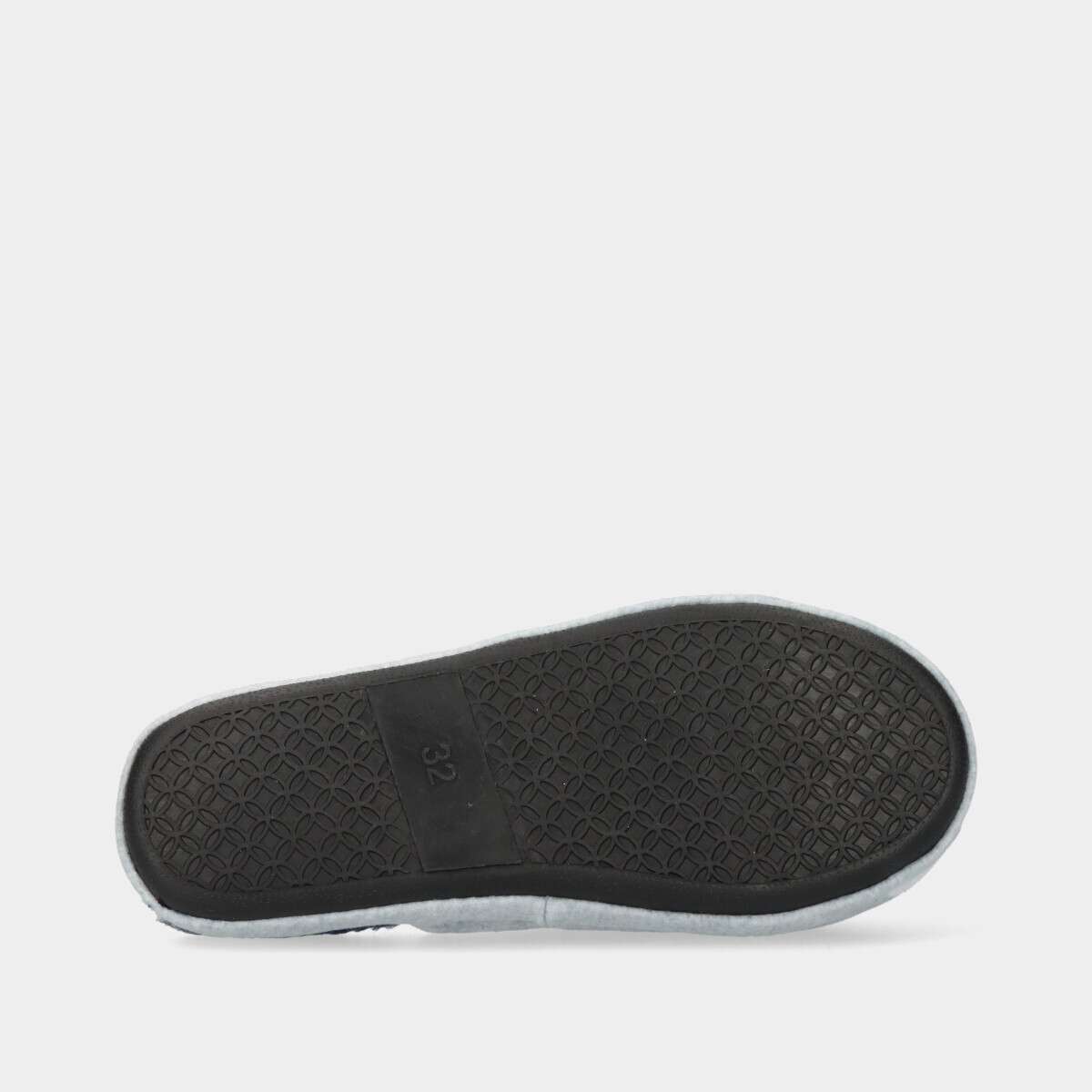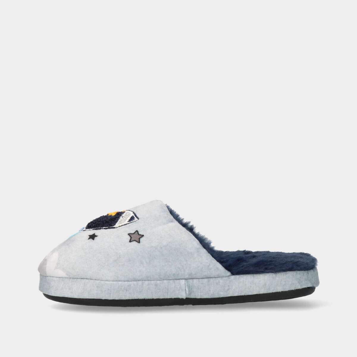 Chinelo na cor cinza com tema de foguetão, forro quente de pelo azul e sola antiderrapante.