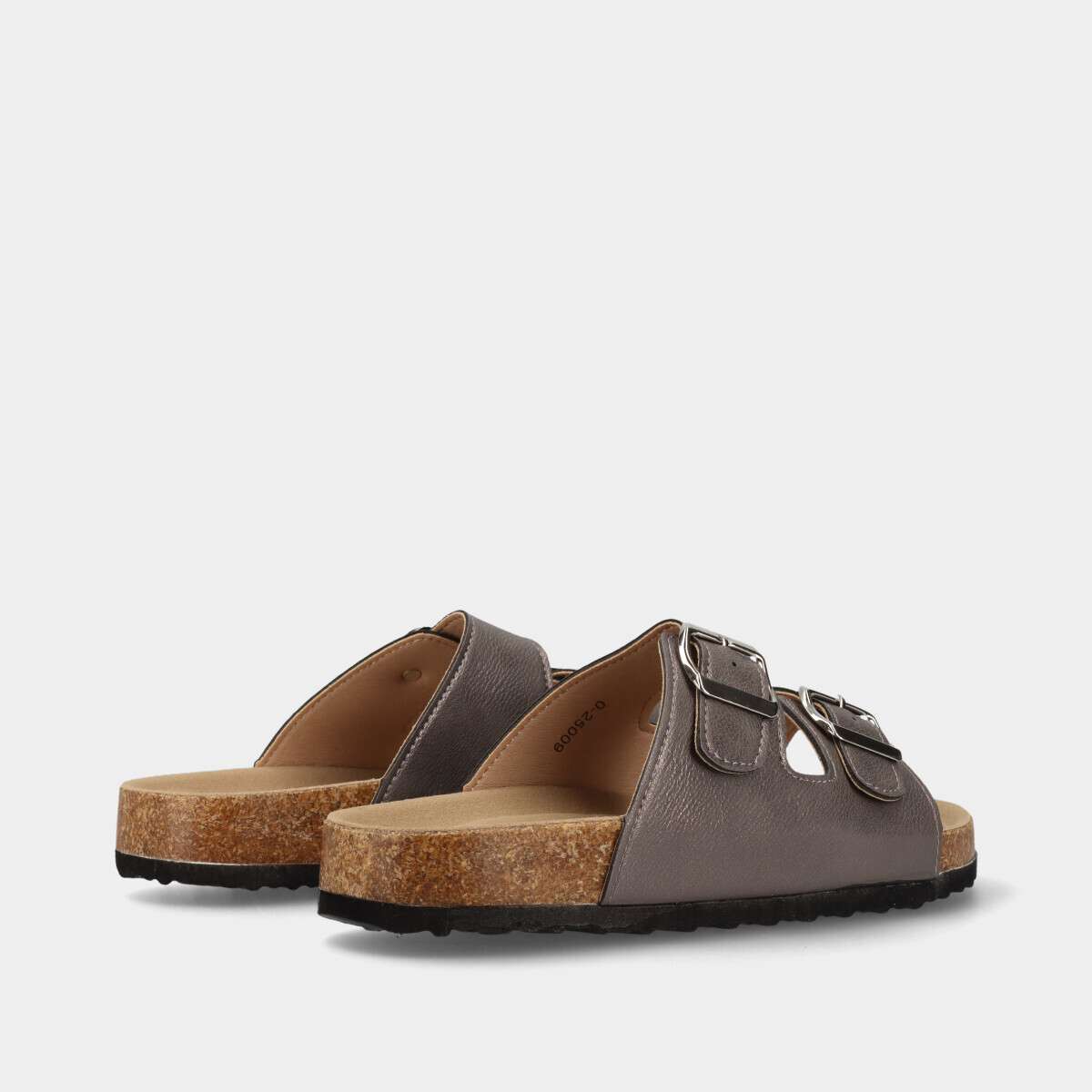 Chinelo anatómico na cor cinza com duas fivelas, palmilha macia e confortável.