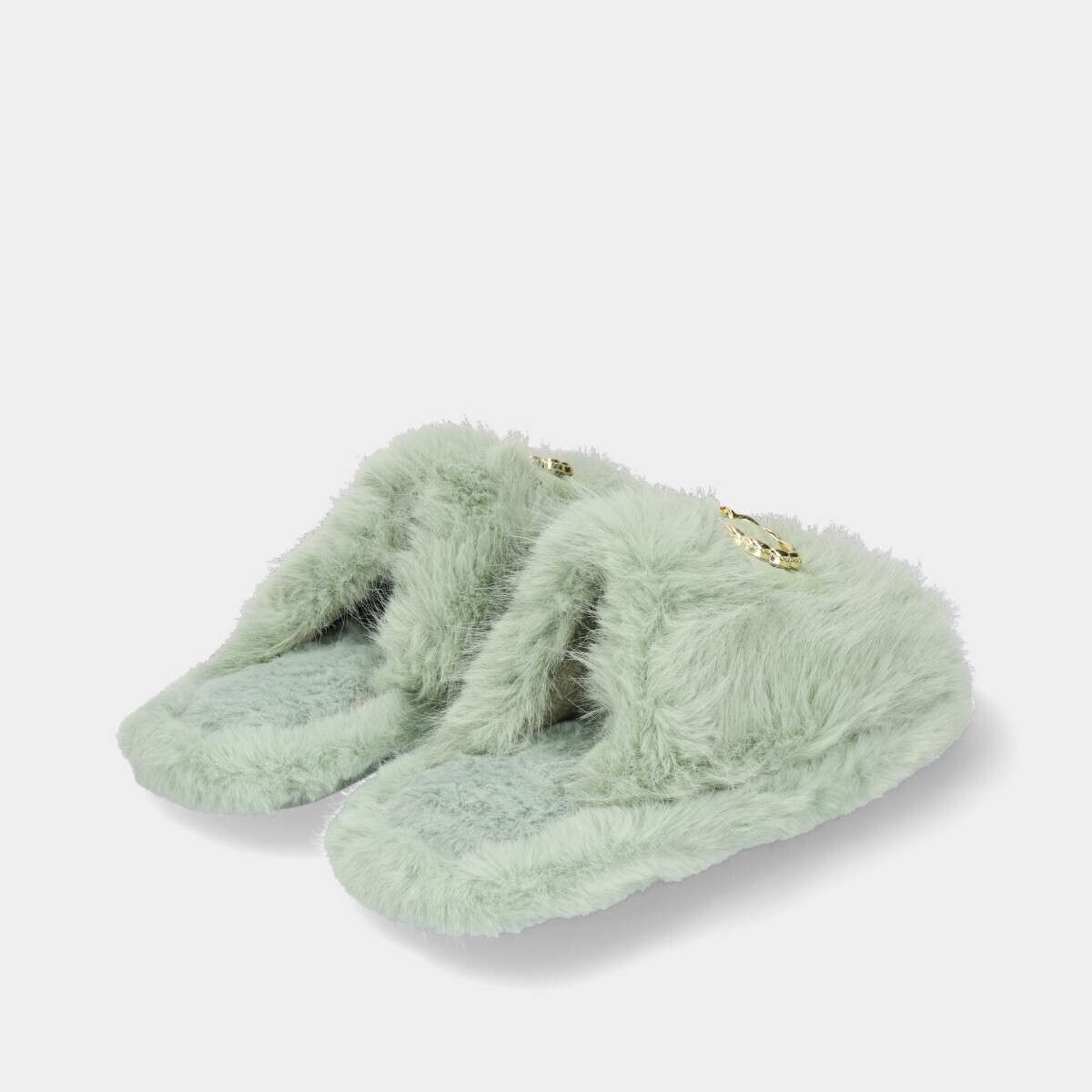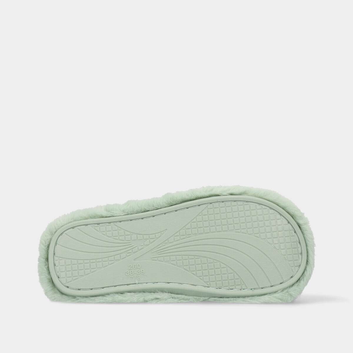Chinelo todo em pelo na cor verde com sola de borracha.