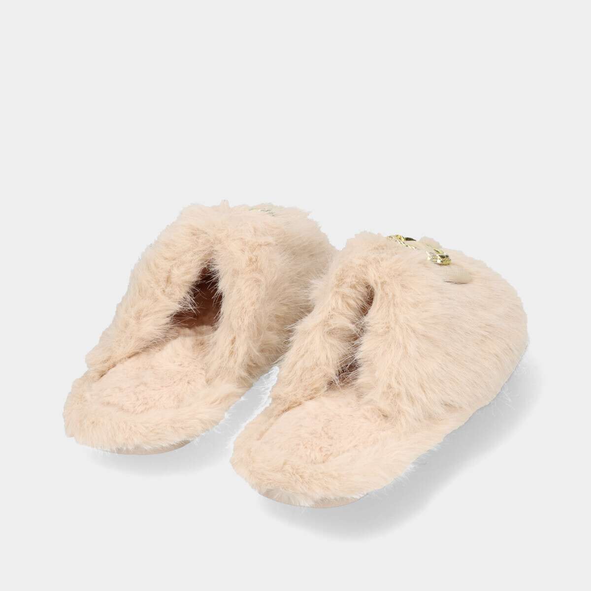 Chinelo bege todo em pelo com aplicação dourada.